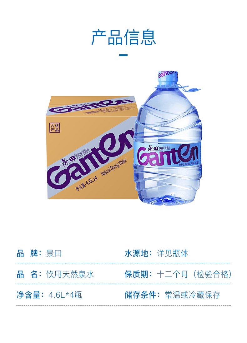景田 饮用天然泉水 大瓶装水 4.6L*4瓶 整箱装 家庭健康饮用水