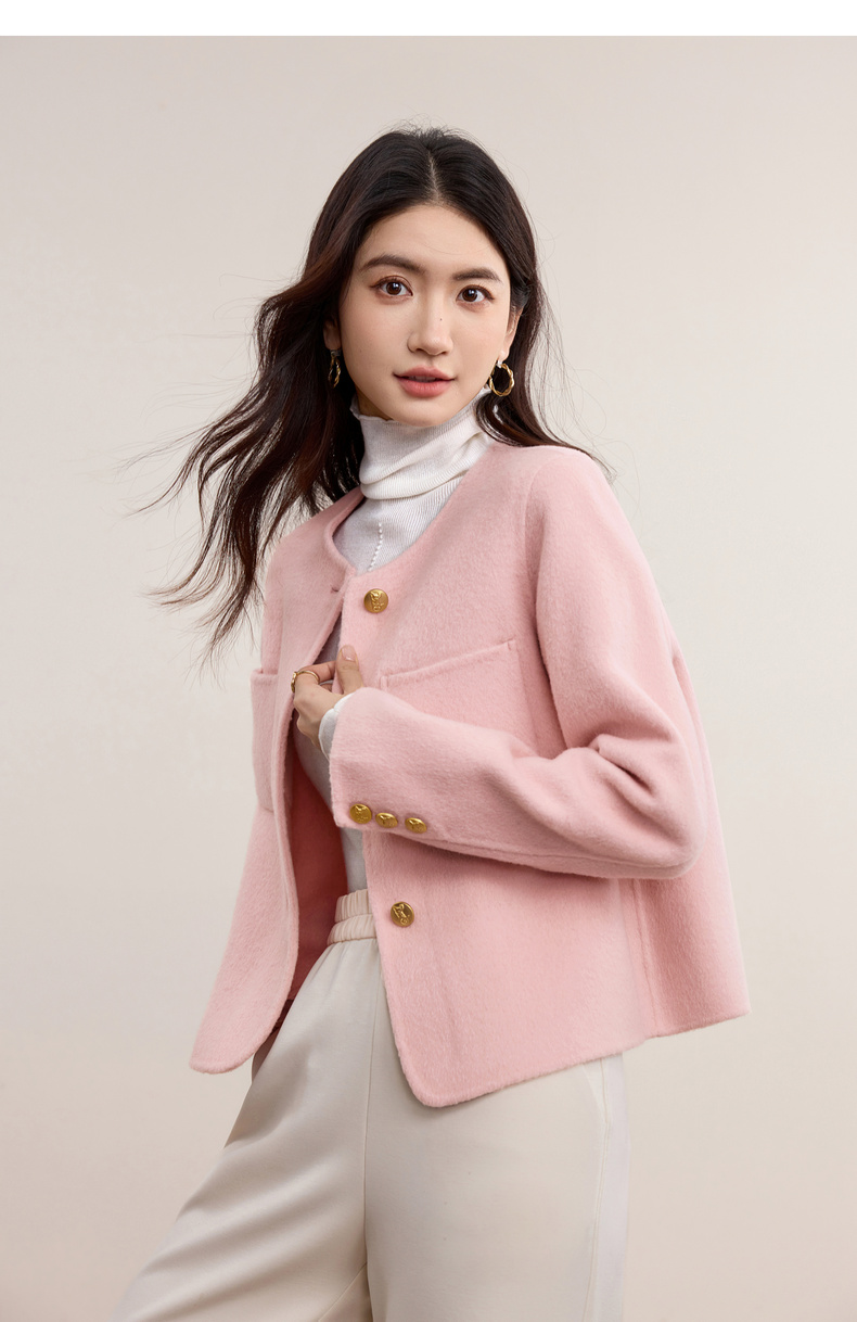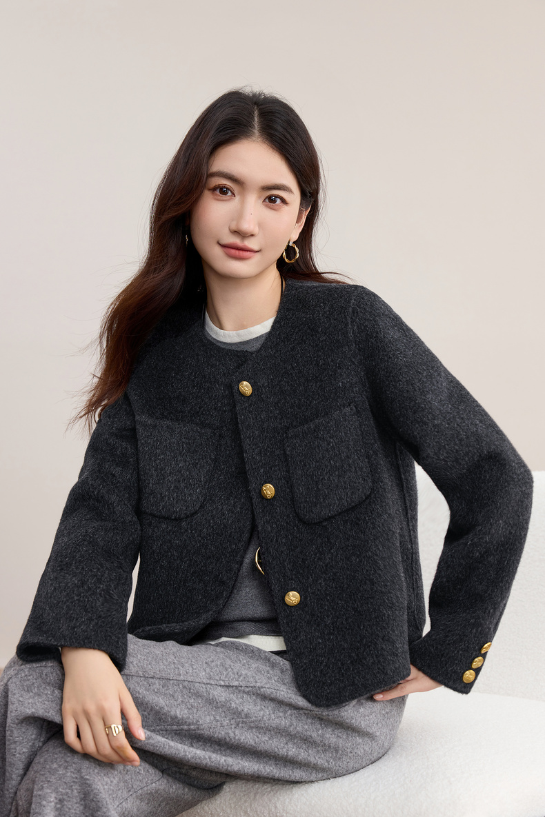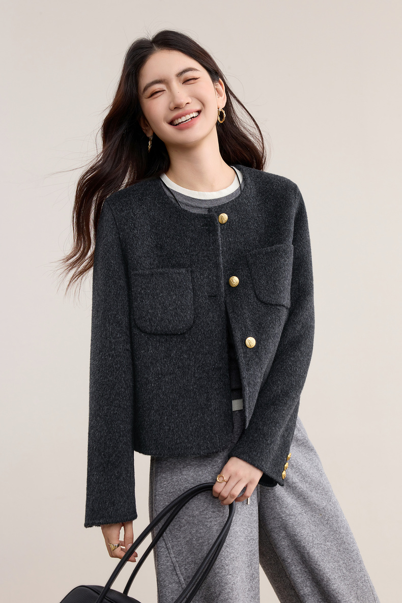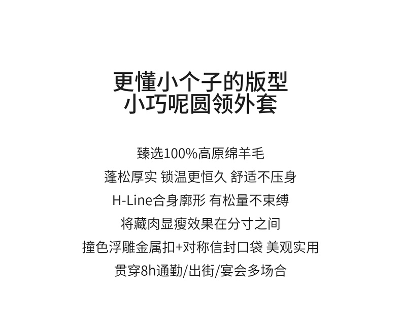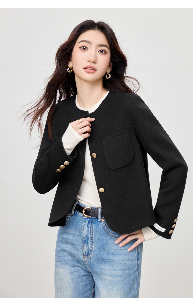 【内购】【100%绵羊毛】小个子通勤圆领金属扣合身保暖厚双面呢外套-W54OG3300X