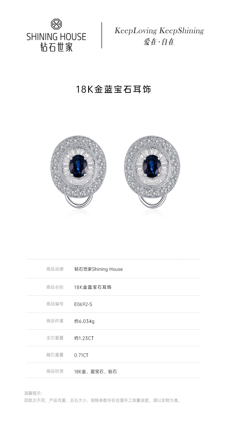 【蓝宝石耳环】钻石世家 18K金蓝宝石镶钻耳饰耳环 每一颗宝石都是大自然的宝物 深邃浓郁的幽兰光芒 丝绒静谧的高雅之美