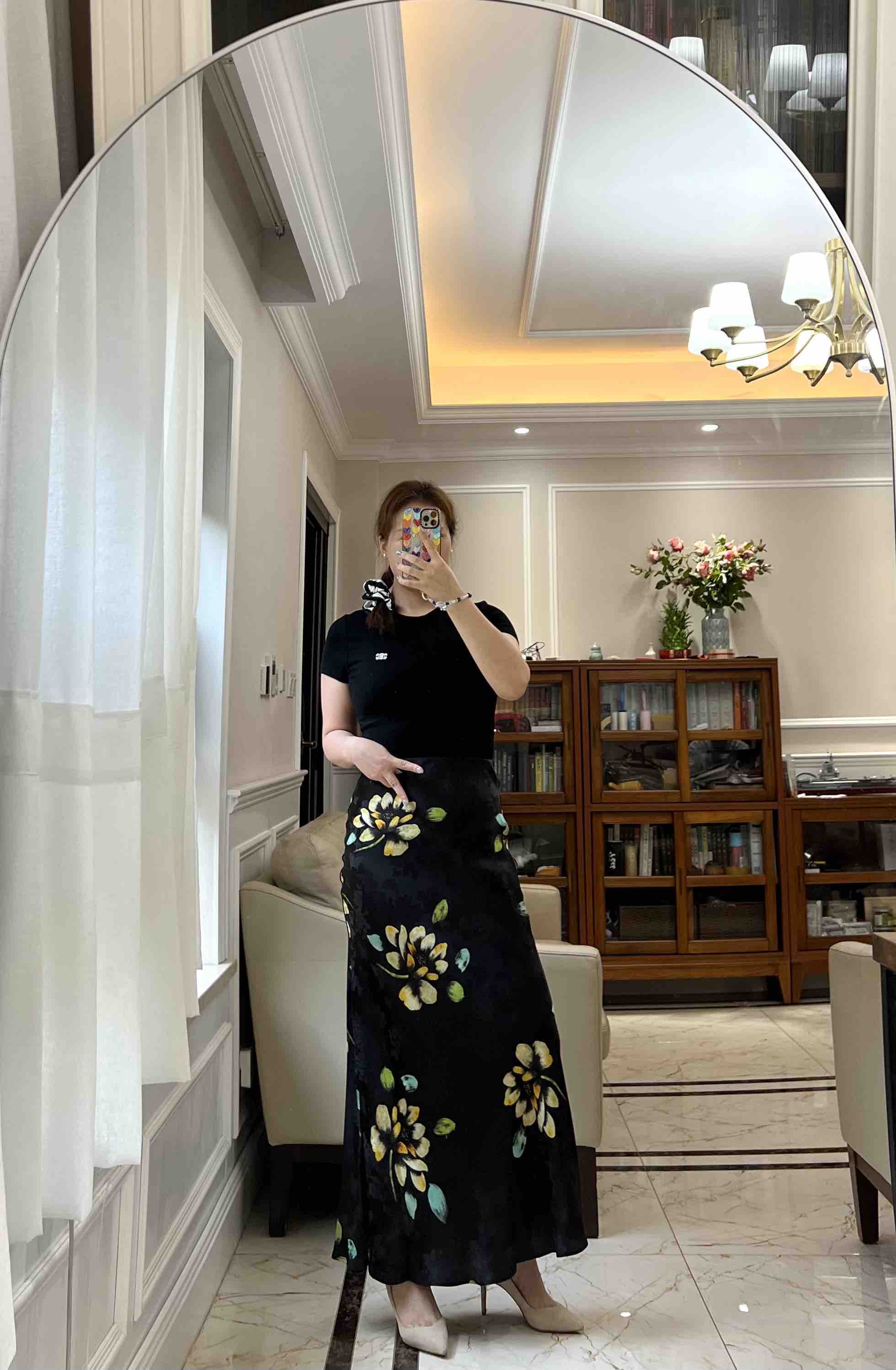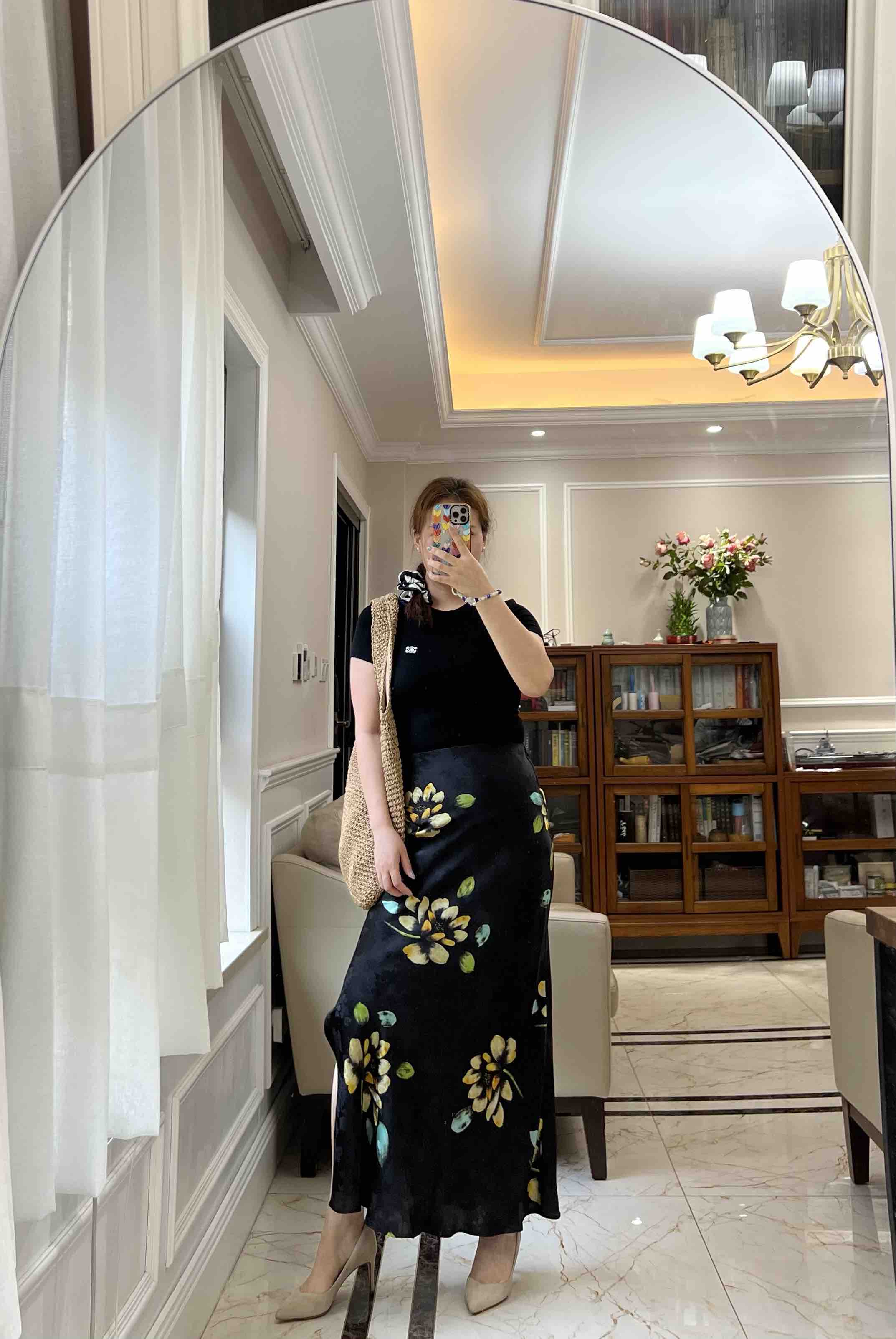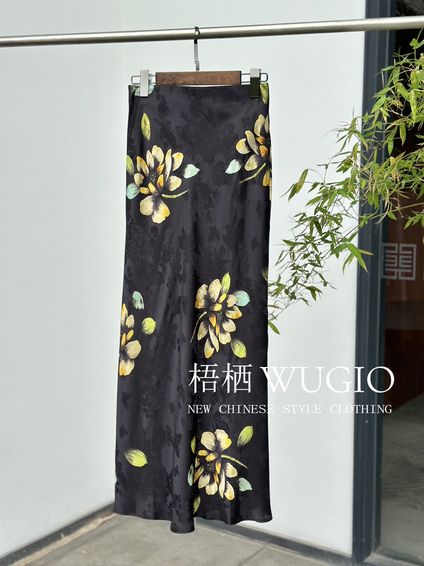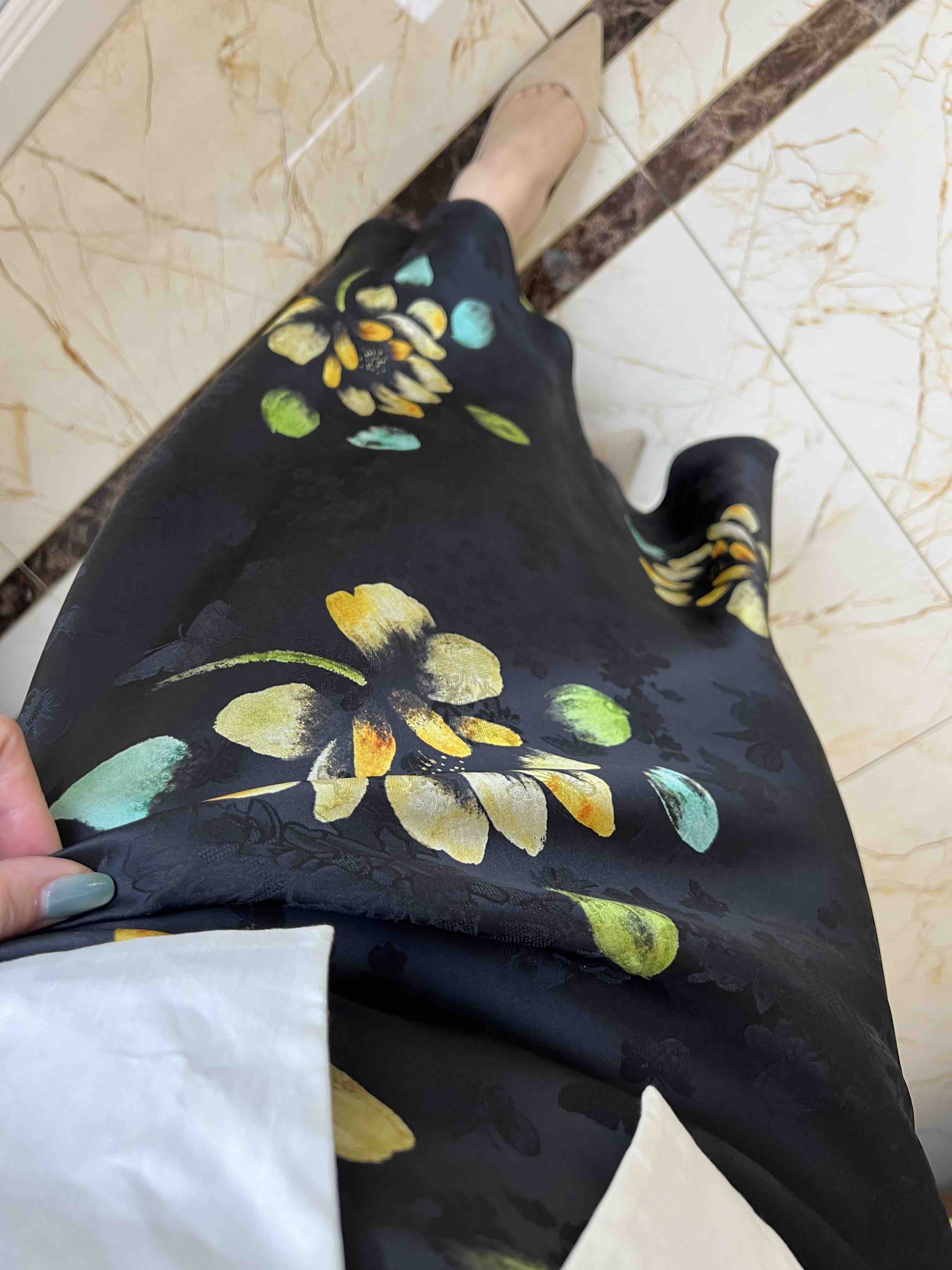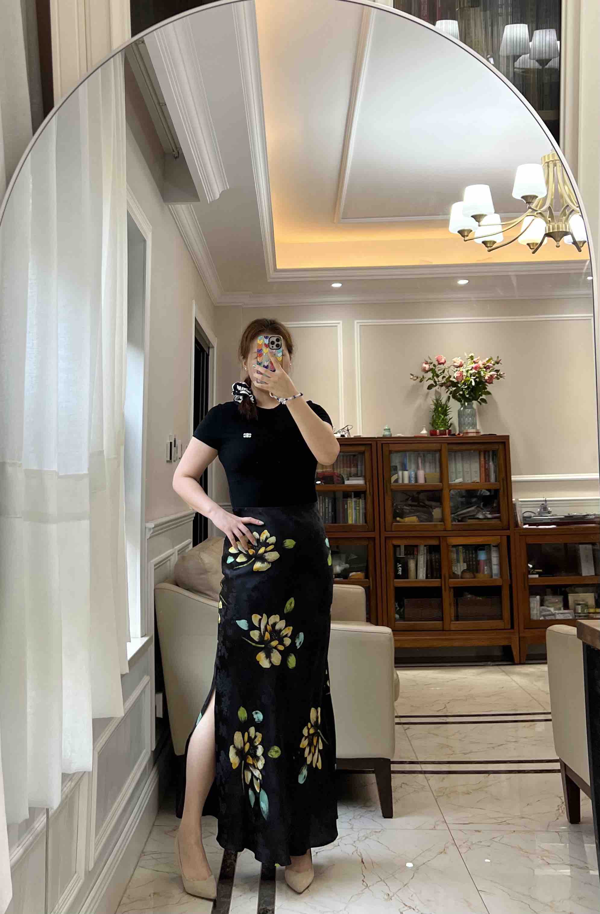 今晚就少刷几个,梧栖太美了,看我实拍足够了,都不用言语。梧栖高端新中式 基础款 夏荷 开衩半身长裙 极少量。材质是百分百人丝,质感觉着有香云纱的小滋味。仔细看,黑色也不是纯黑色,上面蝴蝶莲花,步步生莲。