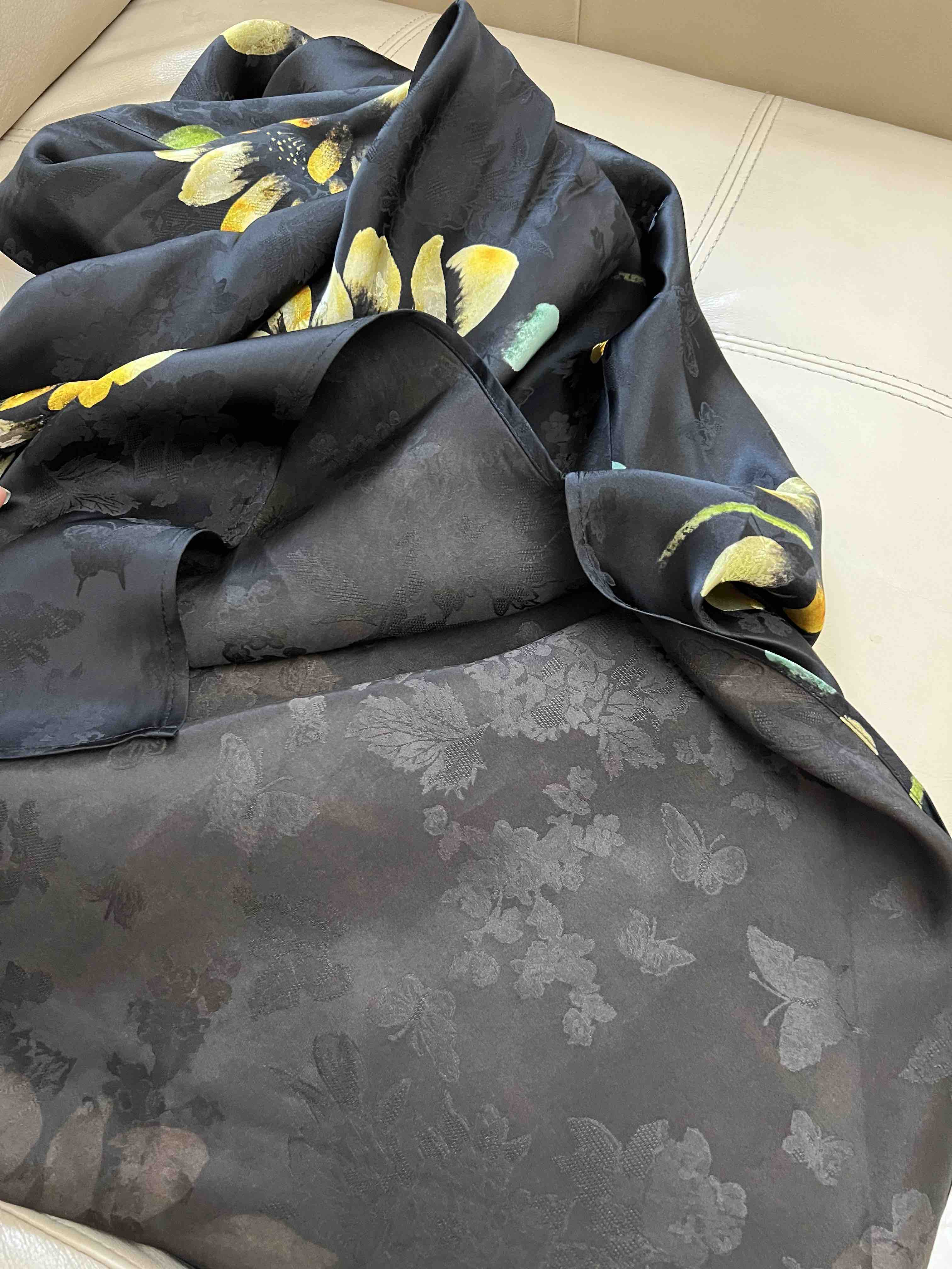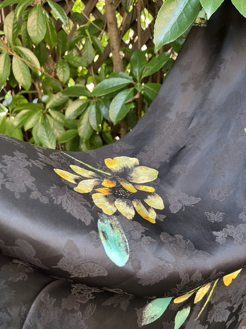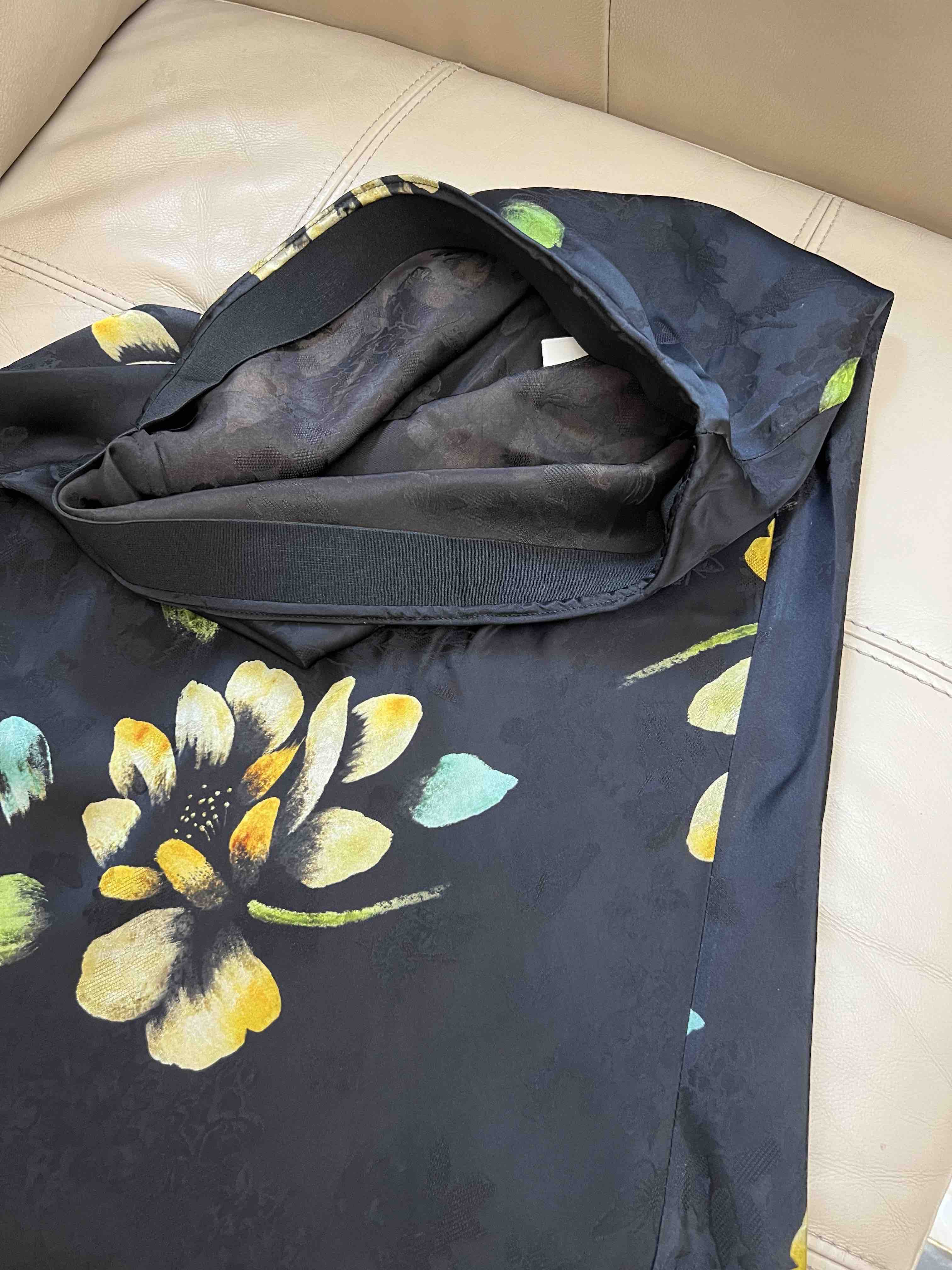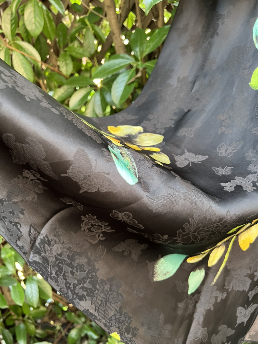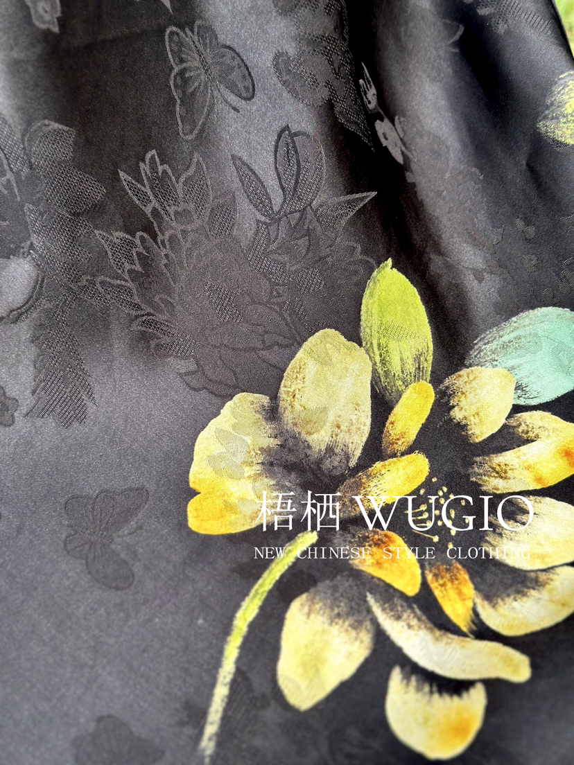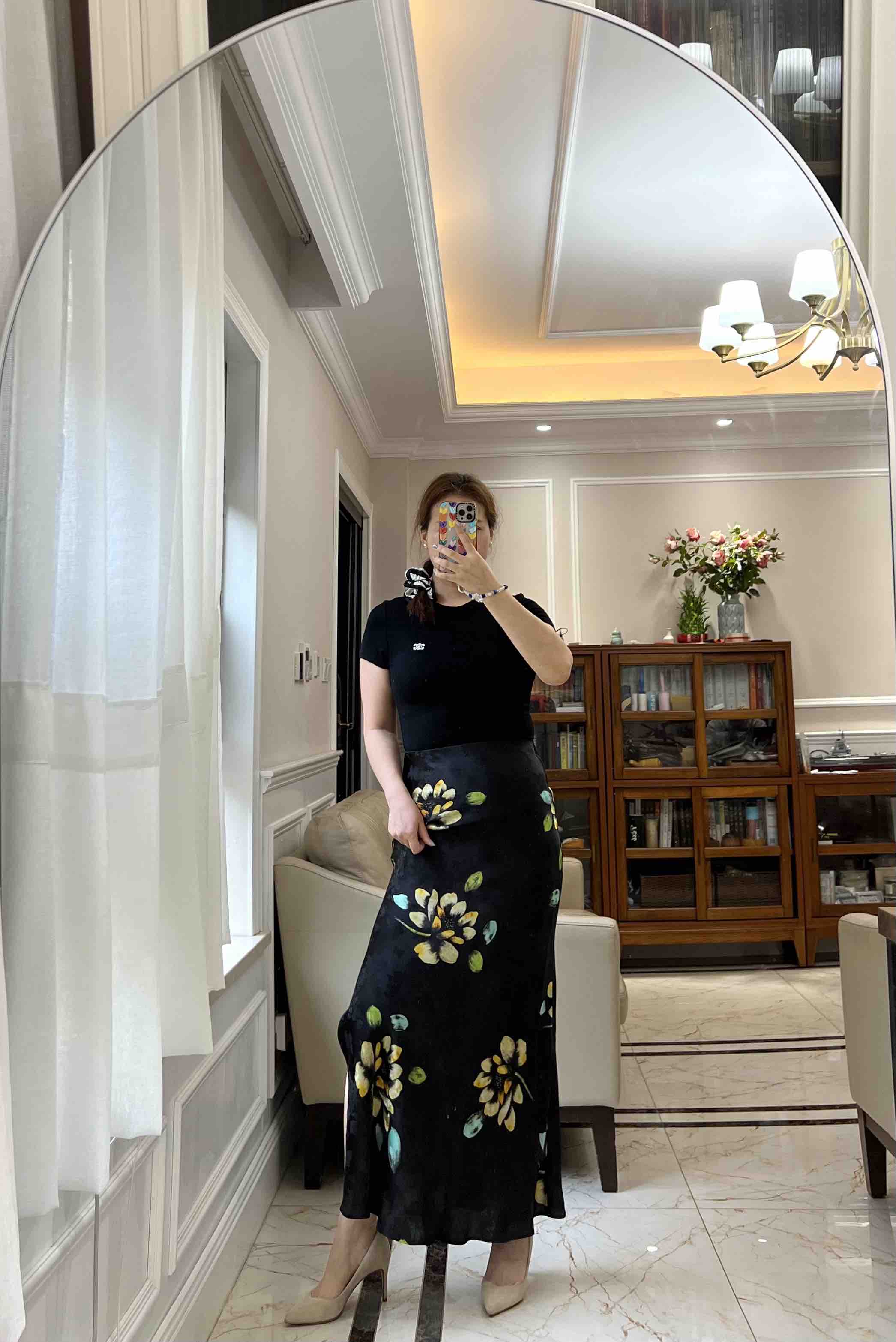 今晚就少刷几个,梧栖太美了,看我实拍足够了,都不用言语。梧栖高端新中式 基础款 夏荷 开衩半身长裙 极少量。材质是百分百人丝,质感觉着有香云纱的小滋味。仔细看,黑色也不是纯黑色,上面蝴蝶莲花,步步生莲。