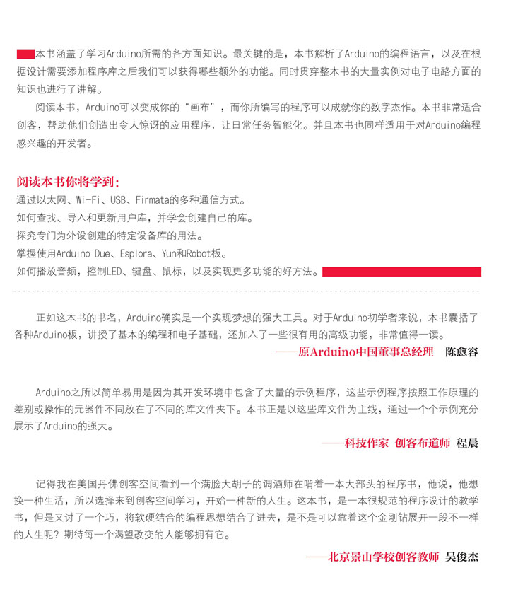 ● 原Arduino中国董事总经理陈愈容、创客布道师程晨、知名创客教师吴俊杰联合推荐。