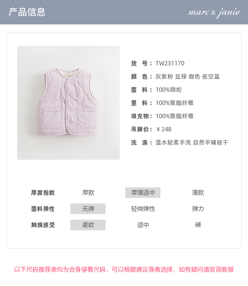 【三防】马克珍妮秋冬新款 男女童百搭加绒棉马甲 儿童上衣231170