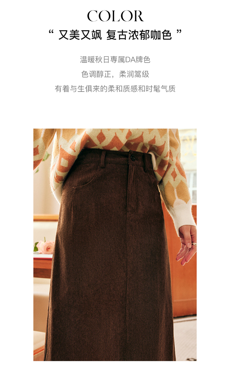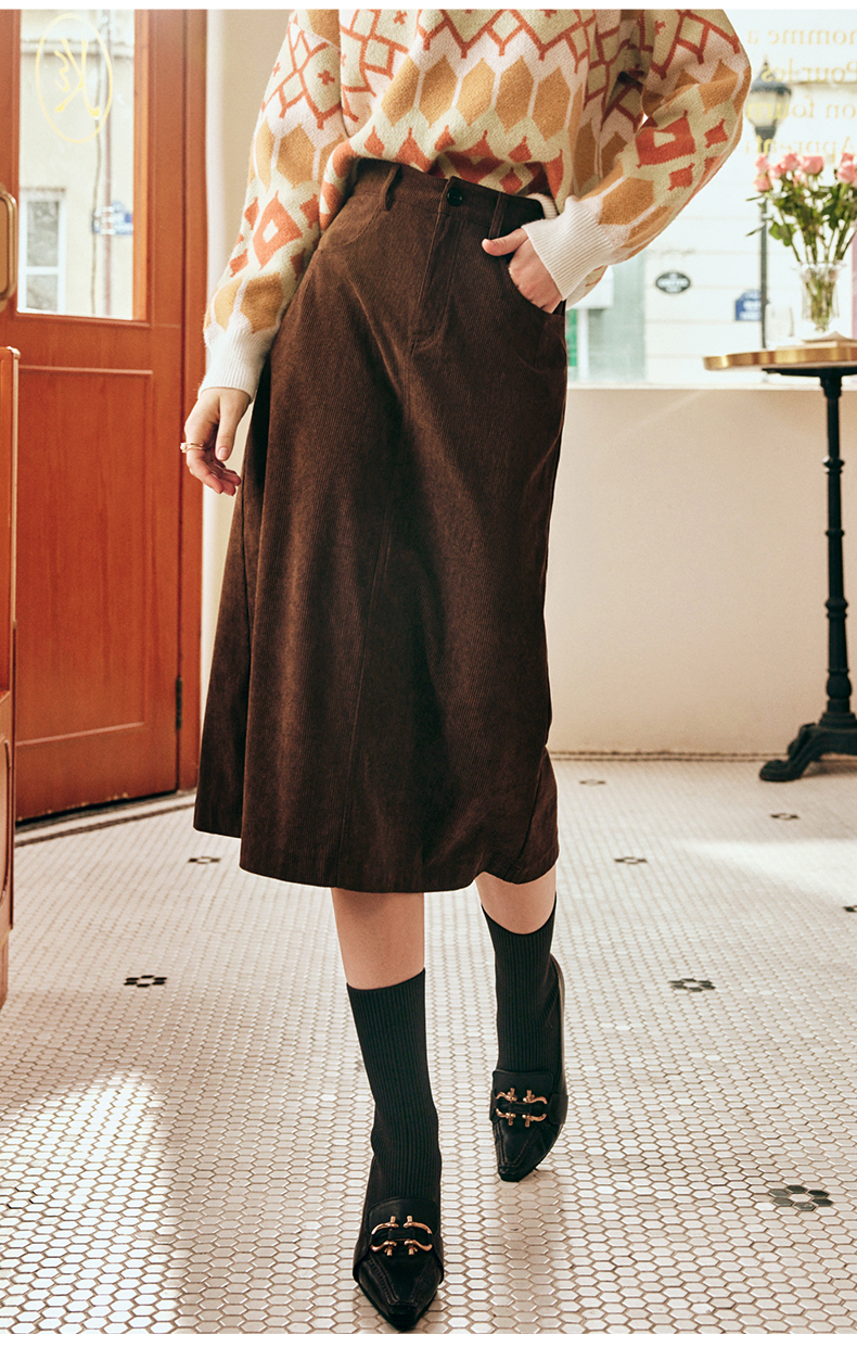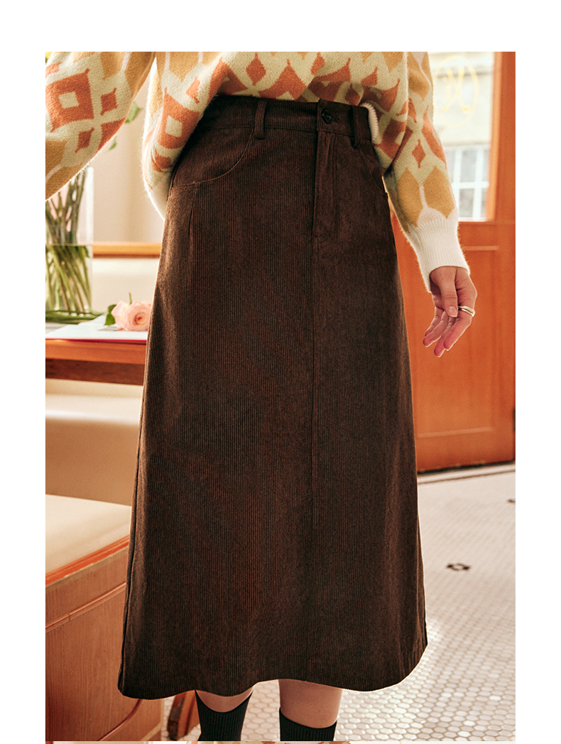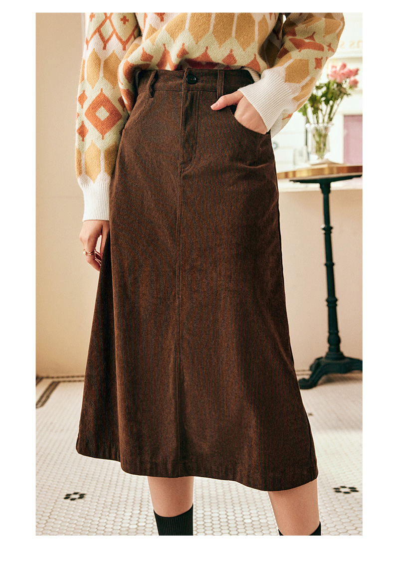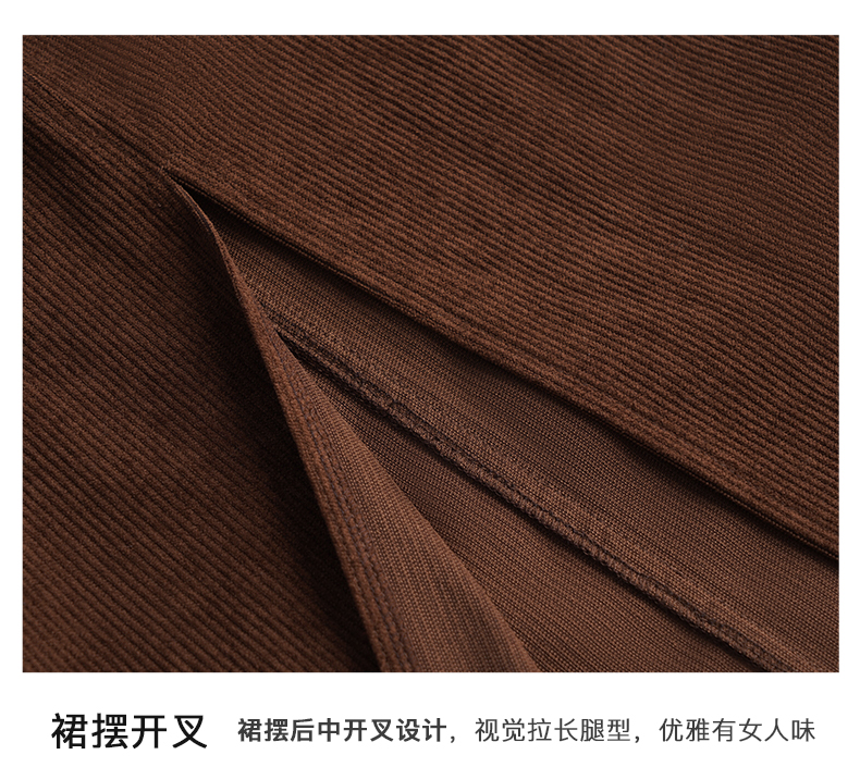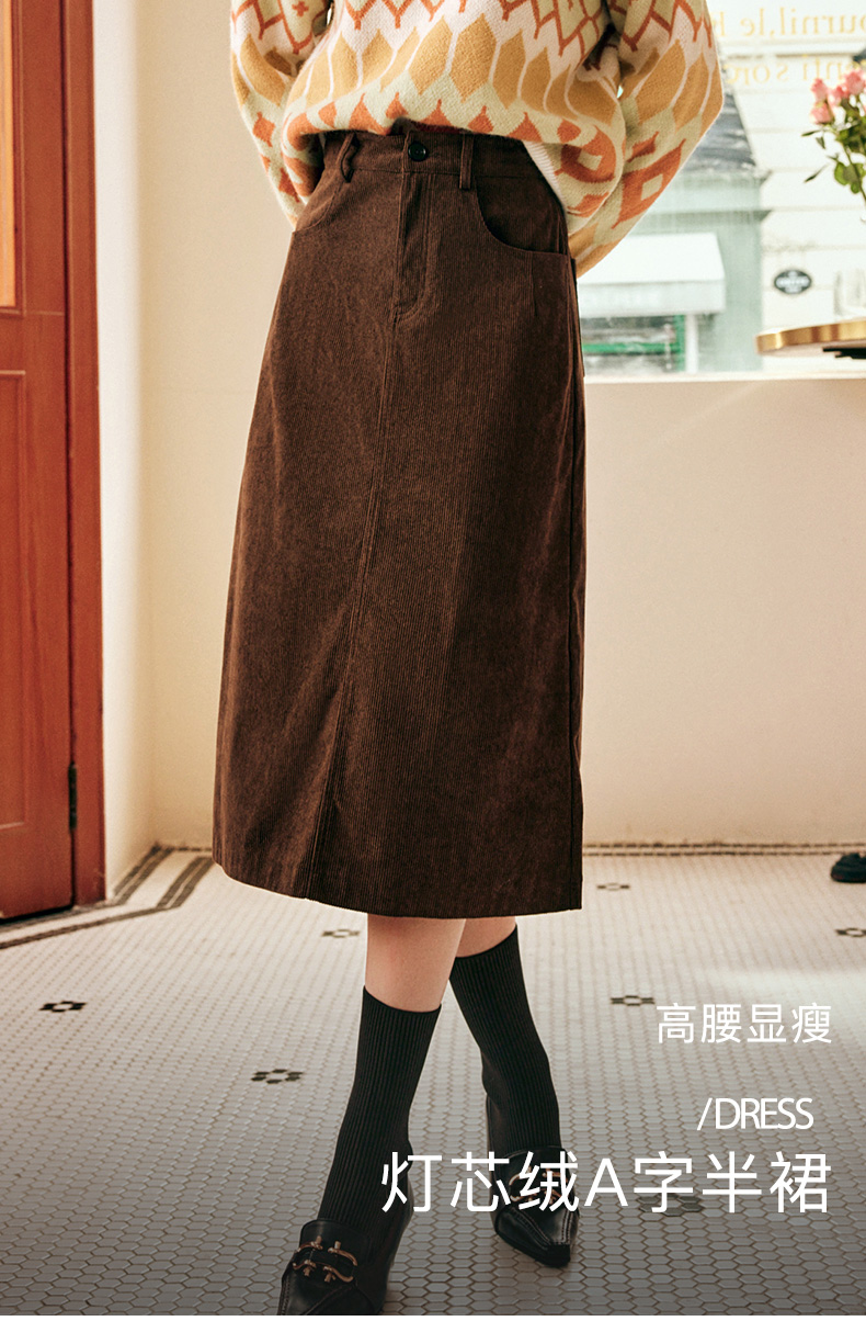 OLrain欧芮儿法式咖色灯芯绒半身裙女秋冬2022新款高腰开叉A字裙