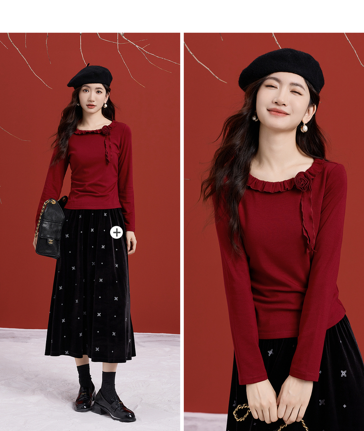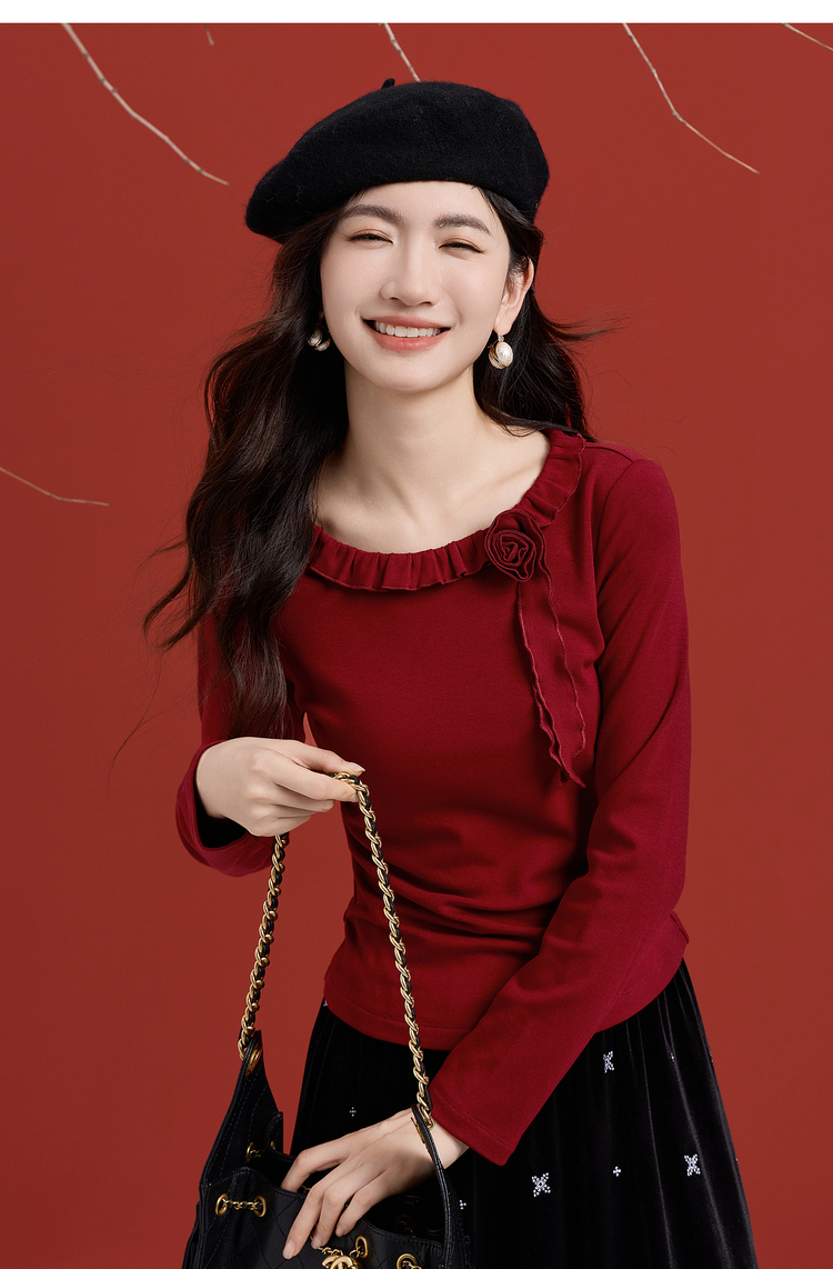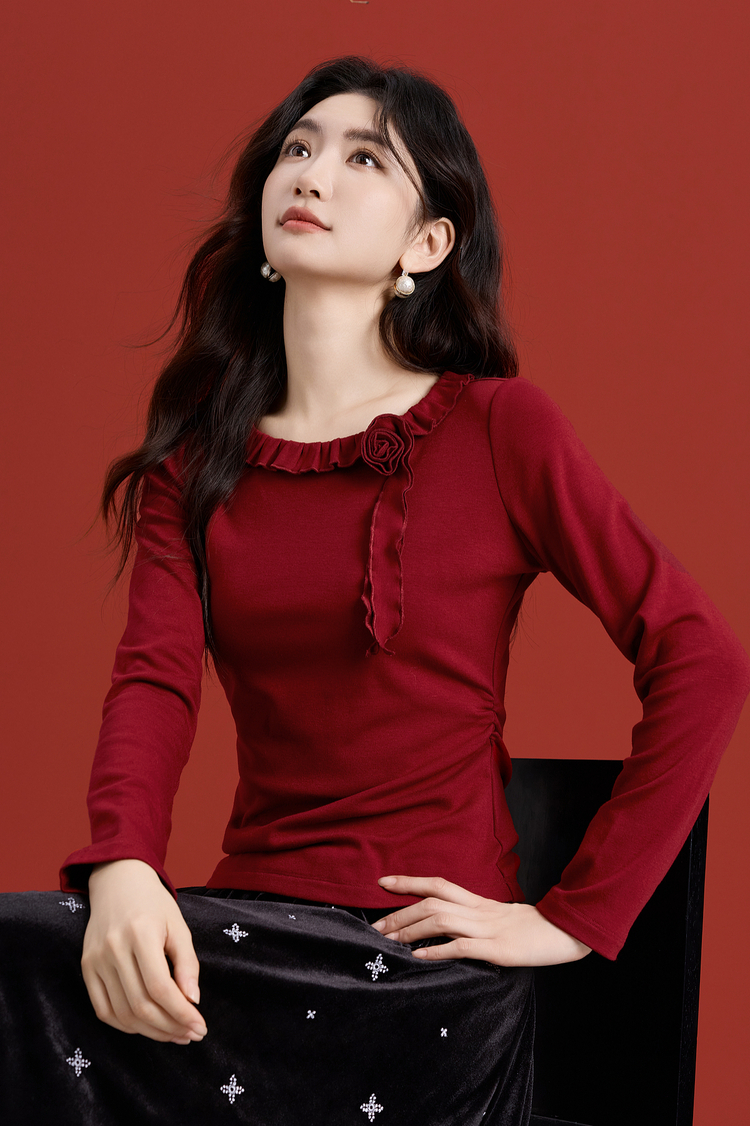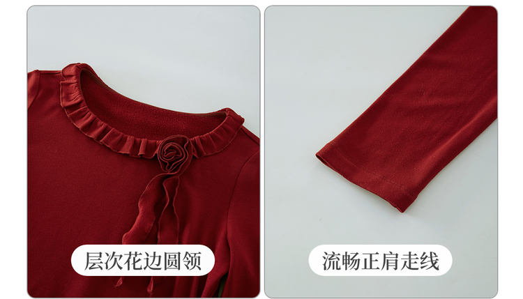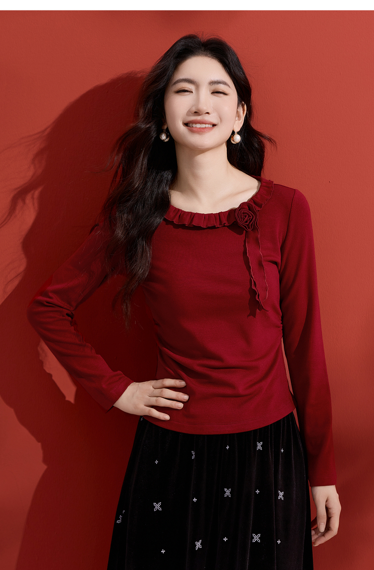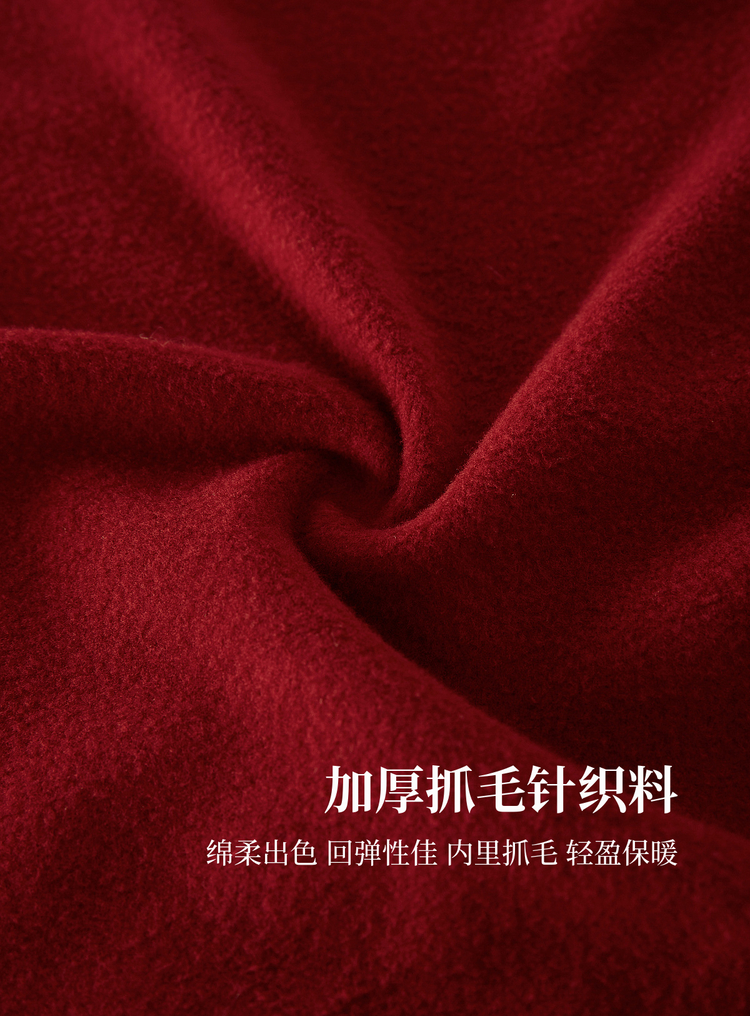 【12/10新品6折】熙世界独特绝美抓绒T恤女长袖氛围感圣诞红色上衣打底衫2025秋冬