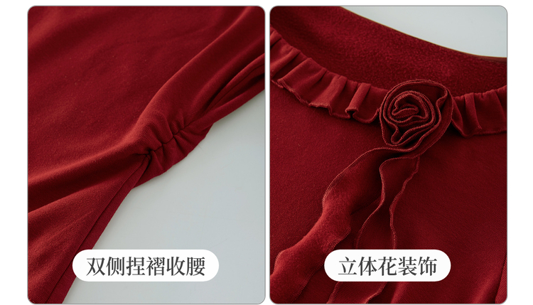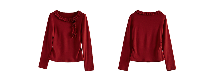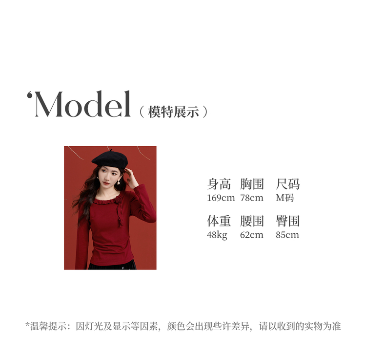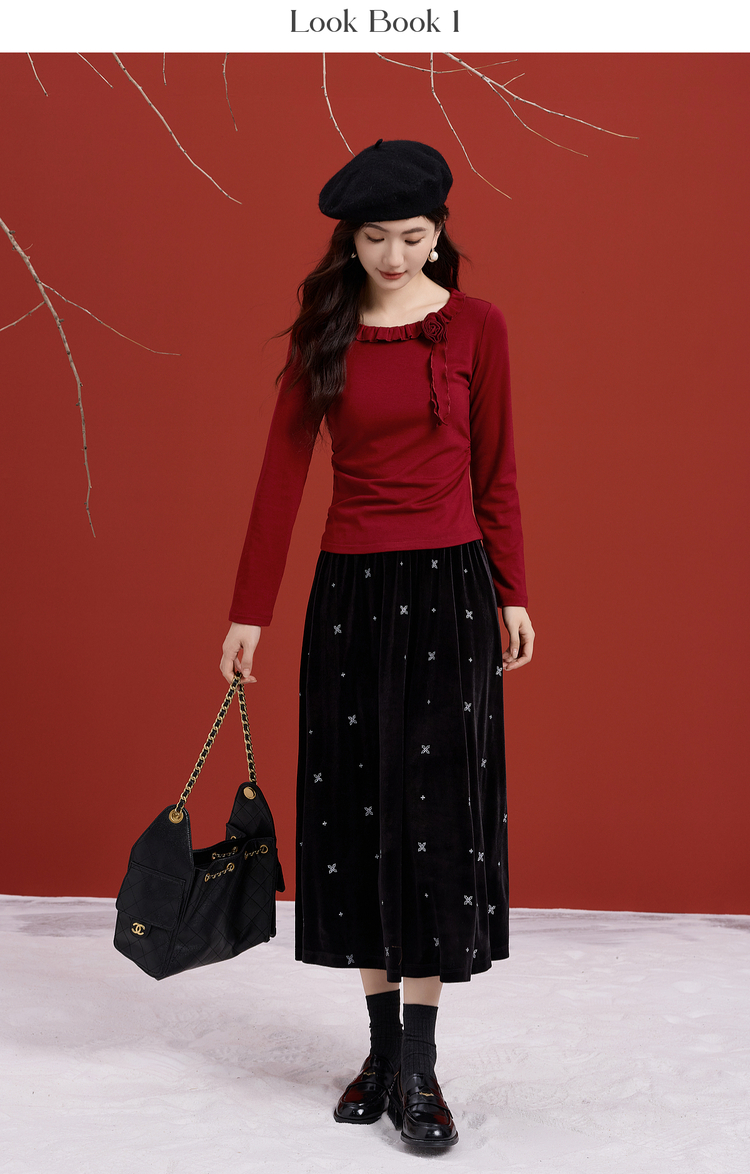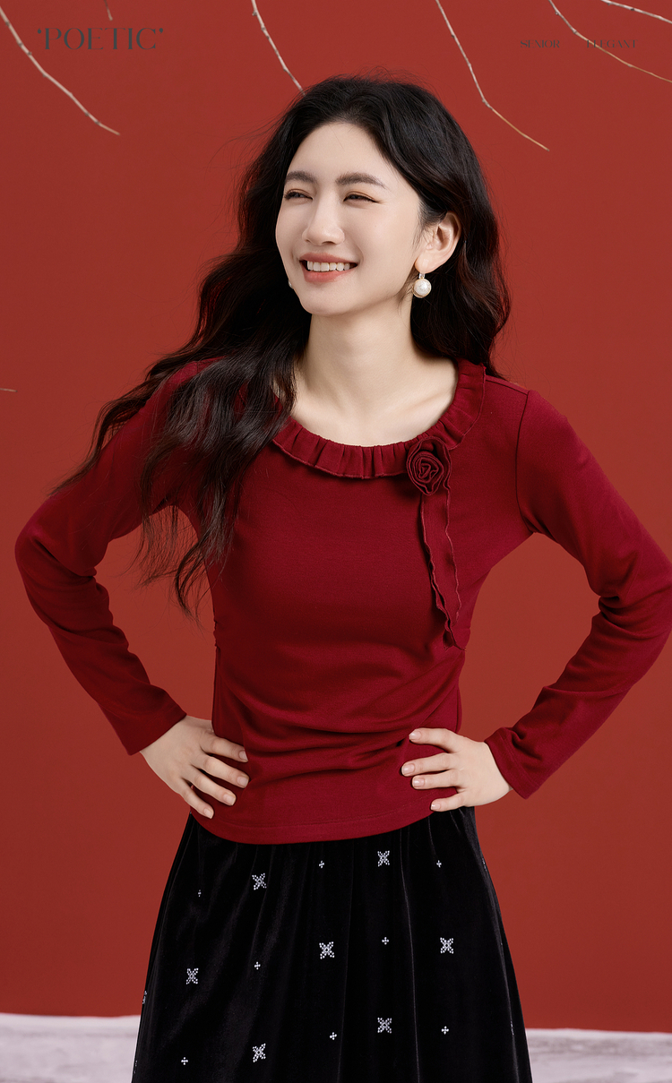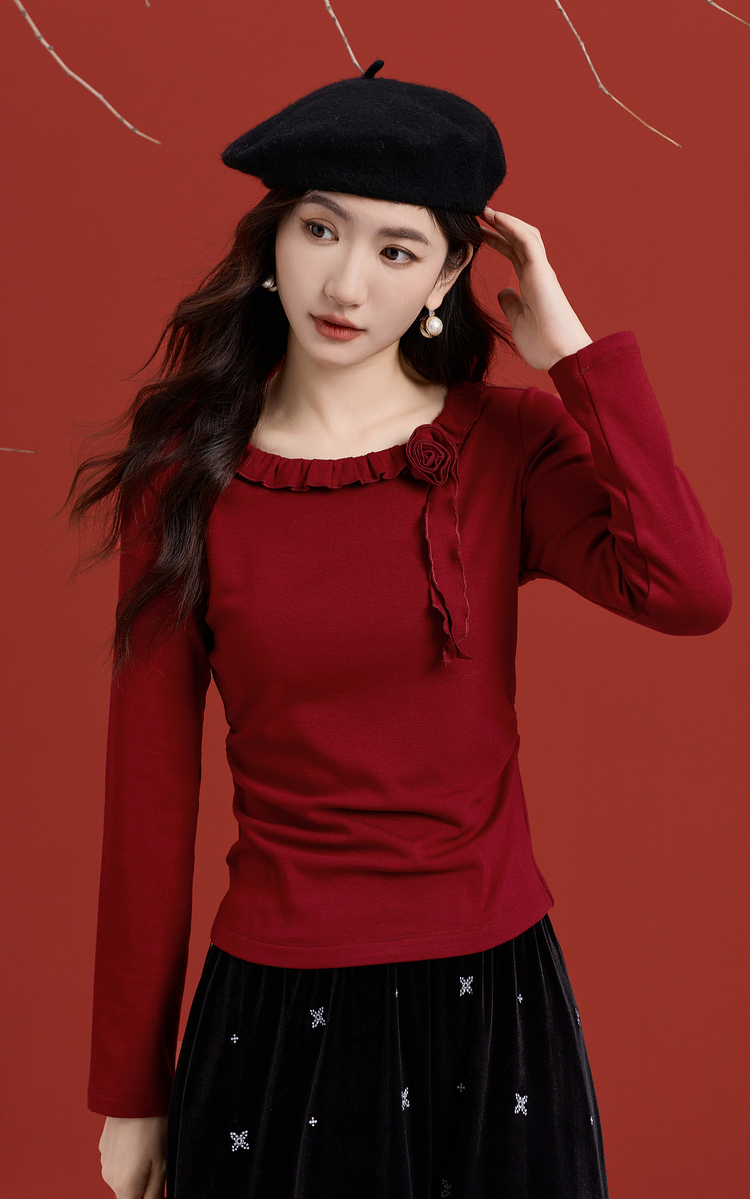 【12/10新品6折】熙世界独特绝美抓绒T恤女长袖氛围感圣诞红色上衣打底衫2025秋冬