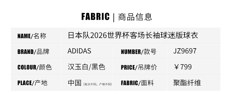 SFS阿迪达斯2026世界杯日本客场长袖球迷版球衣足球服男 JZ9697