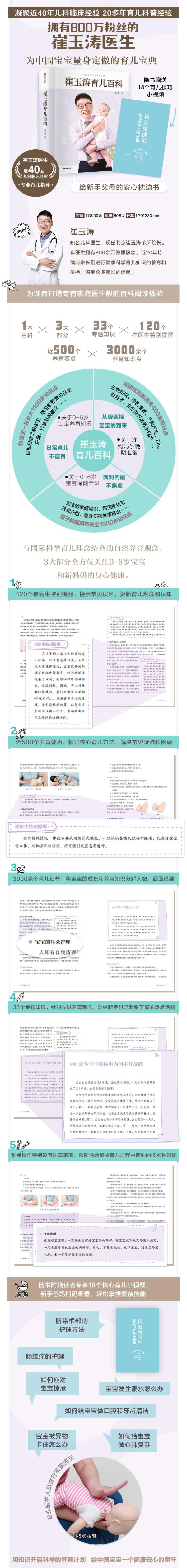 《崔玉涛育儿百科》一书,更是以传统的全面、严谨与现代的教学视频、App 互动有机结合,对新生儿养育、婴儿护理、儿童保健来说是一个值得期待的福音。