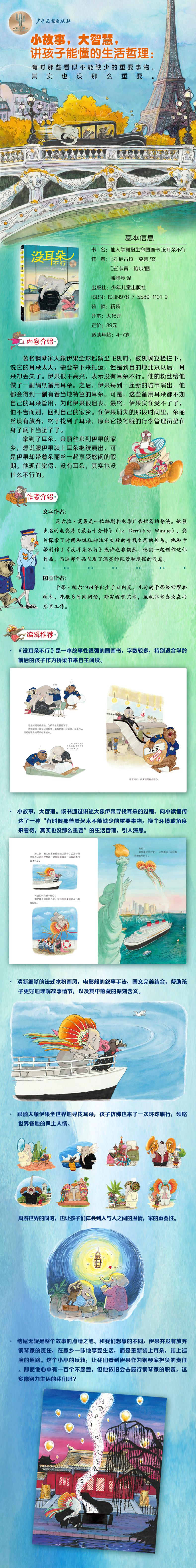 本书讲的一个名叫伊果的大象寻找耳朵的故事。有名钢琴家大象伊果在一次进行全球演出的过程中,被机场安检拦下,说它的耳朵体积超过随身行李尺寸,需要拿下来托运。但是到目的地北京以后,装着耳朵的托运行李却丢失了。伊果很不高兴,表示没有耳朵不行。他的中国粉丝给他做了一副绢纸做的备用耳朵。之后,伊果每到一座新的城市演出,他能干的经纪人鼹鼠朵丽丝都会根据城市特色给他换一对耳朵。可是,这些耳朵都不如自己的耳朵管用,为此伊果很沮丧。最终,在演出结束后伊果不告而别,回到自己的家乡。在伊果消失的那段时间里,朵丽丝没有放弃,终于找到了耳朵,原来它被冬眠的行李管理员垫在身子底下当垫子了。拿到了耳朵,朵丽丝来到伊果的家乡,想说服伊果装上耳朵继续演出,可是伊果却带着朵丽丝一起享受悠闲的假期。他现在觉得,没有耳朵,其实也没什么不行的。