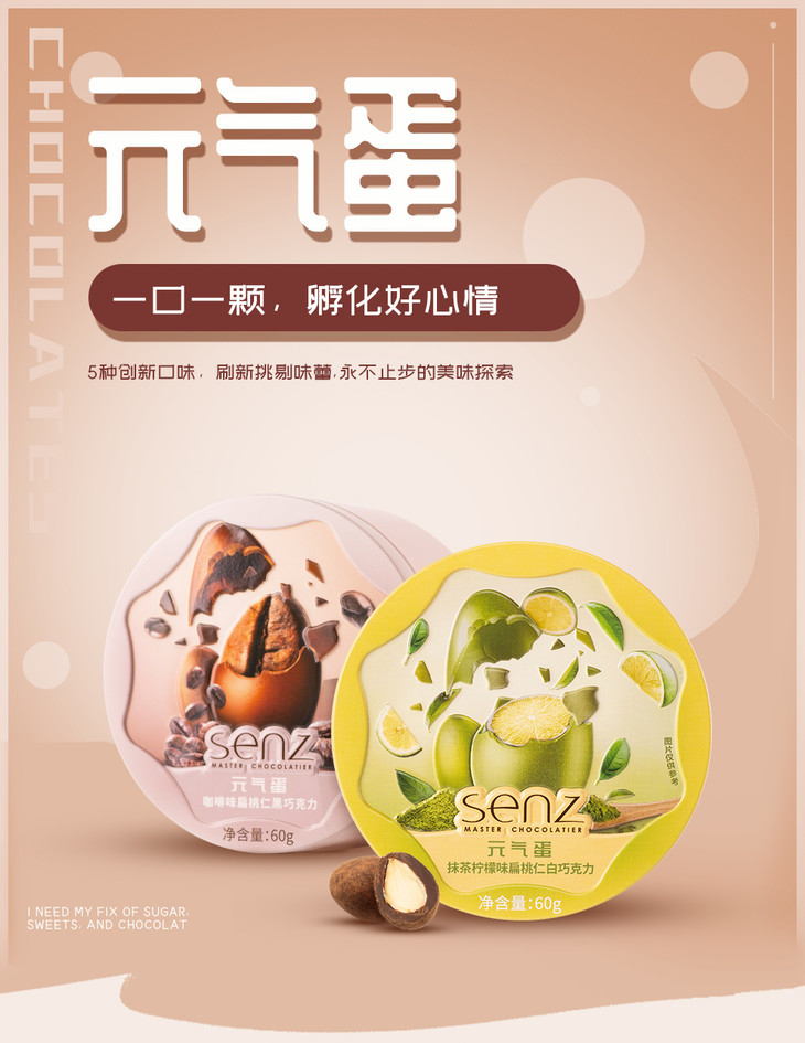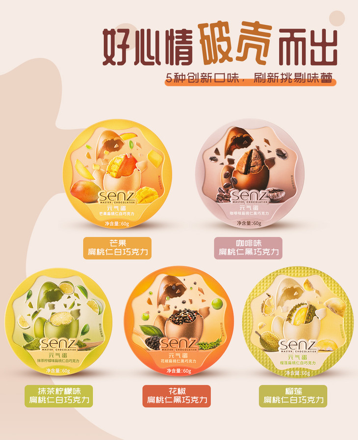 心之SENZ【元气蛋】巧克力60g 5味选择咖啡味/芒果味/榴莲味/花椒味/抹茶柠檬味