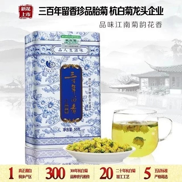 三百年留香御用特级胎菊王(正宗桐乡杭白菊花茶)50克一罐青花罐装