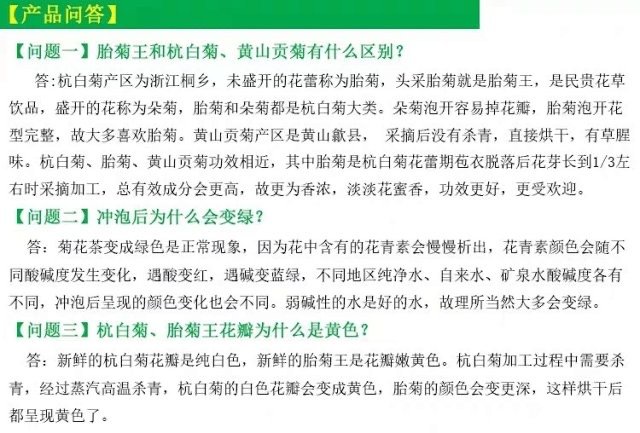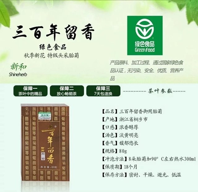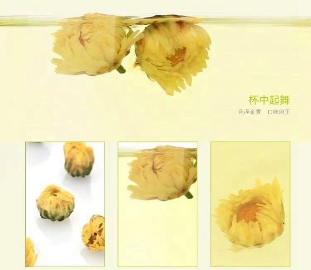 【泡饮方法】:取胎菊10~12朵放入玻璃杯(若是饮用的人多,可用透明的茶壶),用100度纯净水冲泡2至3分钟即可,也可依个人口味加入枸杞、蜂蜜或与茶叶同泡,不仅让人悦目而且口感更佳。每次冲泡不要等喝完,留下三分之一杯的汁水就要续沸水,可维持余香及更久的冲泡时间。用杭白胎菊泡的菊花茶,味道纯正,色泽金黄,含有浓郁的花蜜清香,而且长时间冲泡也不会散开变形。