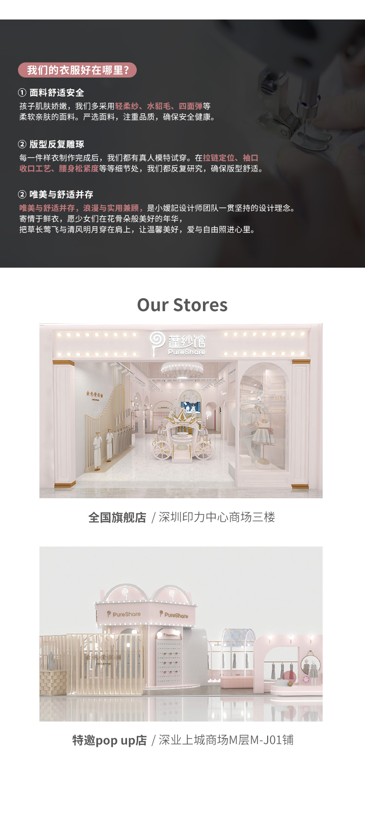 - PureShare蓬纱馆,2018年创立的儿童服装品牌,专注于儿童轻奢生活类小礼服,主张“让孩子做最独特的自己”的品牌理念,为孩子们提供时尚简洁、优雅而又不失童真的生活类礼服。