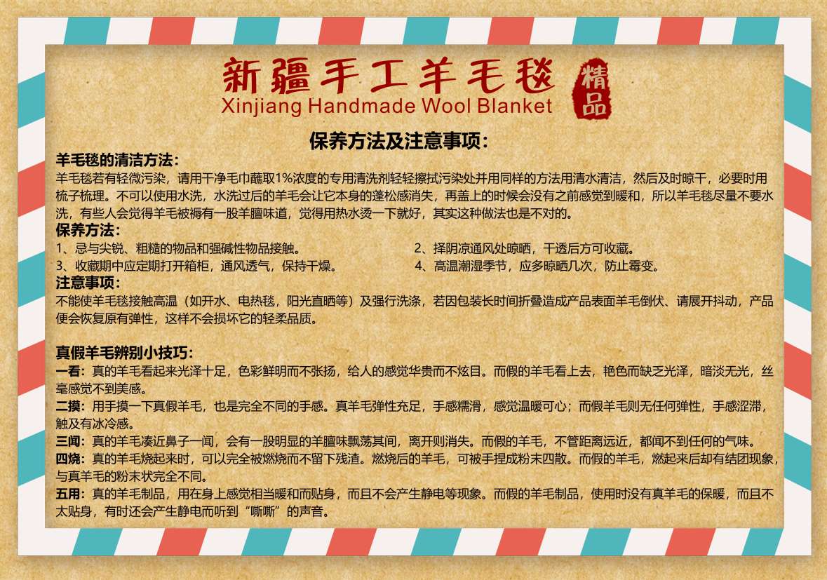 ①请尽量干洗!产品属于纯羊毛,会有一定的膻味,晾置几天后味道会渐渐散去。刚收到羊毛毯需要抖一抖,再用刷梳一梳上面的浮毛,之后使用过程中就不怎么会掉毛了!