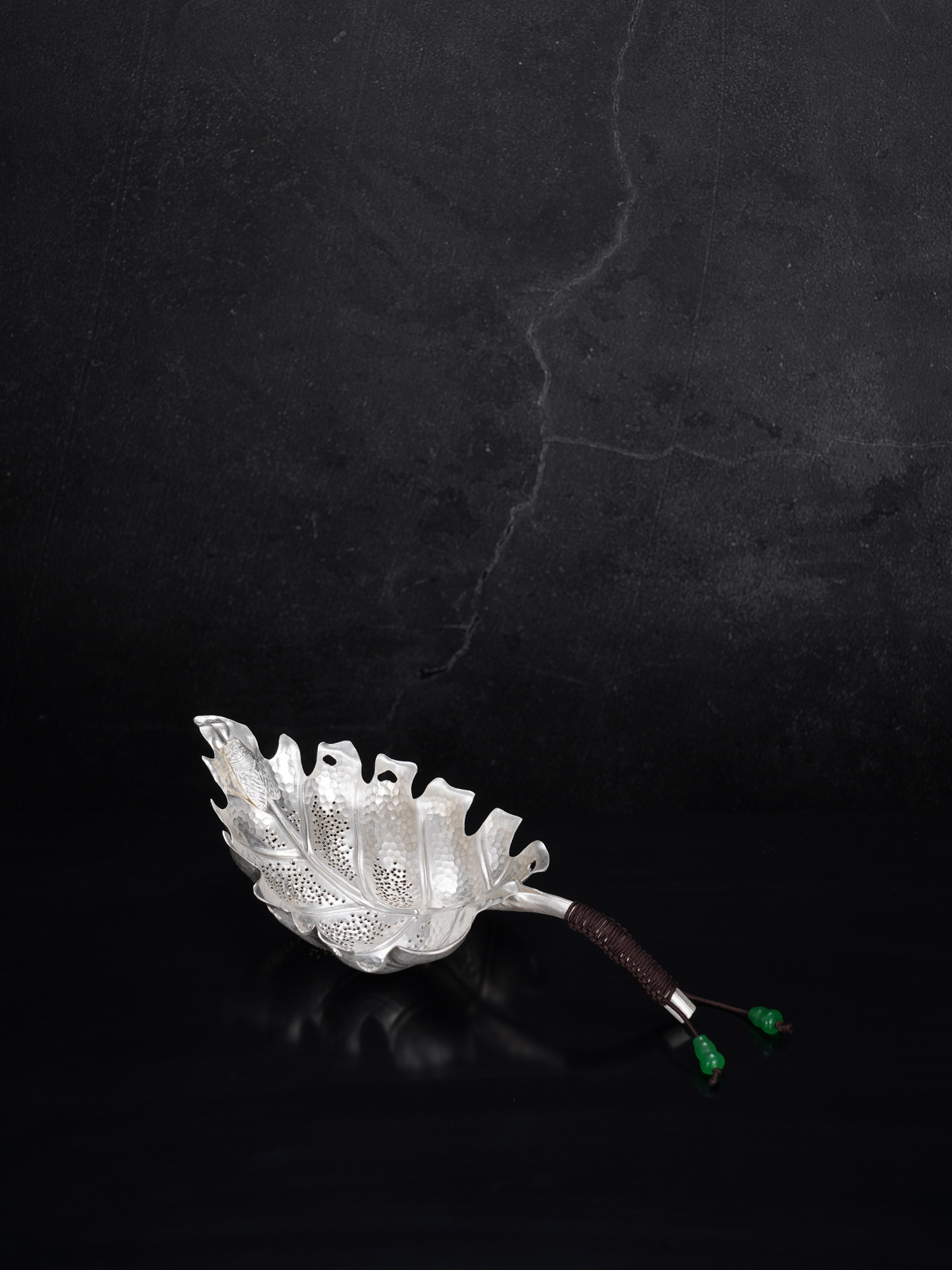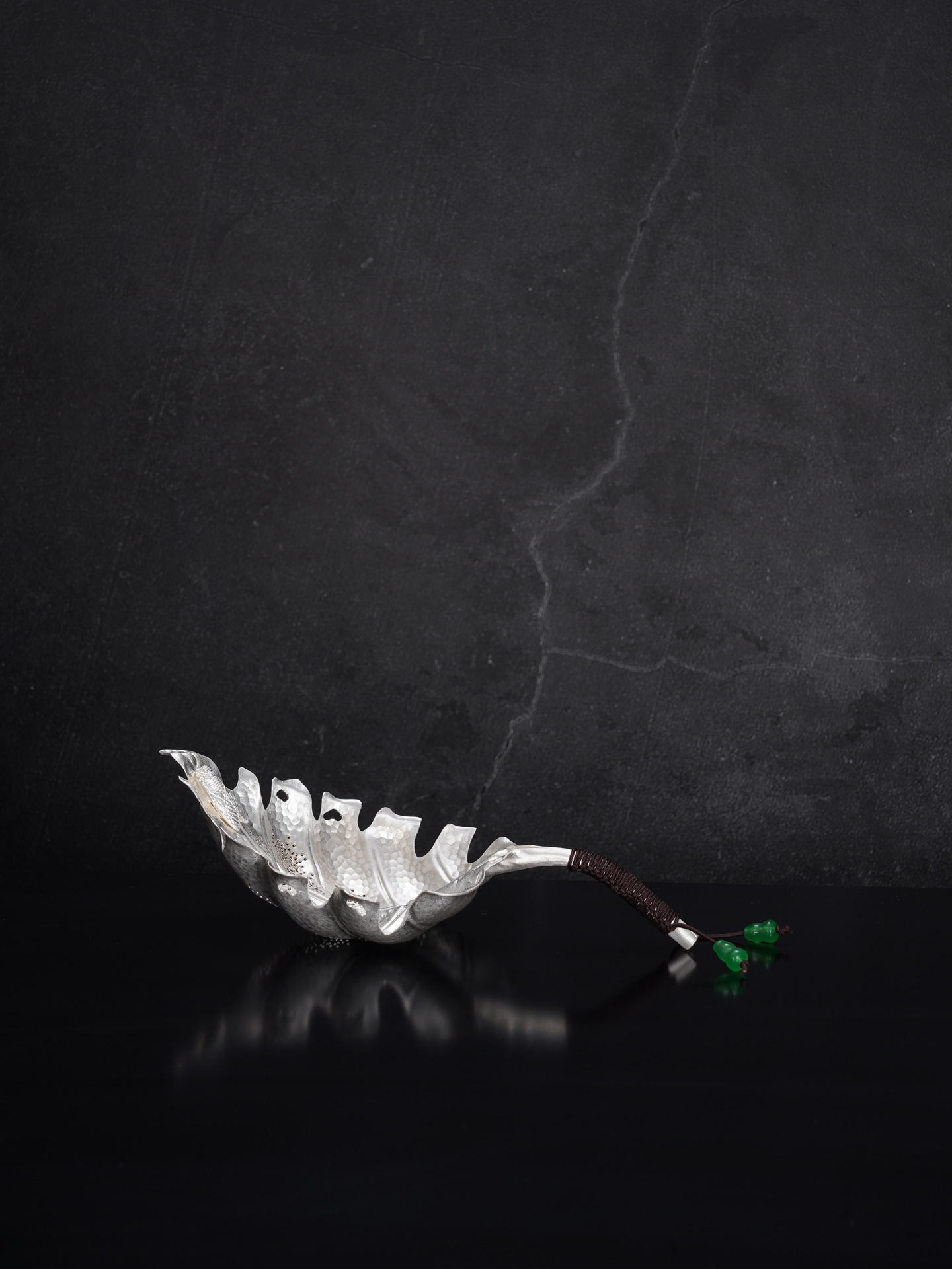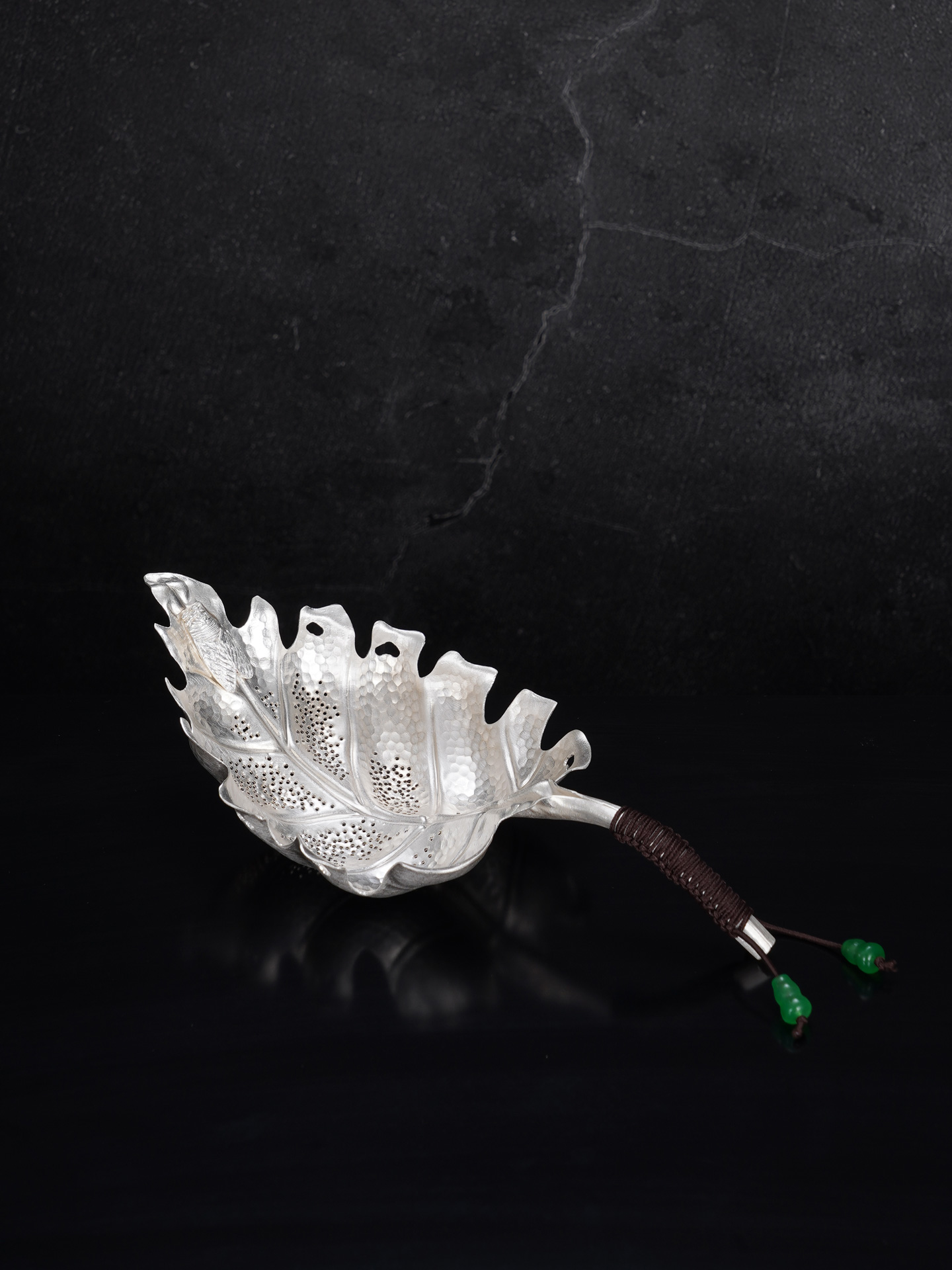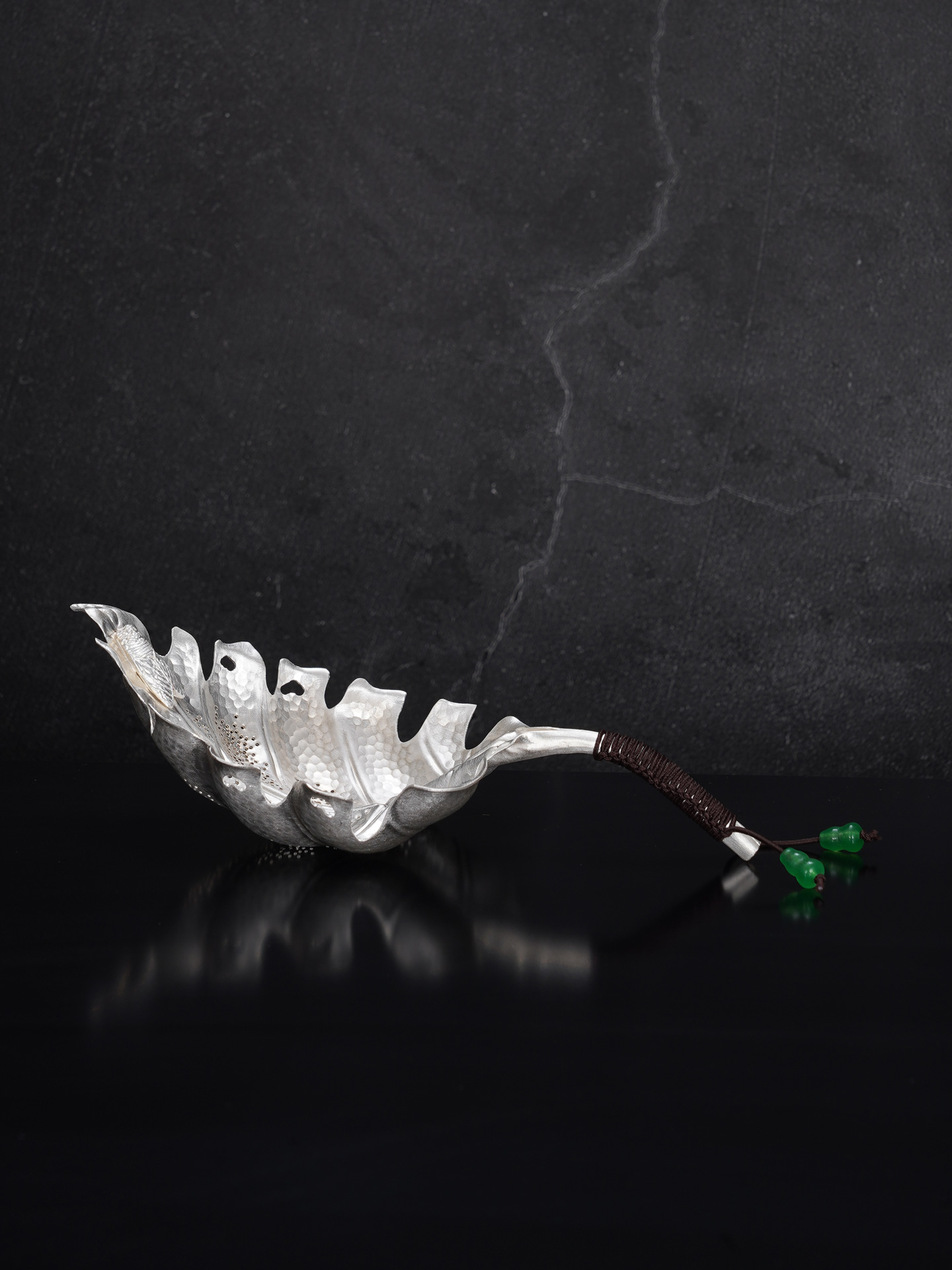 【寓意】:茶漏纯银材质,形似一片舒展的叶子,取名“一叶禅心”。以“一叶”喻自然纯净、生机盎然;“禅心”则暗合茶道静悟之境,象征心境澄明、福慧双修。