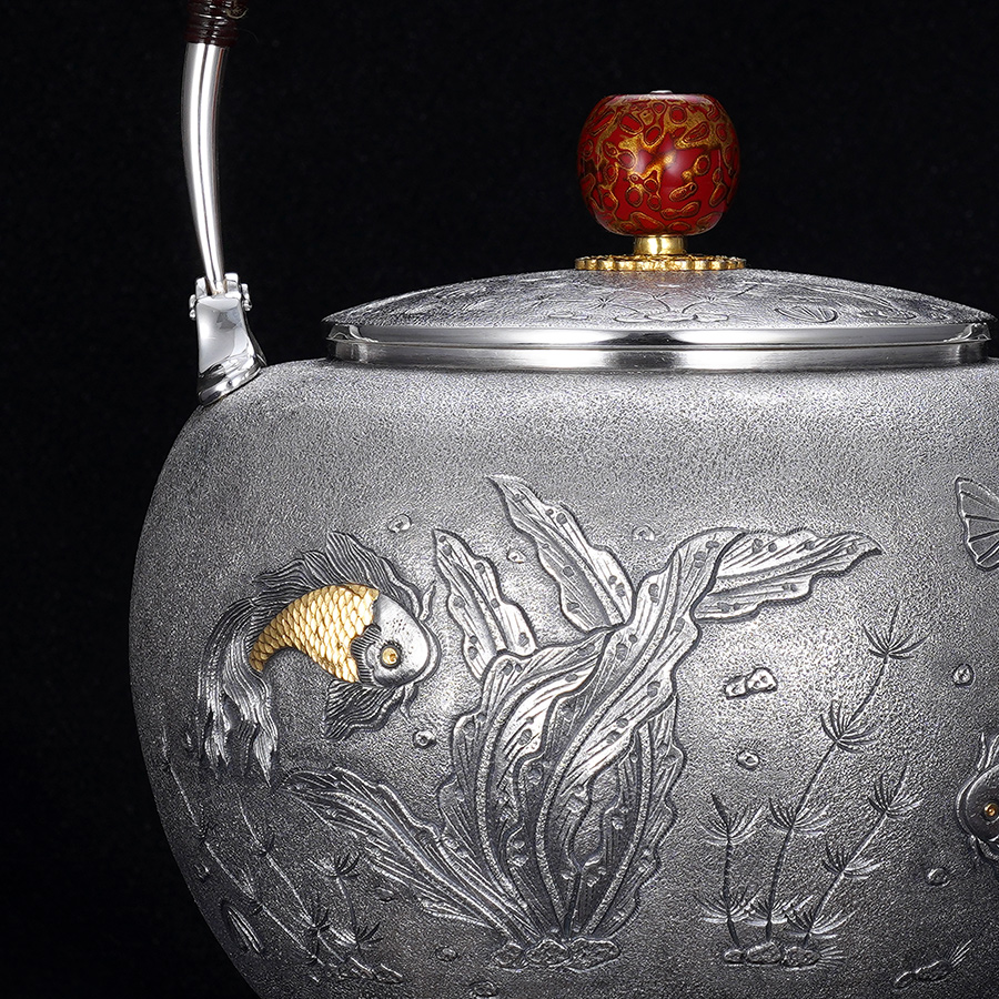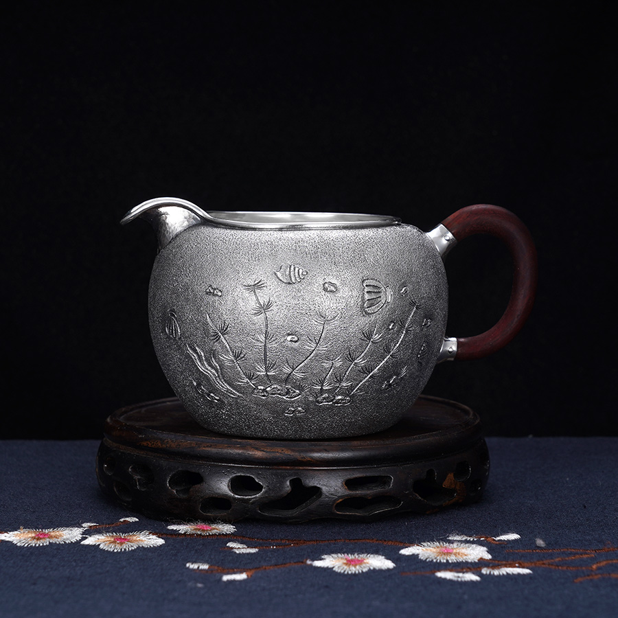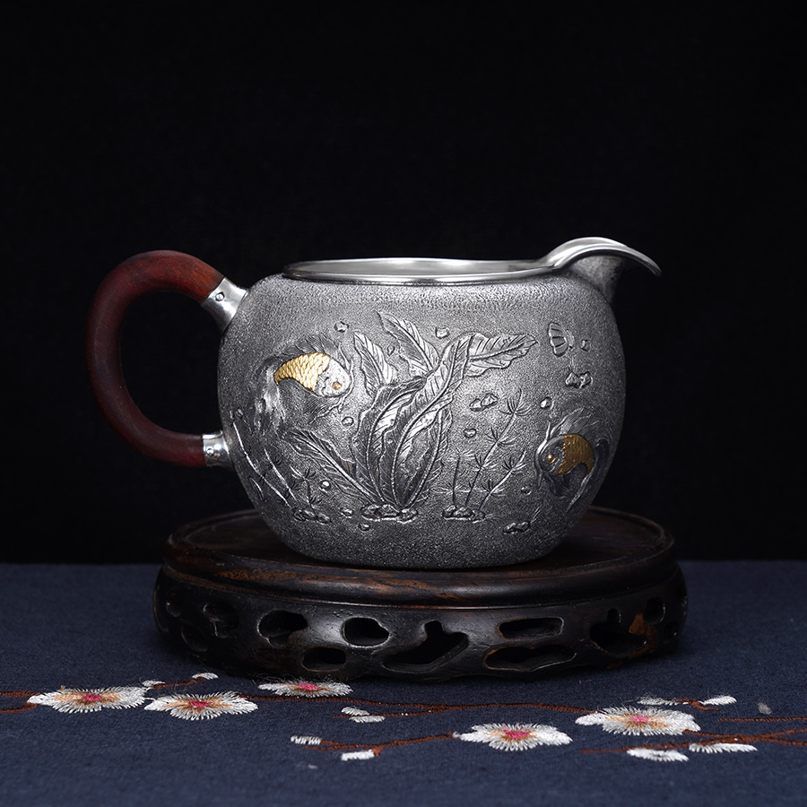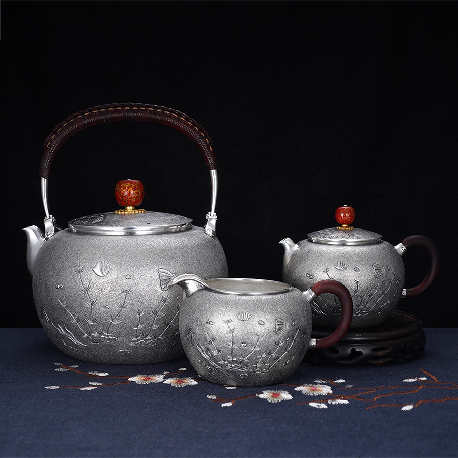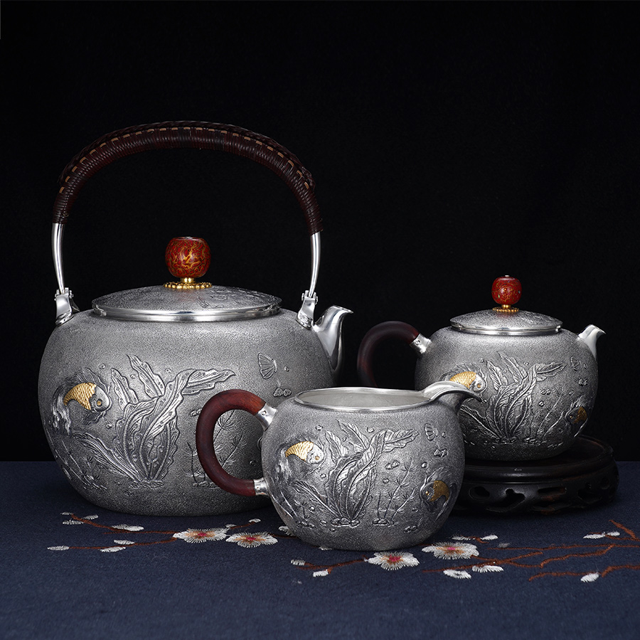 子佩集S990银【海阔鱼跃】纯银套装【HY008】【HY010】【HY009】提梁壶小茶壶公道杯摆件套装原创作品2501