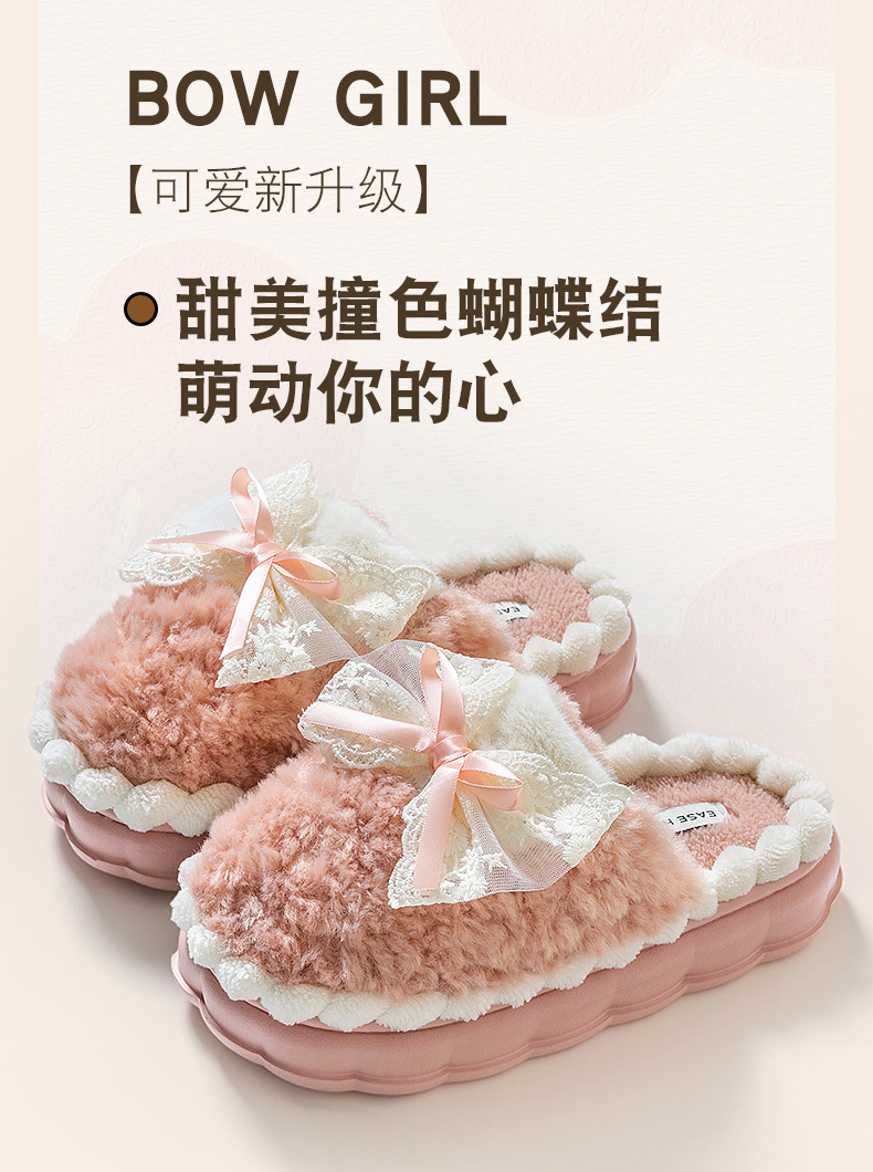 「四款配色!法式复古风」蝴蝶结棉拖鞋女士冬季保暖防滑室内家居2023新款厚底毛毛拖鞋冬天