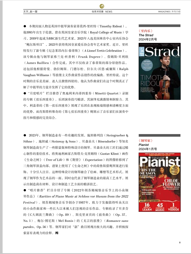 本期封面人物是英国中提琴演奏家蒂莫西·里杜特(Timothy Ridout),