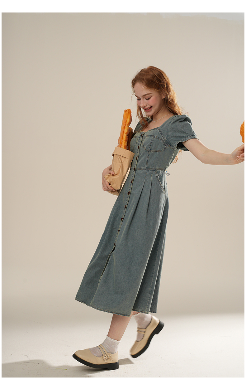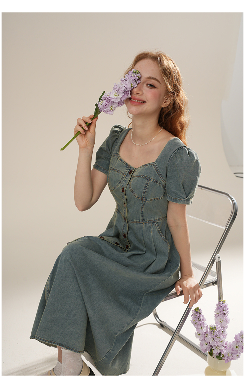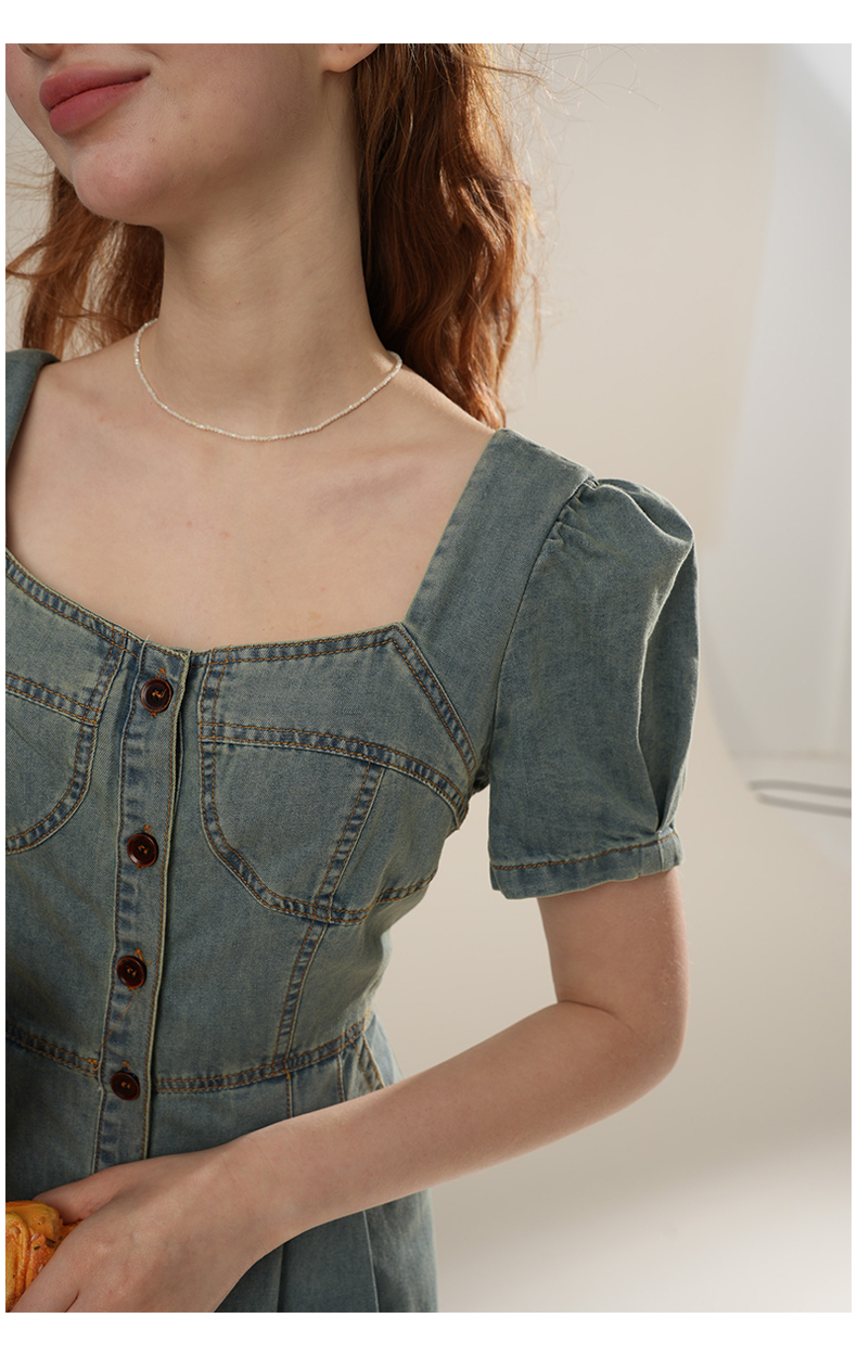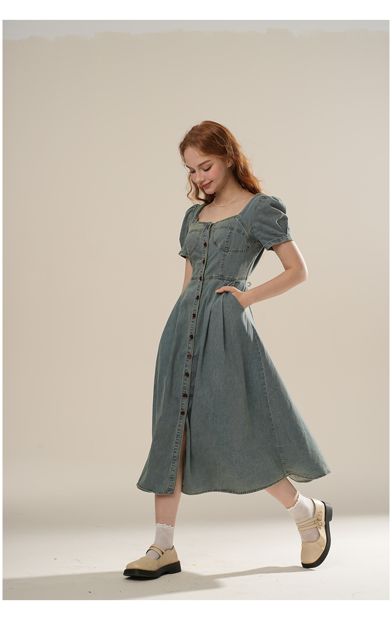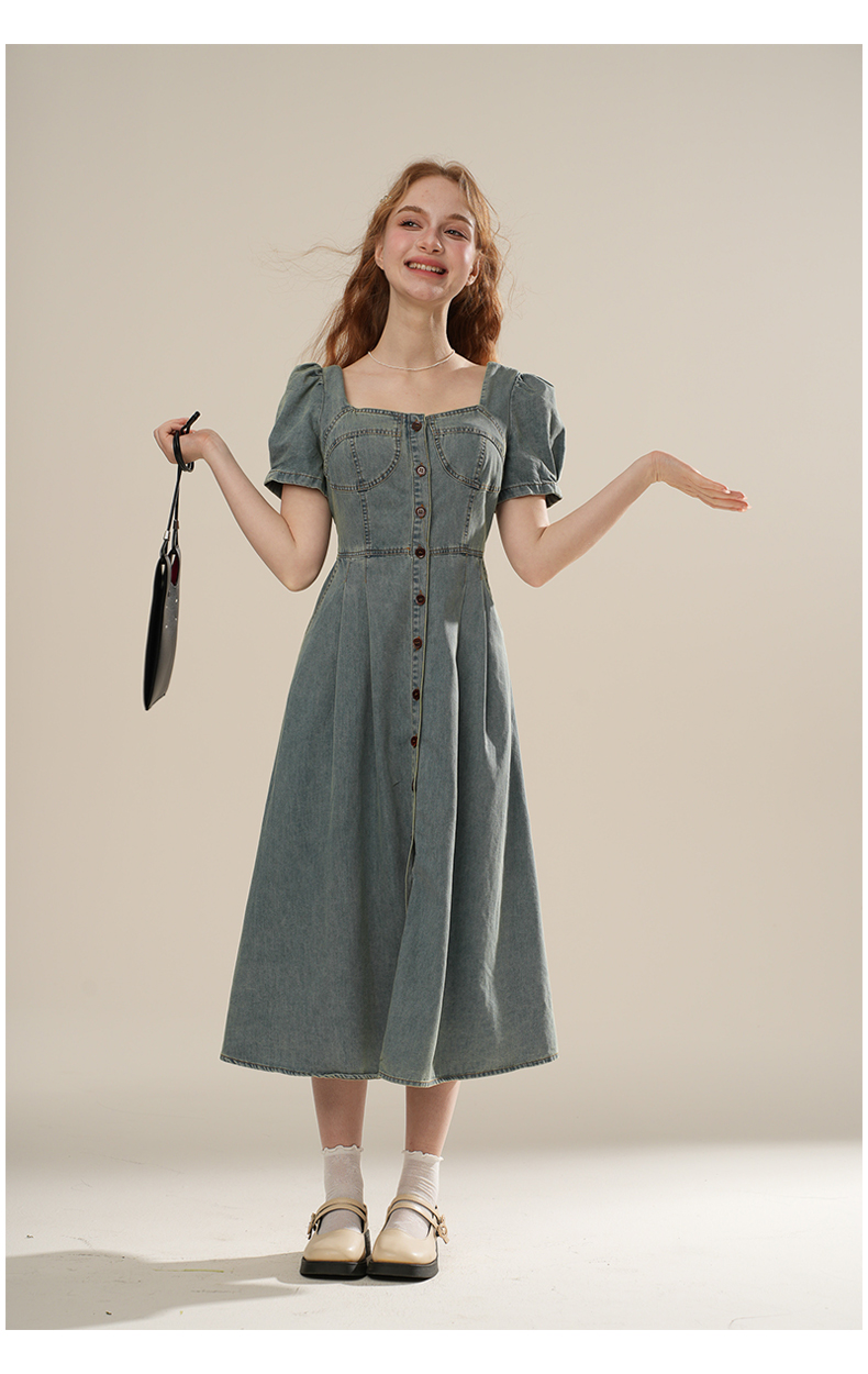 女装方领前门襟开扣复古牛仔连衣裙-5028Q5221010