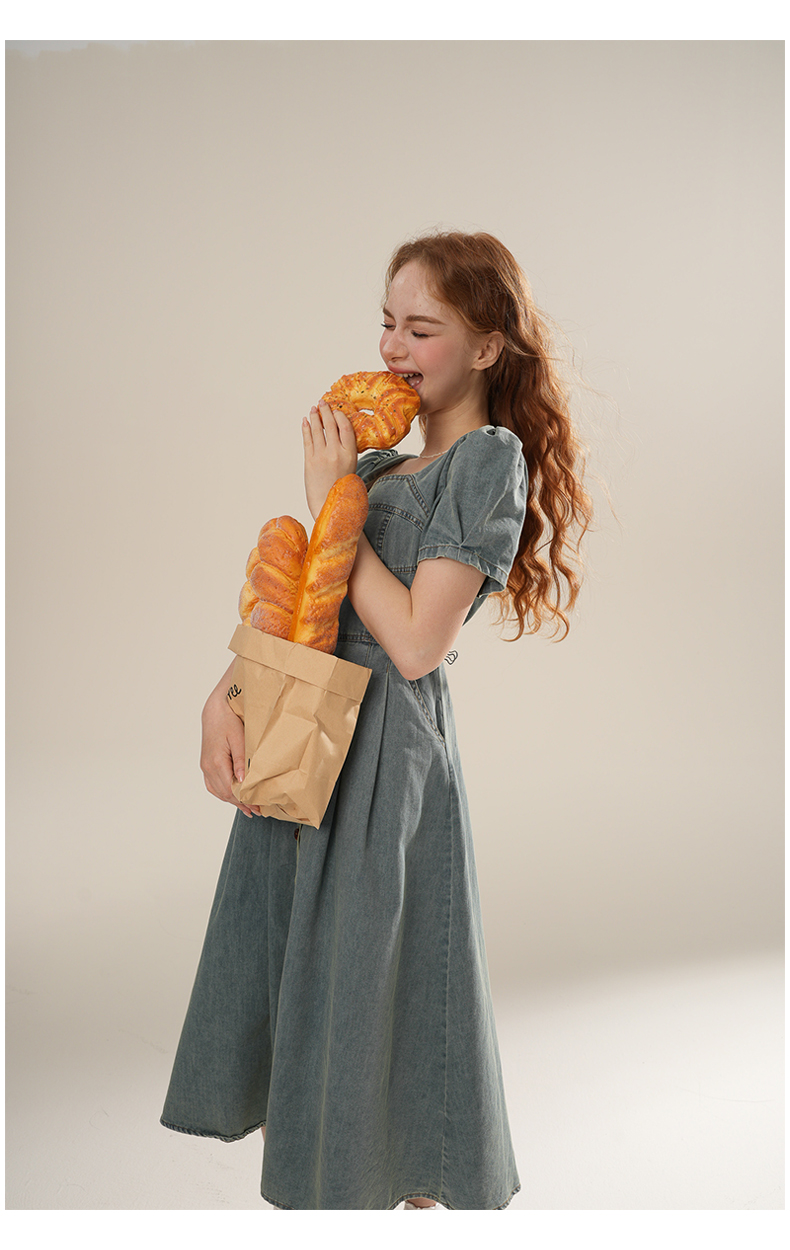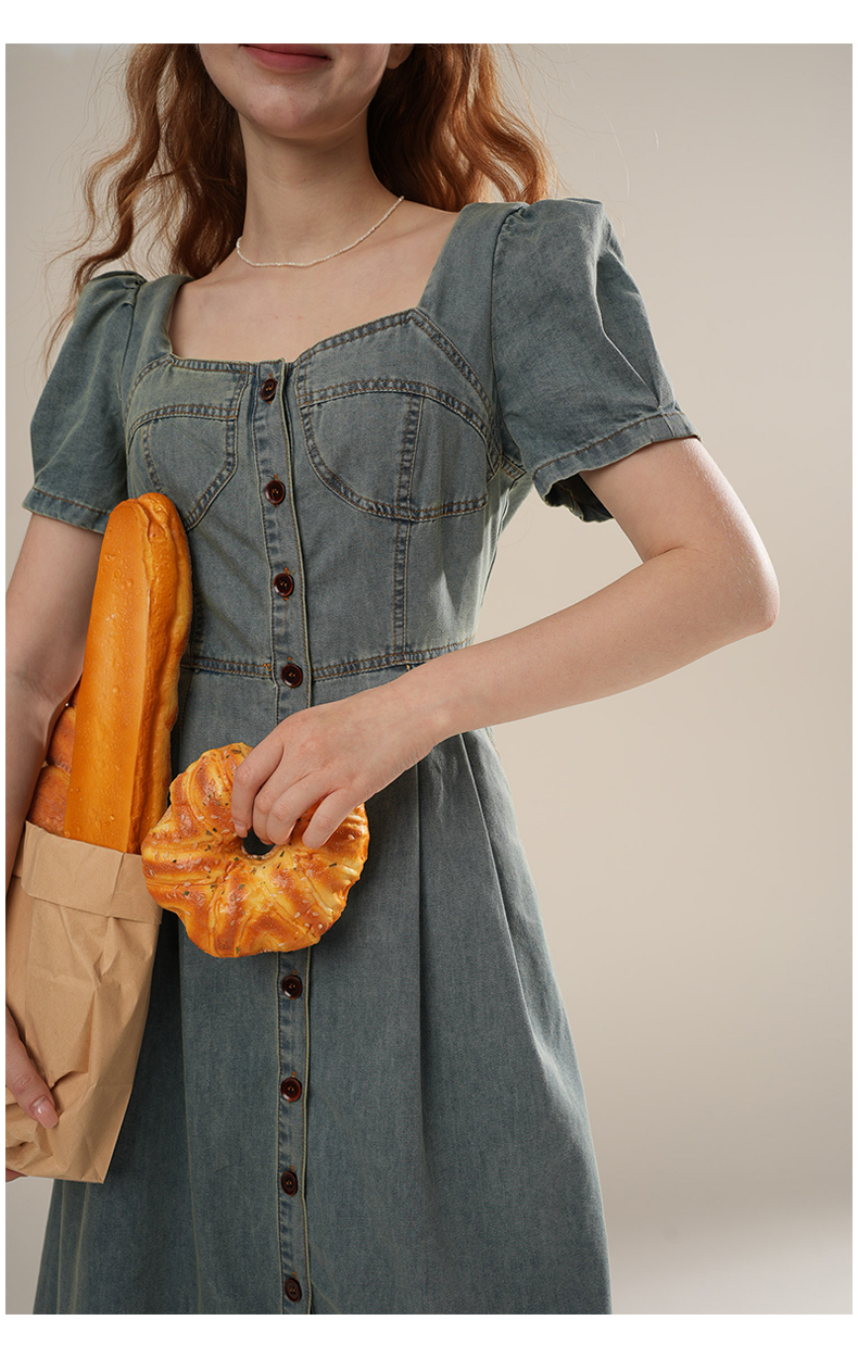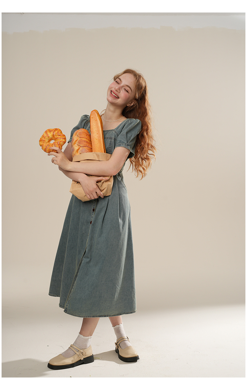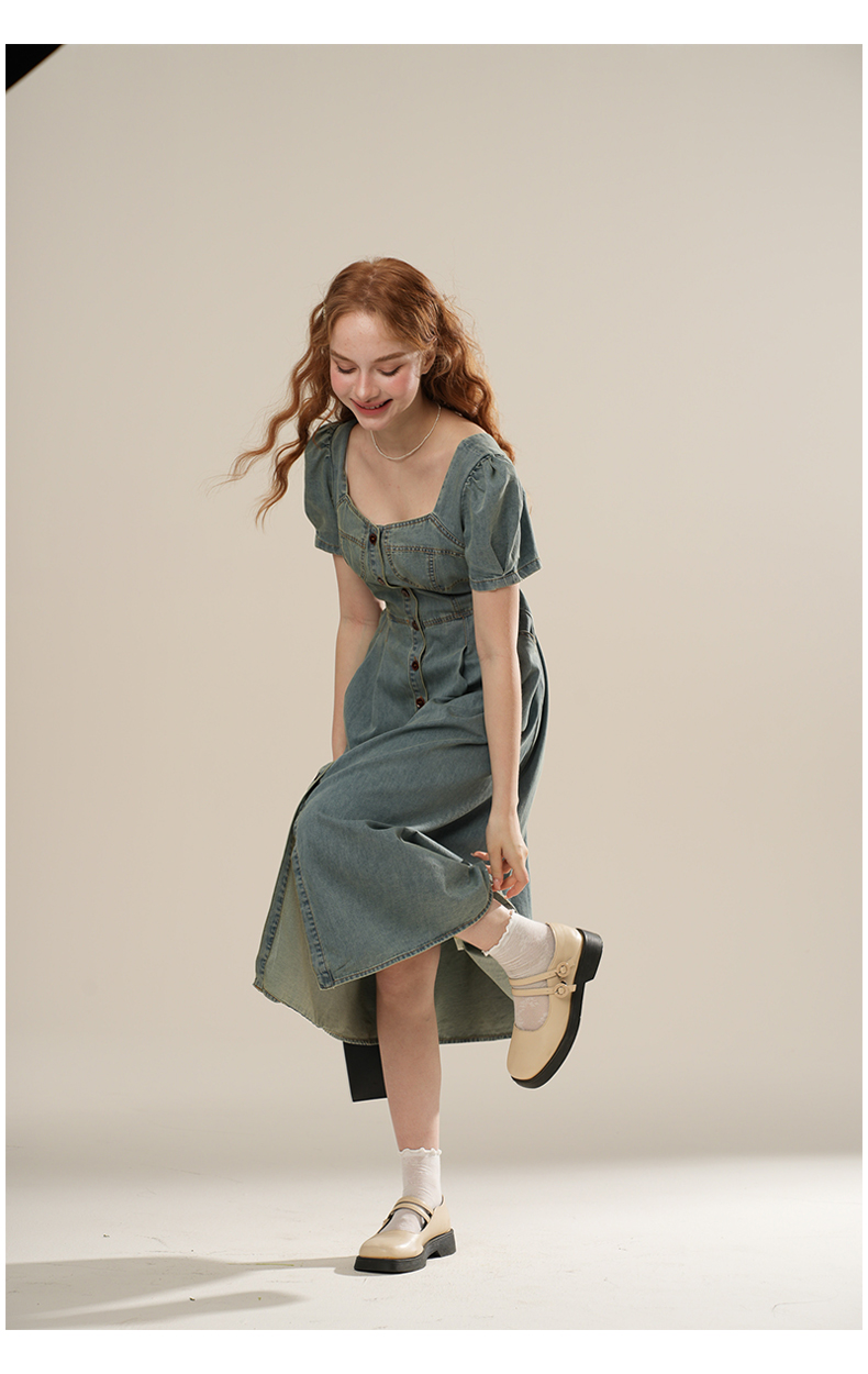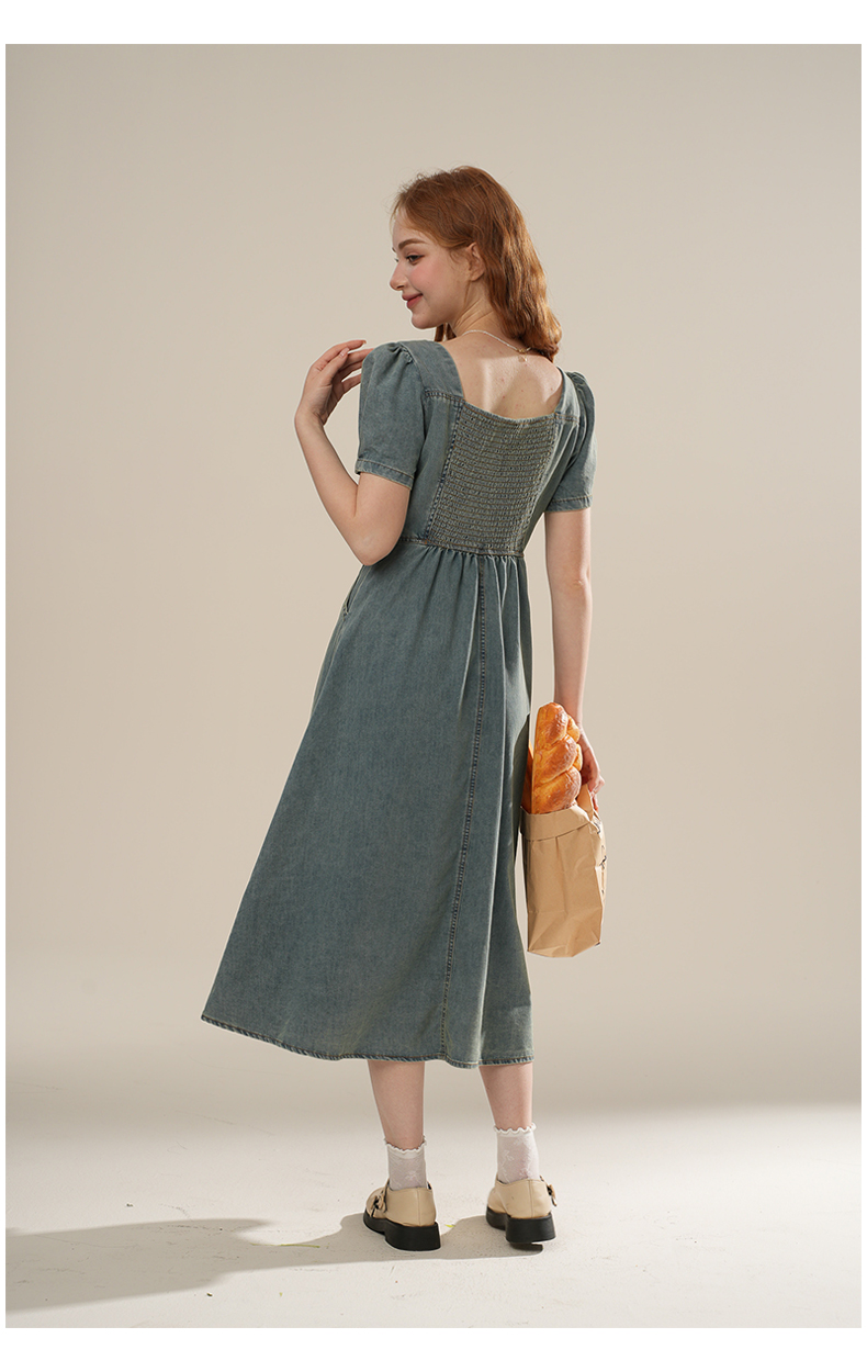 女装方领前门襟开扣复古牛仔连衣裙-5028Q5221010