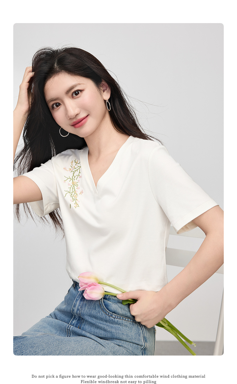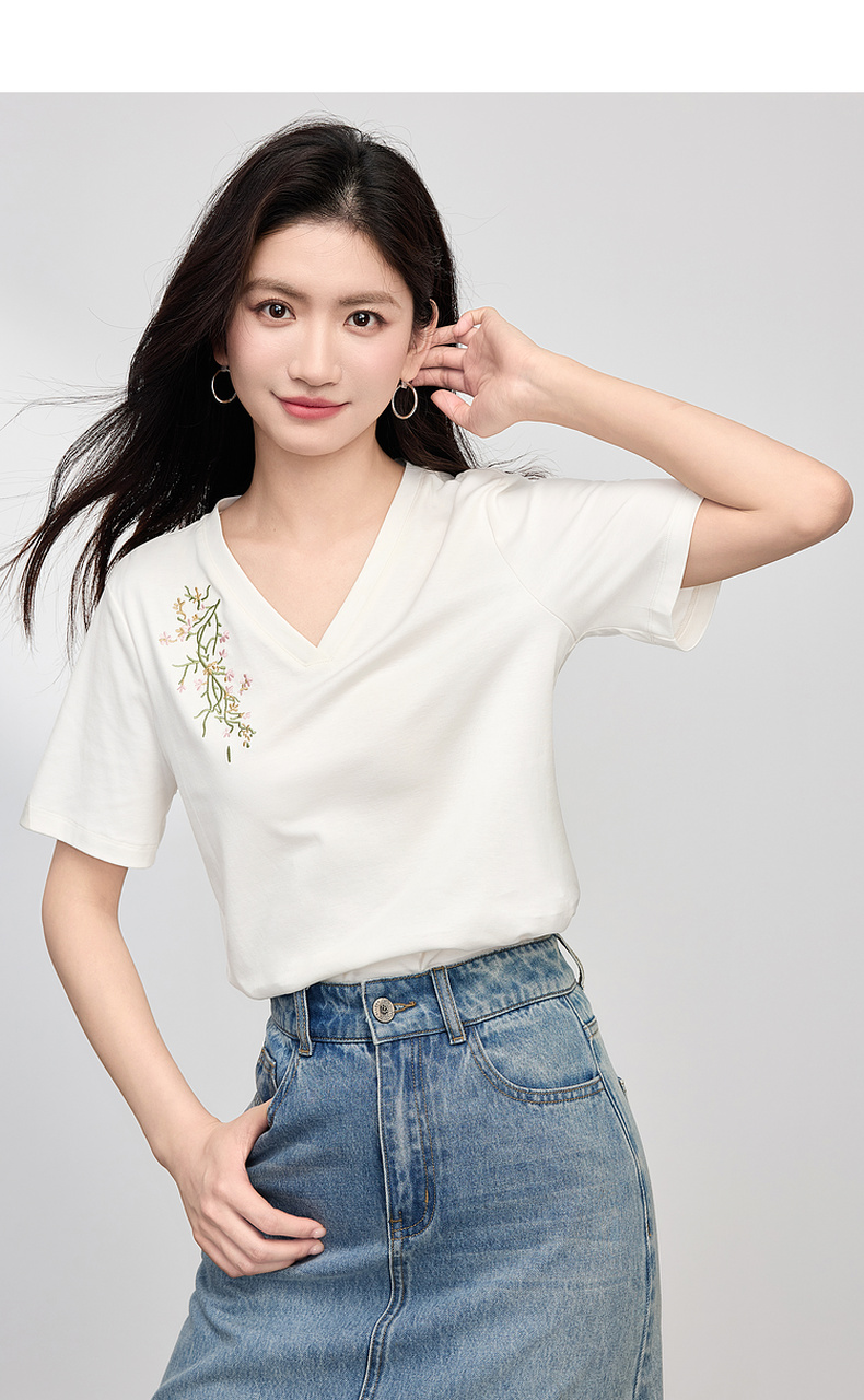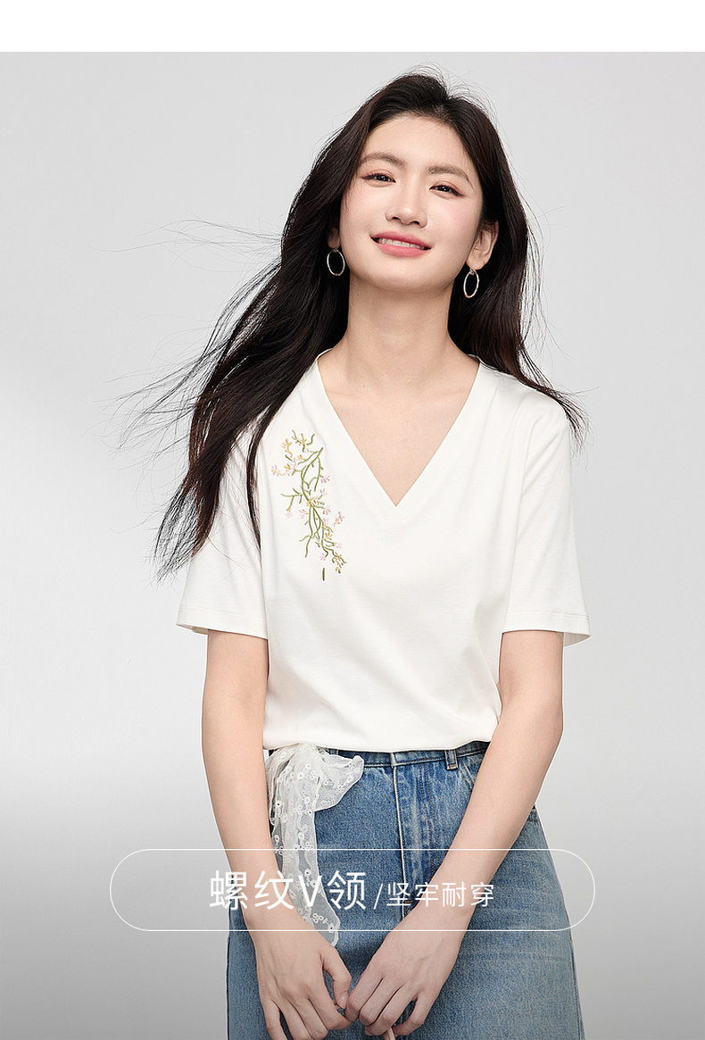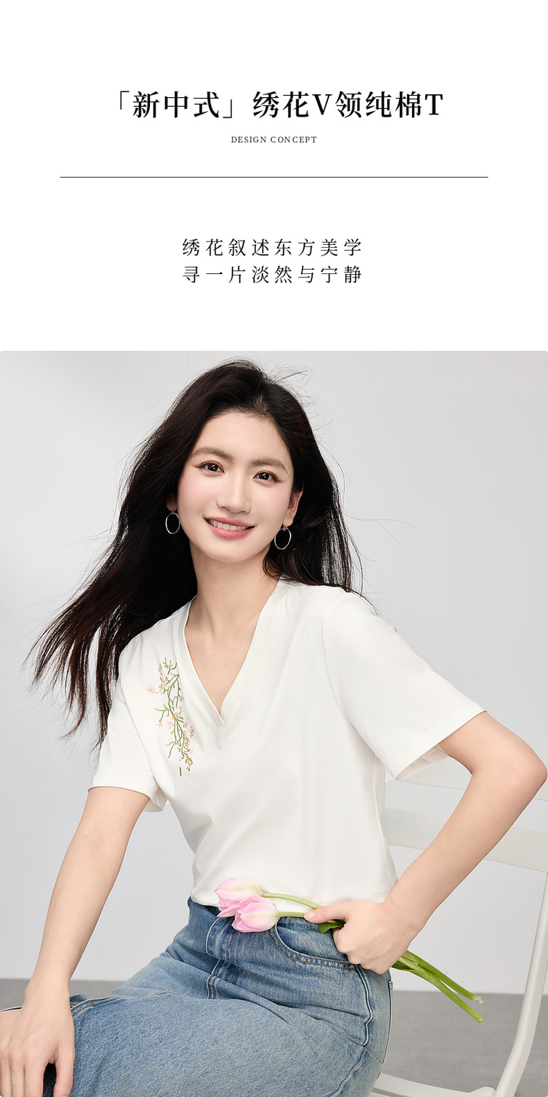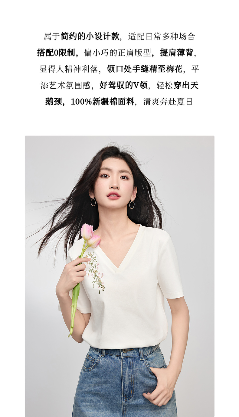 【专属特价】【纯棉100%】熙世界简约百搭T恤25夏新款V领梅花刺绣女提肩显瘦休闲上衣