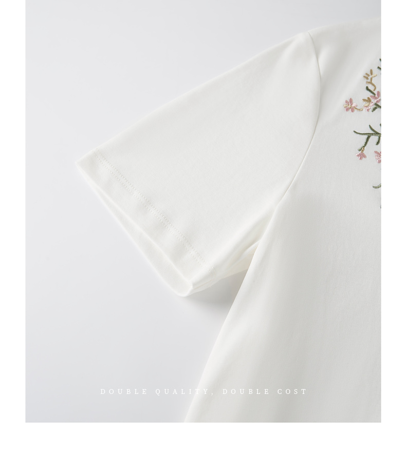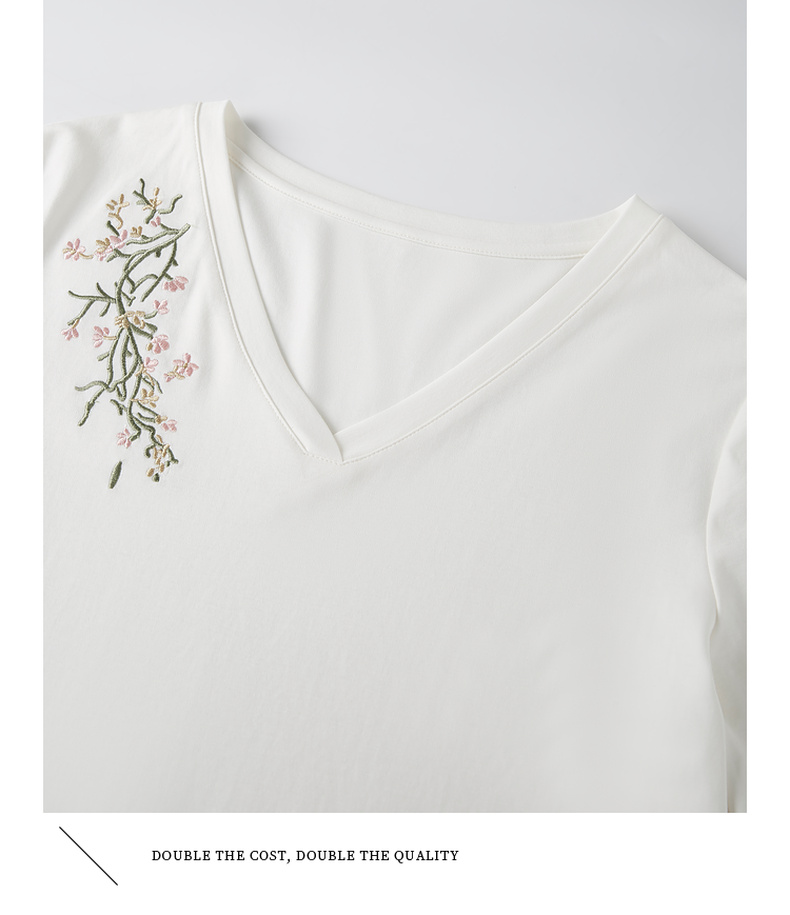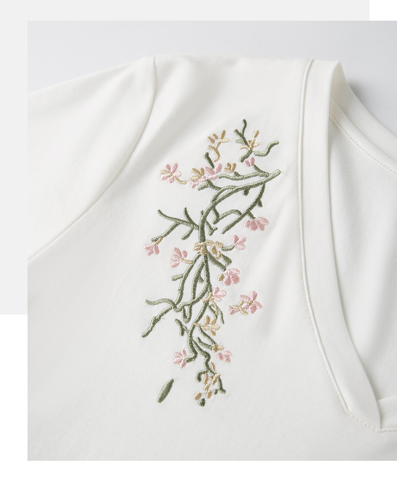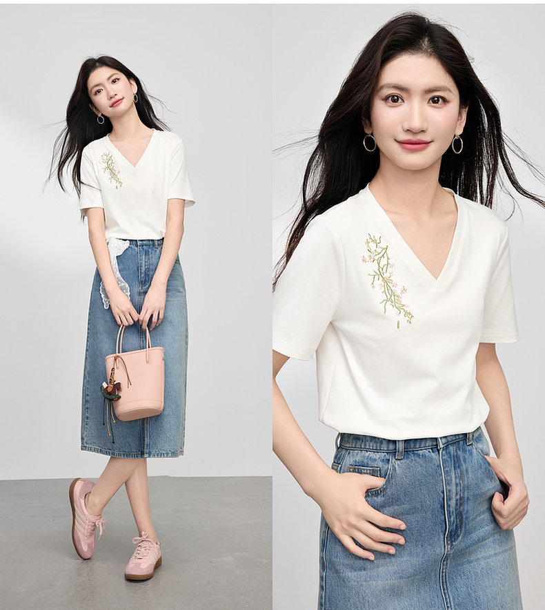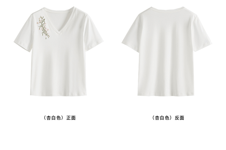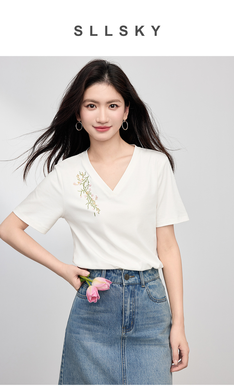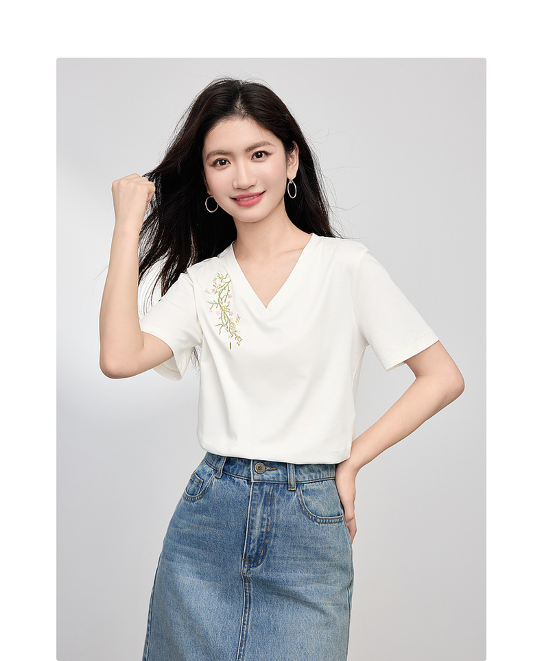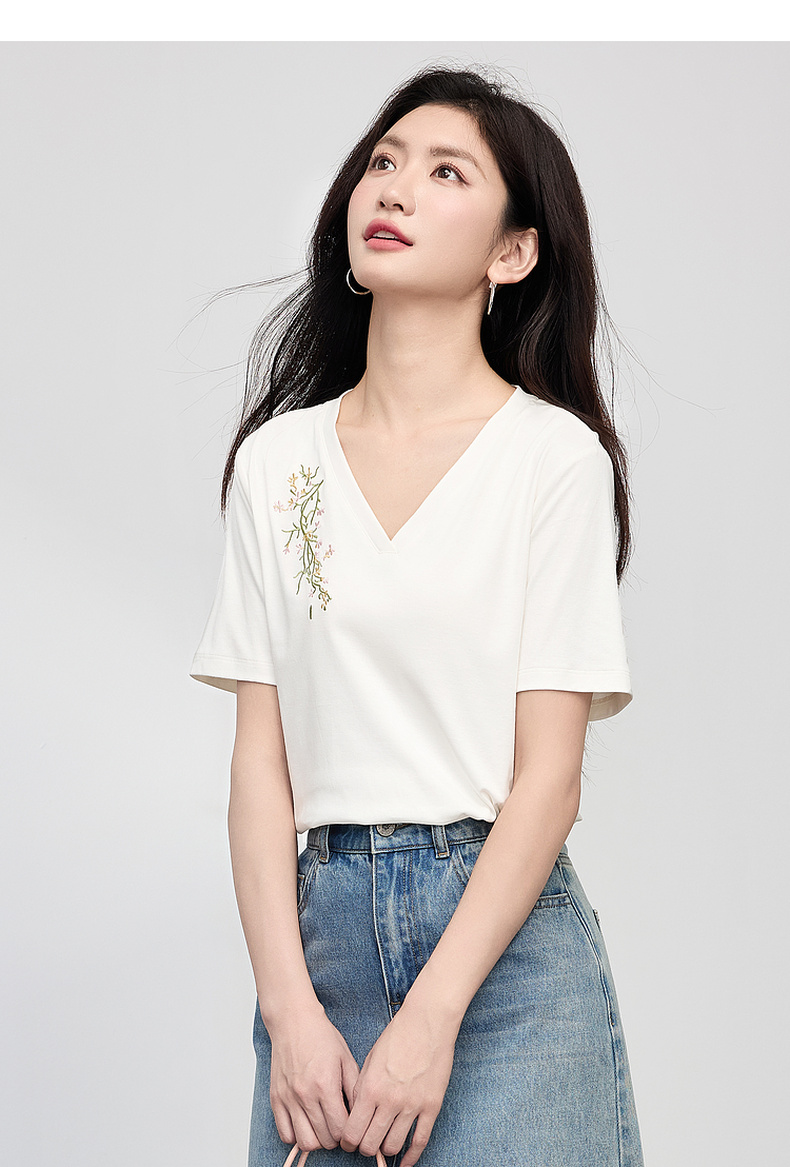 【专属特价】【纯棉100%】熙世界简约百搭T恤25夏新款V领梅花刺绣女提肩显瘦休闲上衣