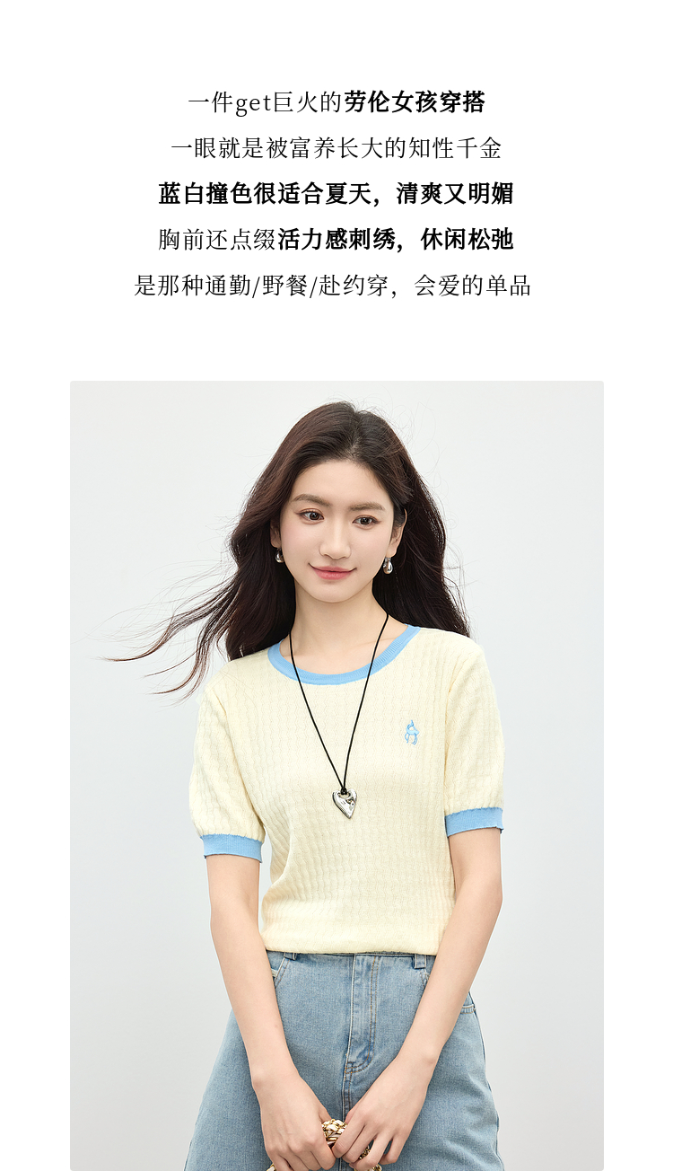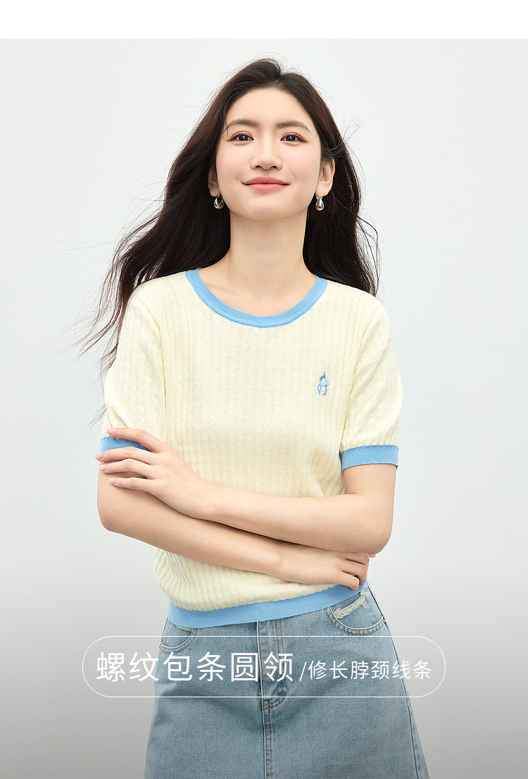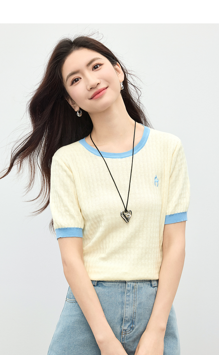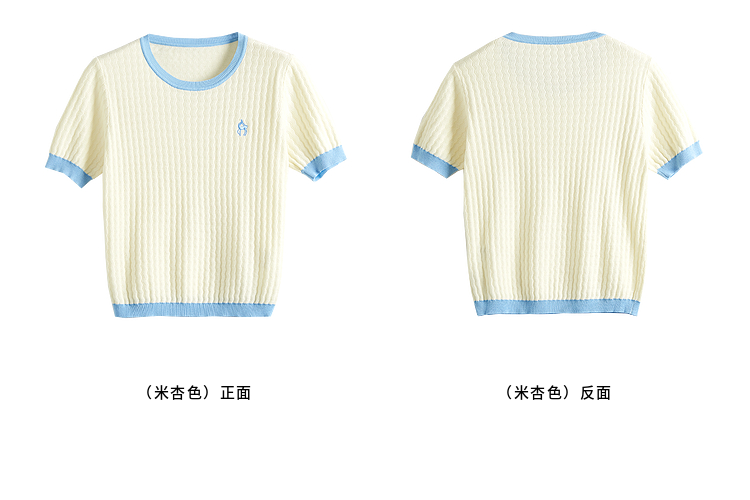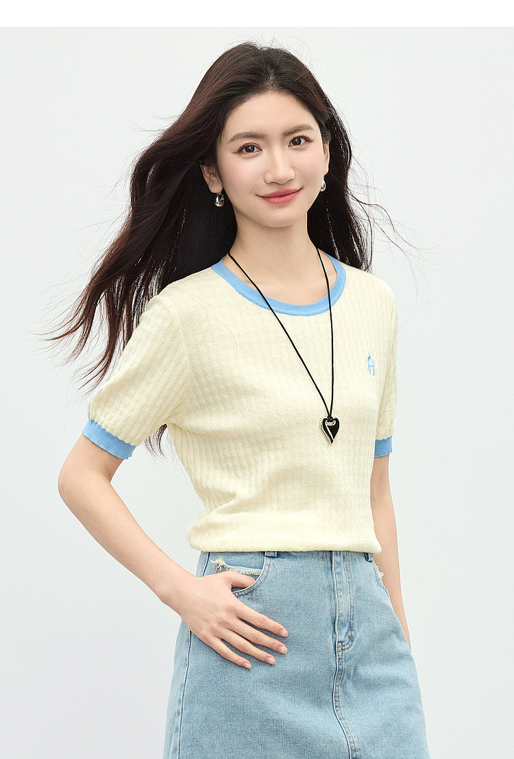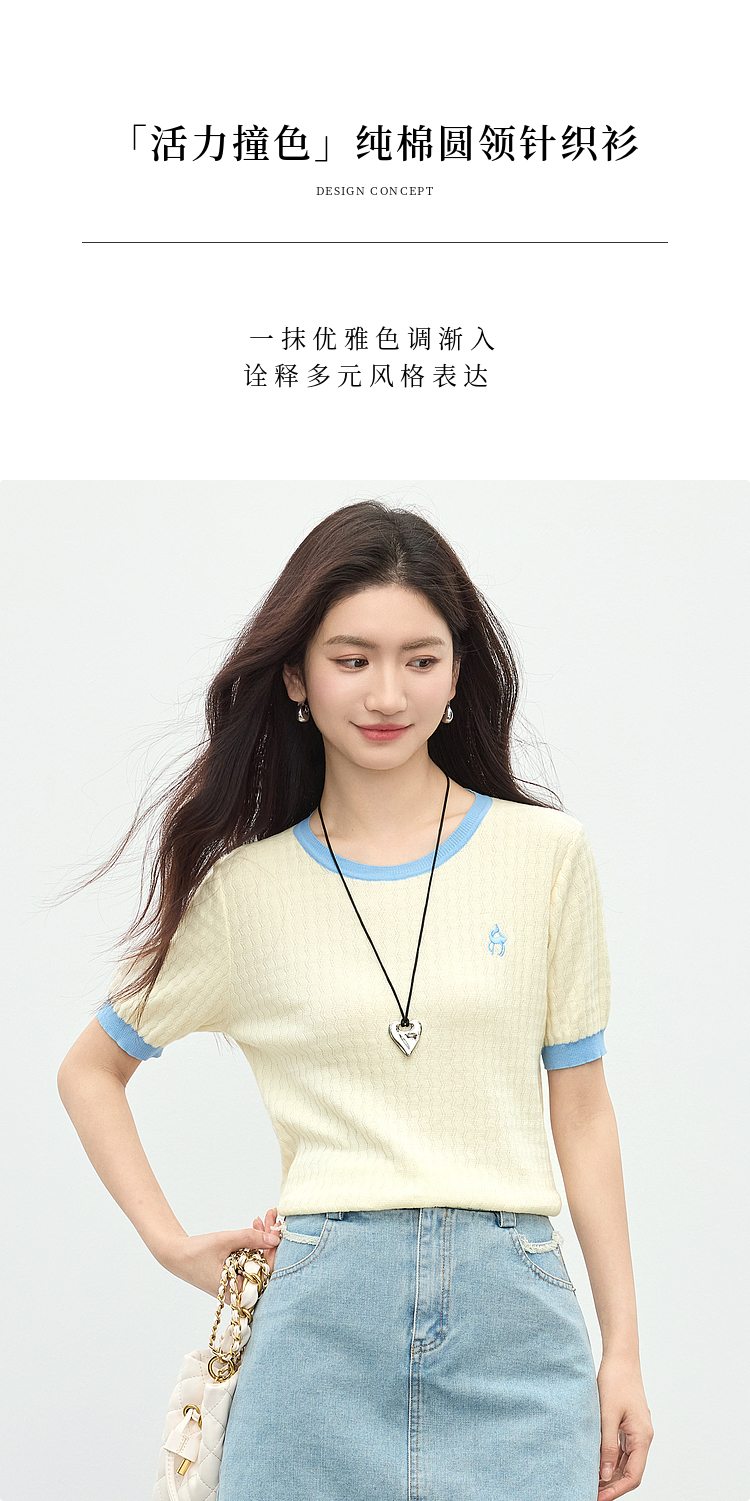 【专属特价】熙世界100%匹马棉针织短袖T恤女正肩设计感撞色圆领上衣2025夏天