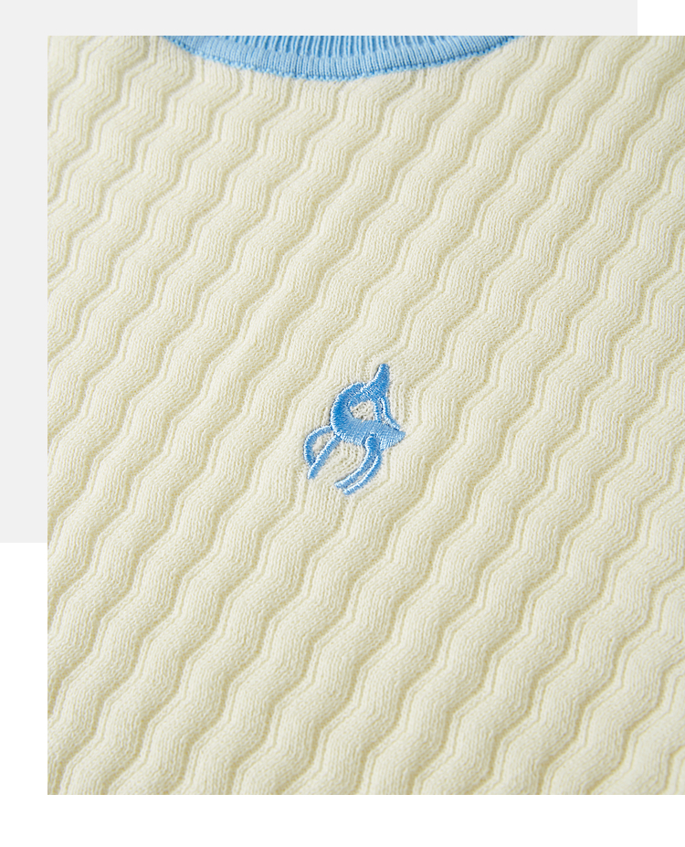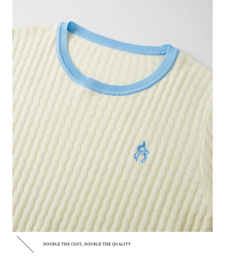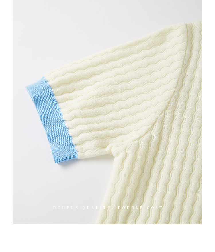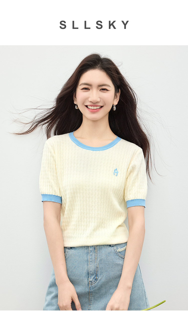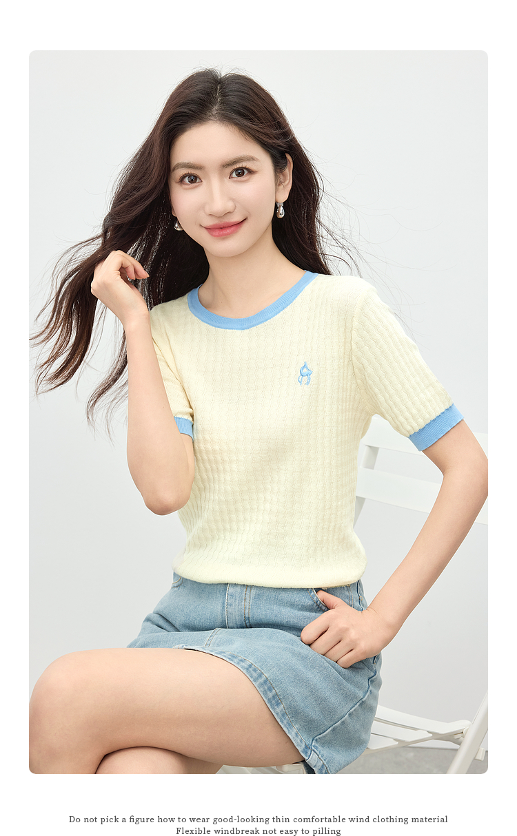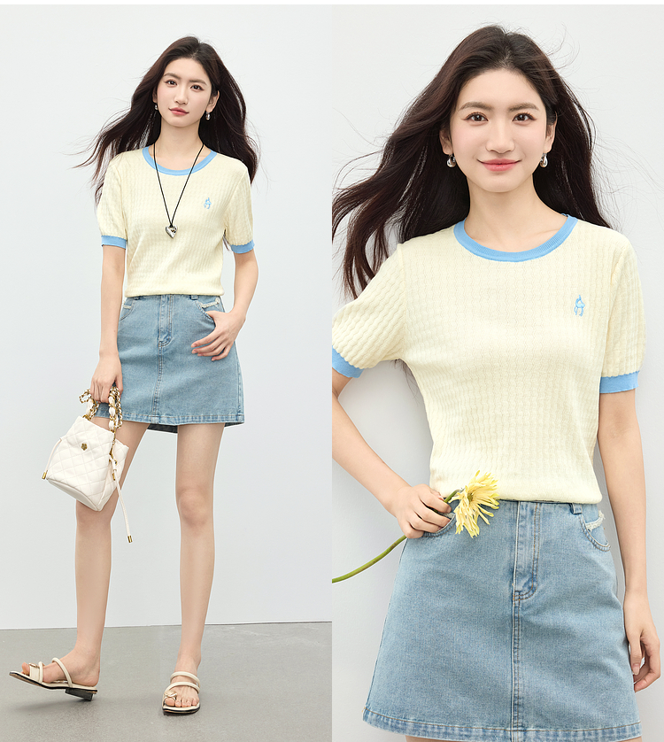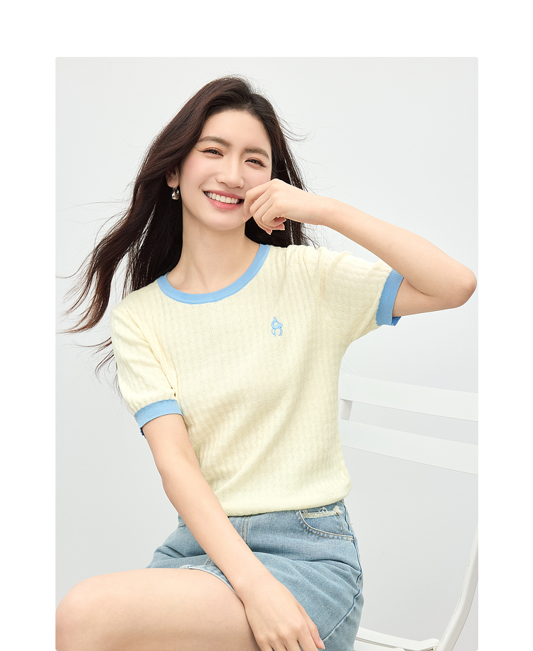 【专属特价】熙世界100%匹马棉针织短袖T恤女正肩设计感撞色圆领上衣2025夏天