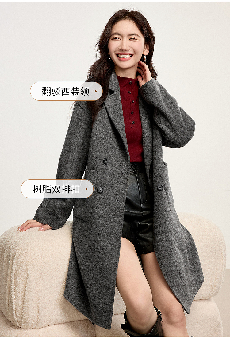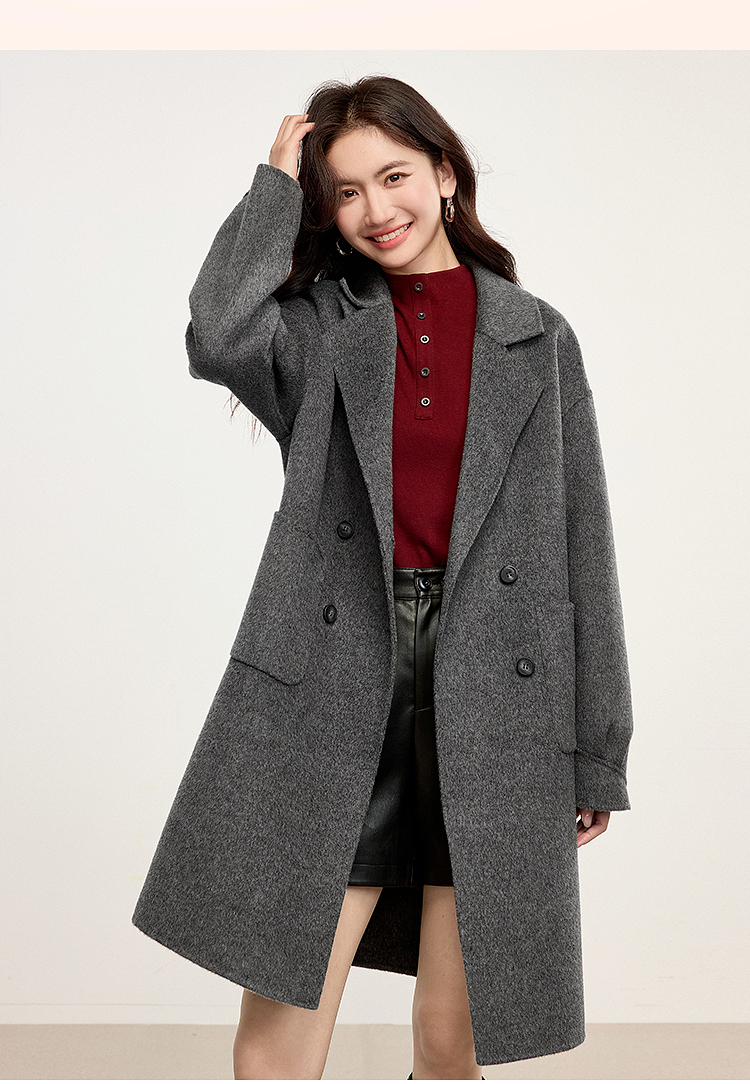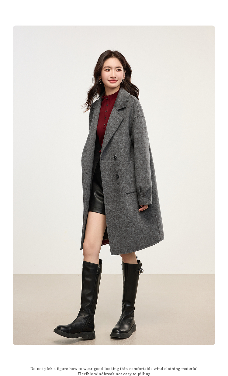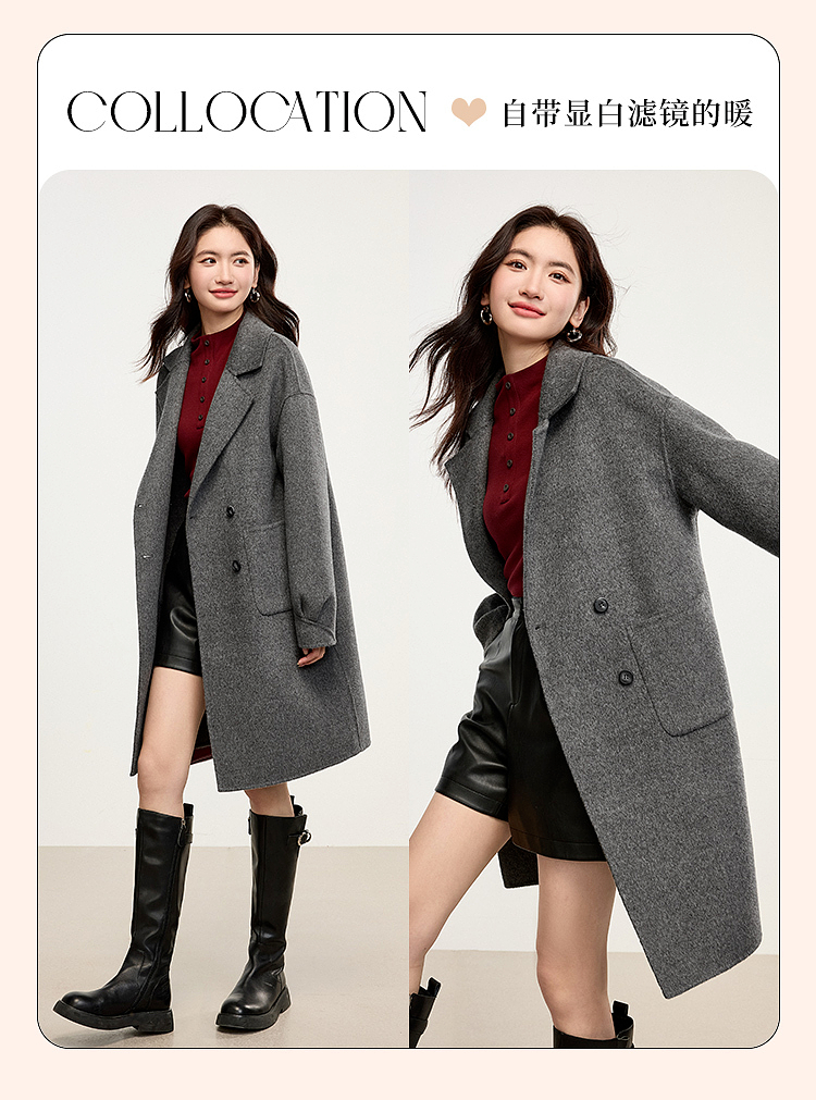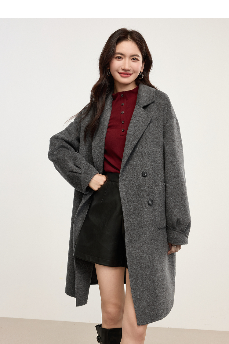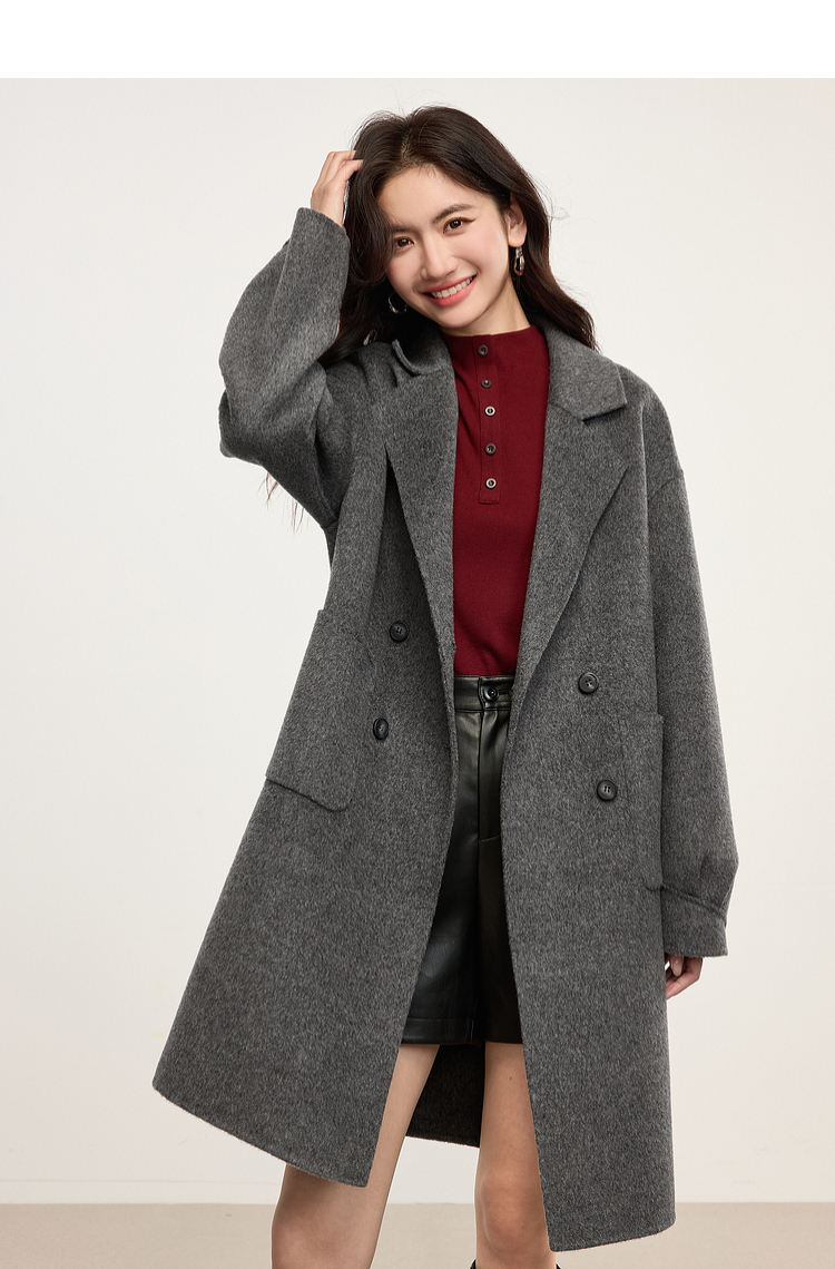 【年终特卖】熙世界翻驳领双面呢羊毛大衣女中长款冬季新款高级感灰色毛呢外套