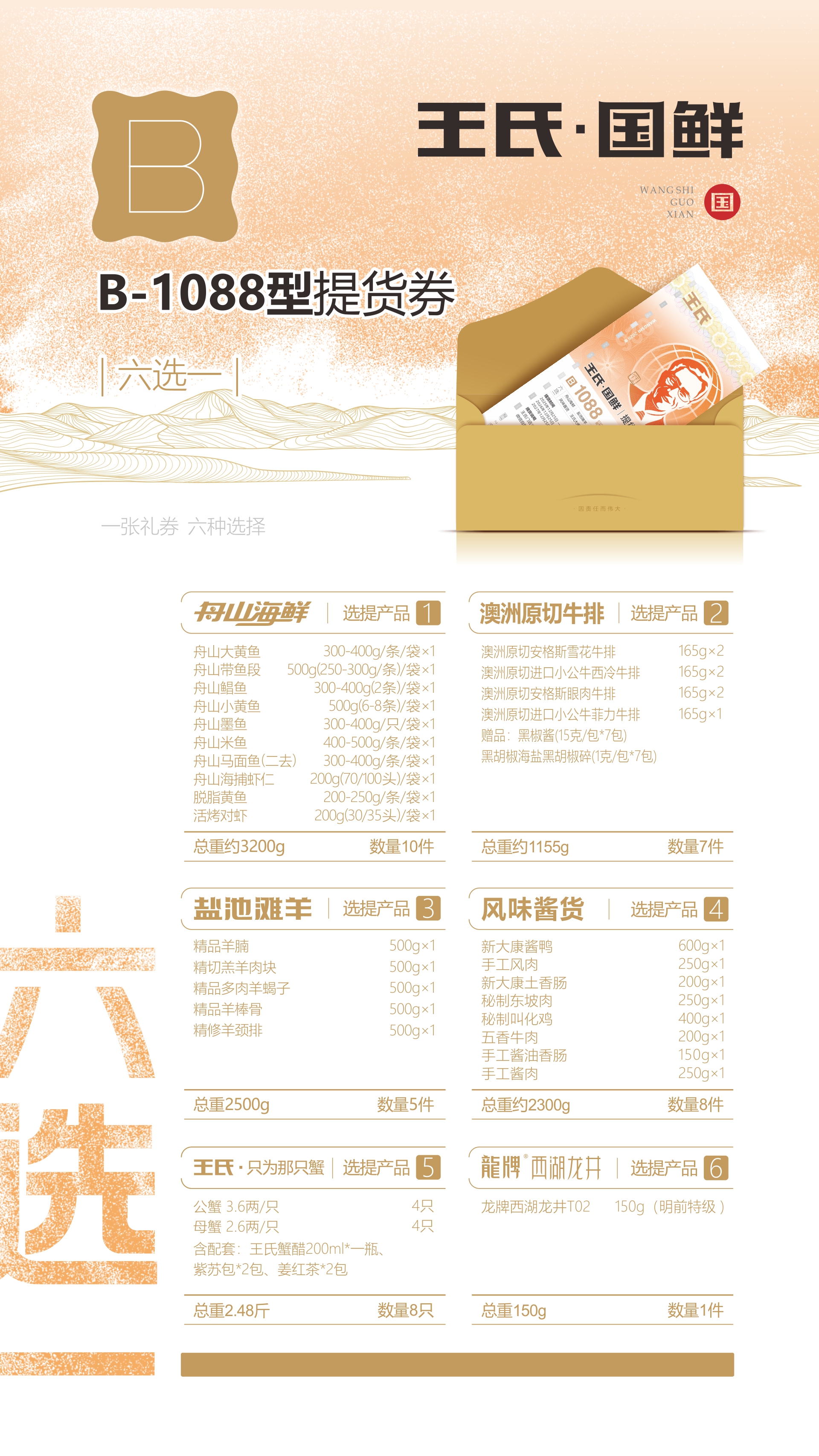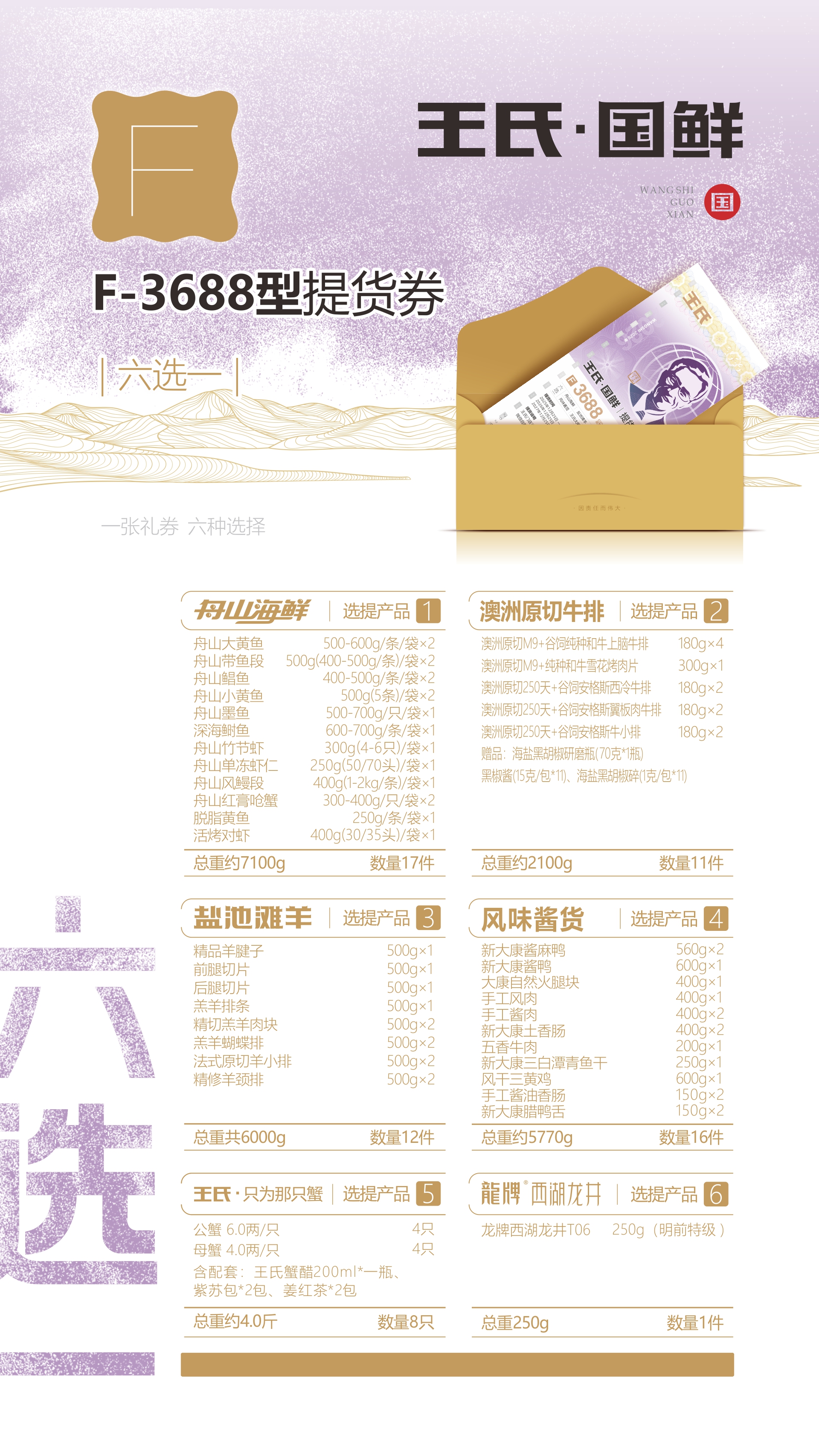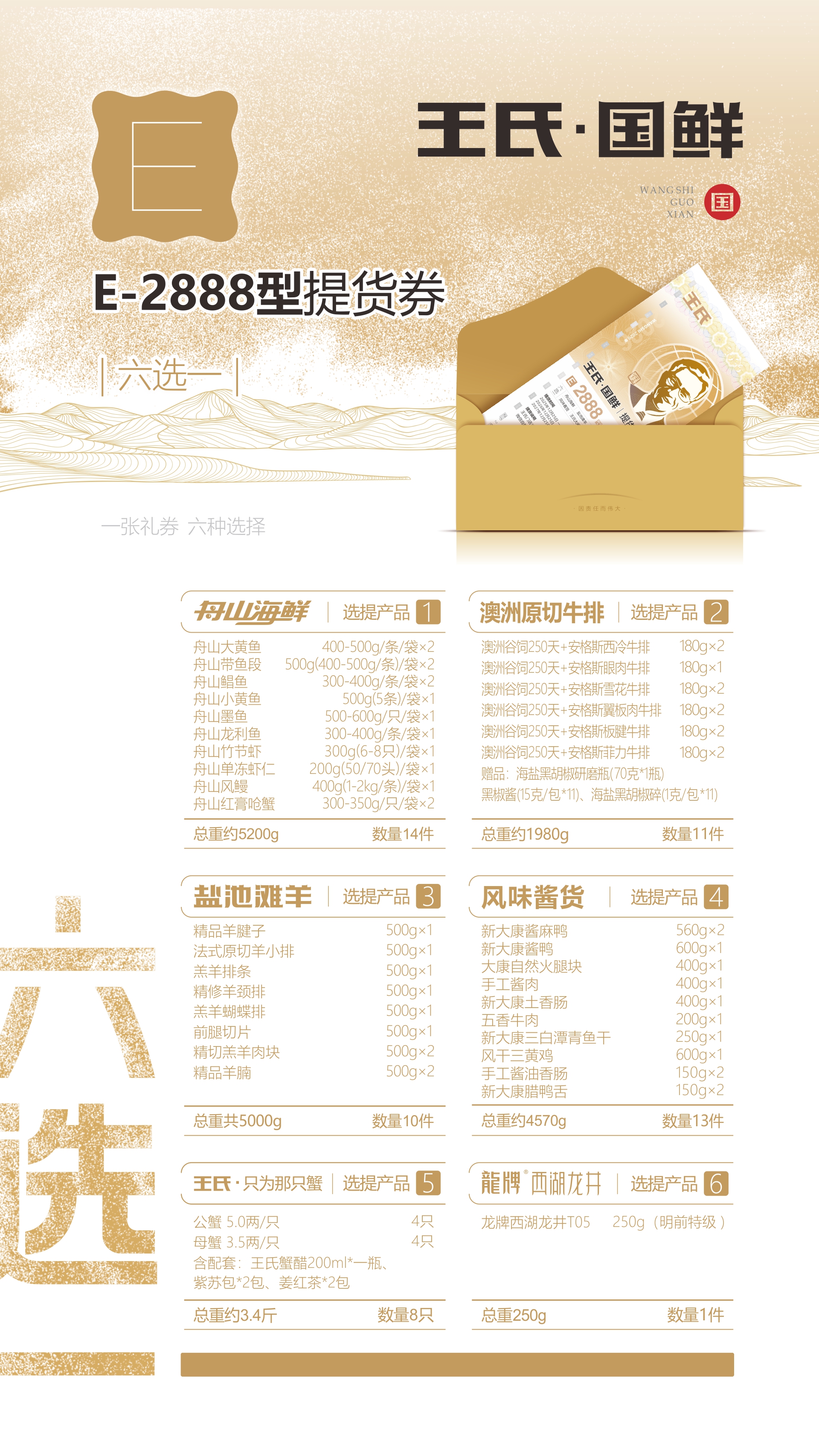 今年,王氏“2026国鲜·六选一”系列如期而至,带来舟山海鲜、盐池滩羊、澳洲原切牛排、新大康风味酱货、王氏大闸蟹与龙牌西湖龙井六大经典品类。目前,“每满生活”平台已上线B、C、D、E、F五款国鲜提货券,下单可享受2.75折优惠。
