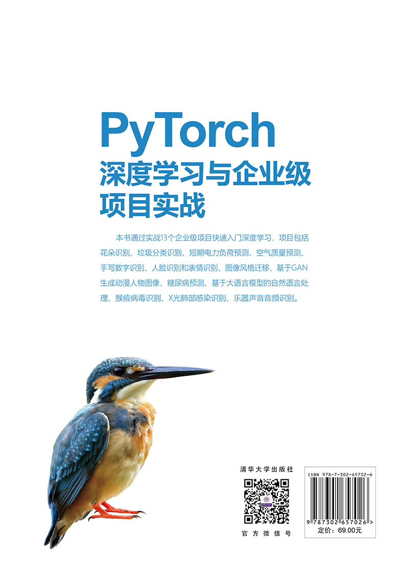 本书共分18章,内容主要包括人工智能、机器学习和深度学习之间的关系,深度学习框架PyTorch 2.0的环境搭建,Python数据科学库,深度学习基本原理,PyTorch 2.0入门,以及13个实战项目:迁移学习花朵识别、垃圾分类识别、短期电力负荷预测、空气质量预测、手写数字识别、人脸识别与面部表情识别、图像风格迁移、糖尿病预测、基于GAN 生成动漫人物画像、基于大语言模型的NLP、猴痘病毒识别项目实战、X光肺部感染识别项目实战、乐器声音音频识别项目实战。