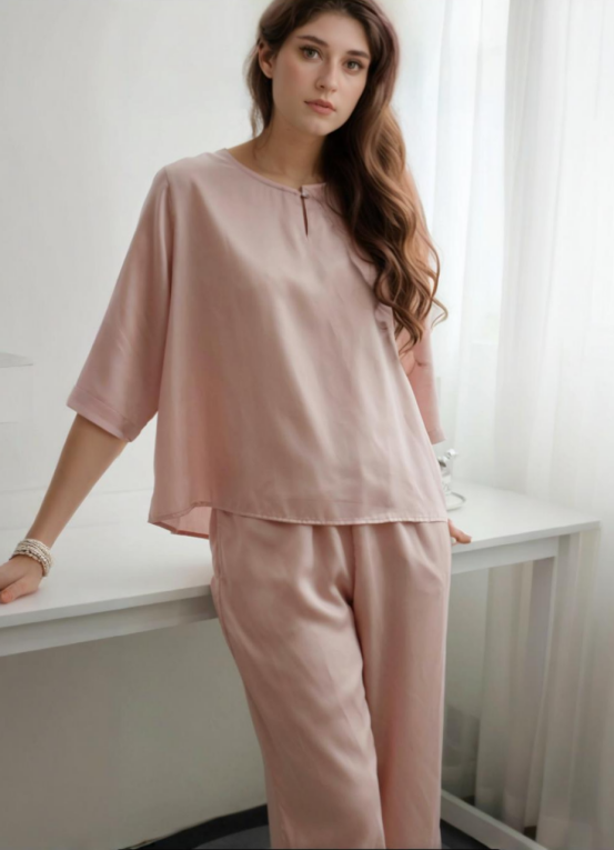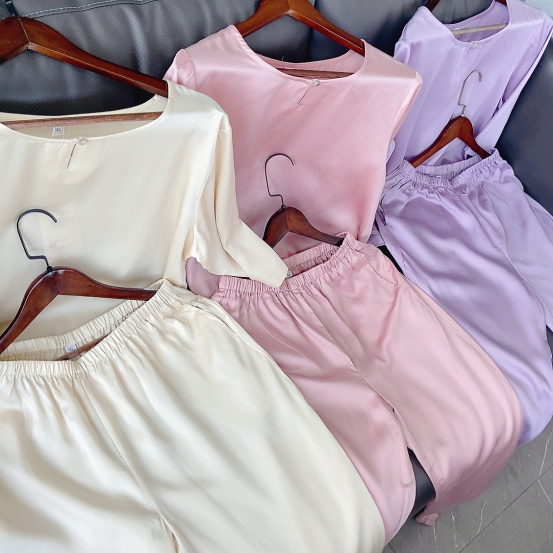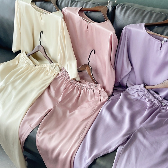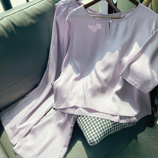 天丝面料超级轻薄,透气很好~它比一般的莱赛尔纤维面料更细腻、更光滑,看下它表面的光泽感像丝绸一样,摸着有一种凉凉的感觉 舒爽天丝面料+时尚宽松版型+绝美纯色设计简简单单没有多余花里胡哨的图案设计 整套却将天丝的柔顺光泽度拿捏住了轻薄顺滑舒适,摆动间尽显优雅~