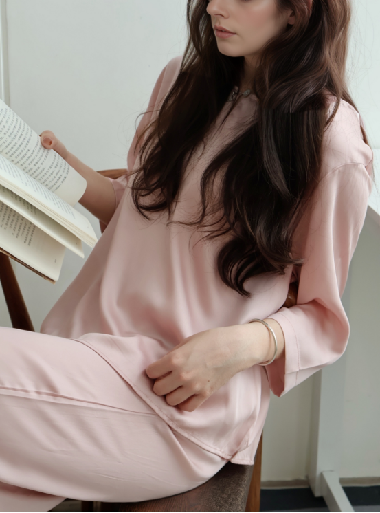 .60支高工面料 细腻、柔软、透气、亲肤 如同真丝般细腻的段光感 一眼便知贵气 却不似真丝那般娇贵 不易起球、不易勾丝、可机洗