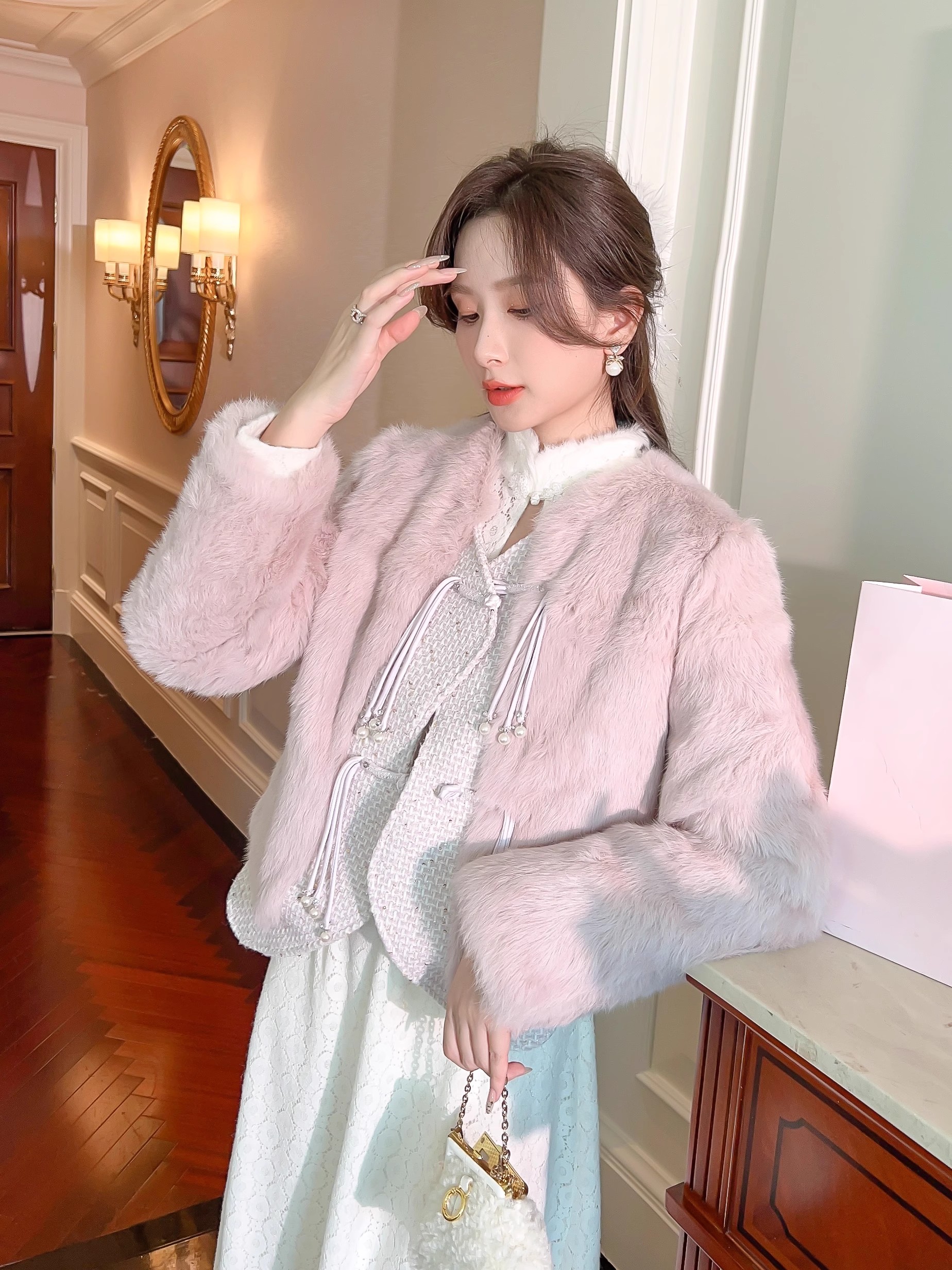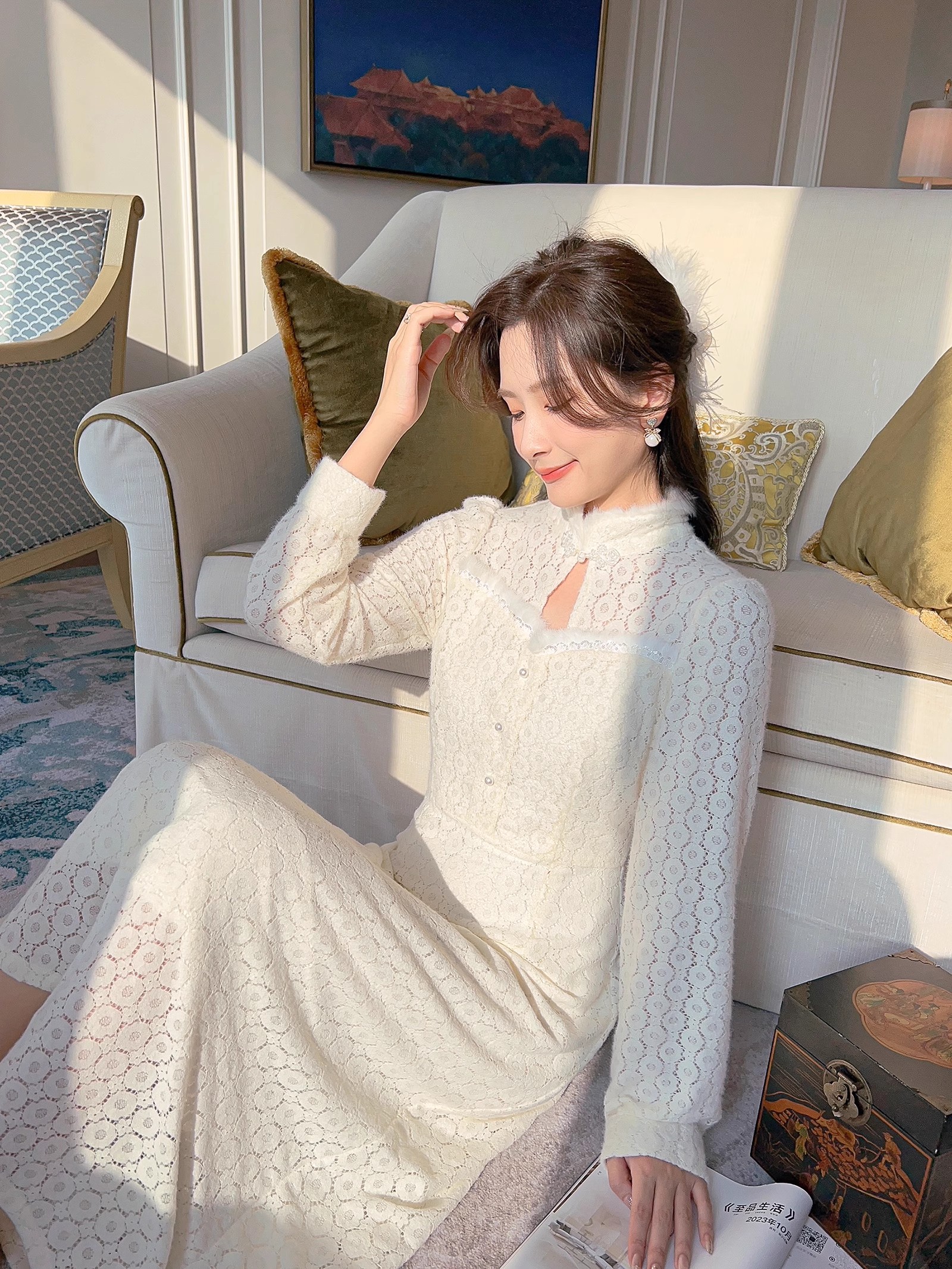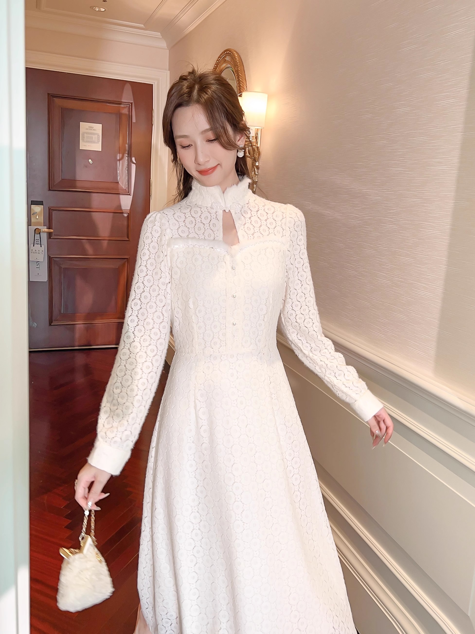 张心子【香颂白茶】温柔风法式加绒连衣裙女秋冬新款仙气裙子长裙 U2310154