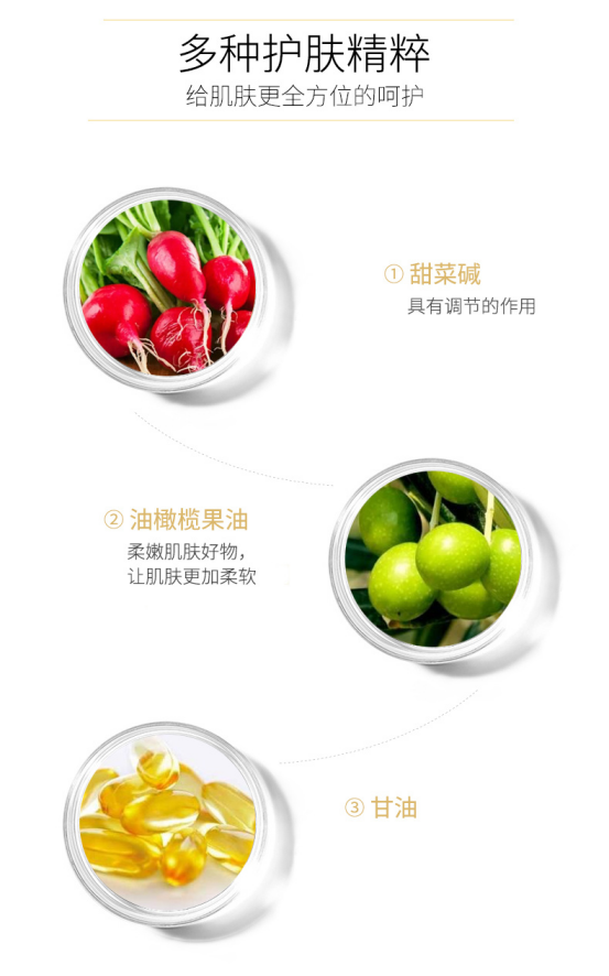 🔺甜菜碱 促进肌肤水平衡,提高肌肤弹性 还有很好的防敏感起皮效果、特别适合秋冬季❗ 🔺油橄榄果油 缓解皮肤红肿、瘙痒等炎症症状 加速肌肤细胞新陈代谢❗