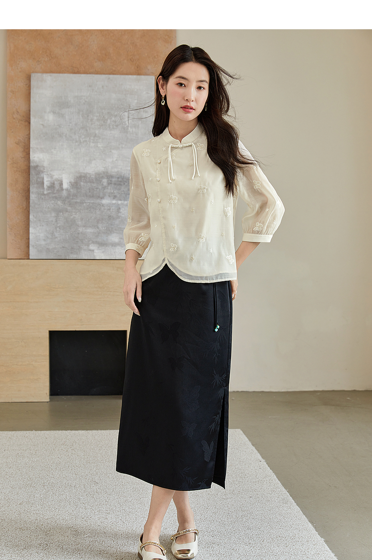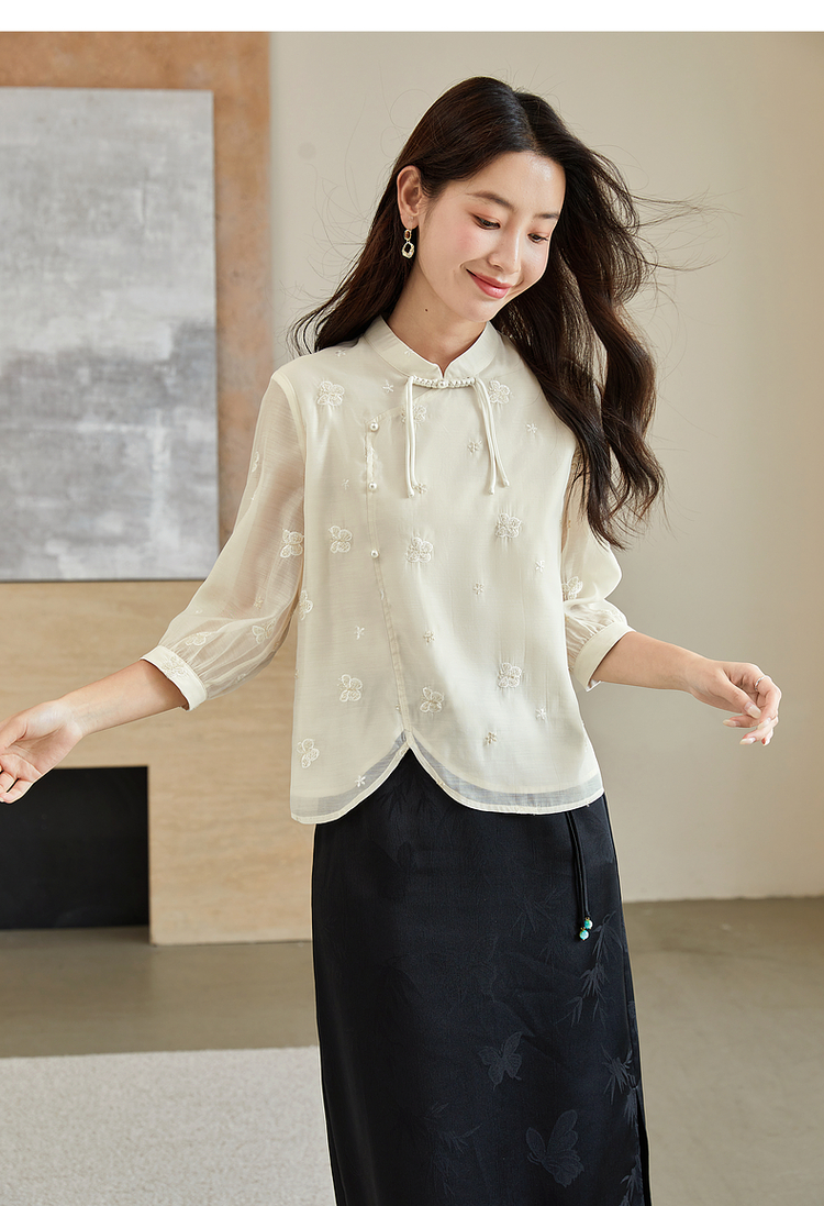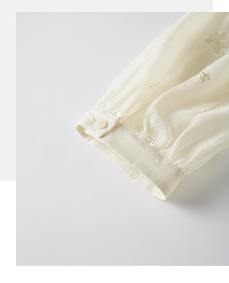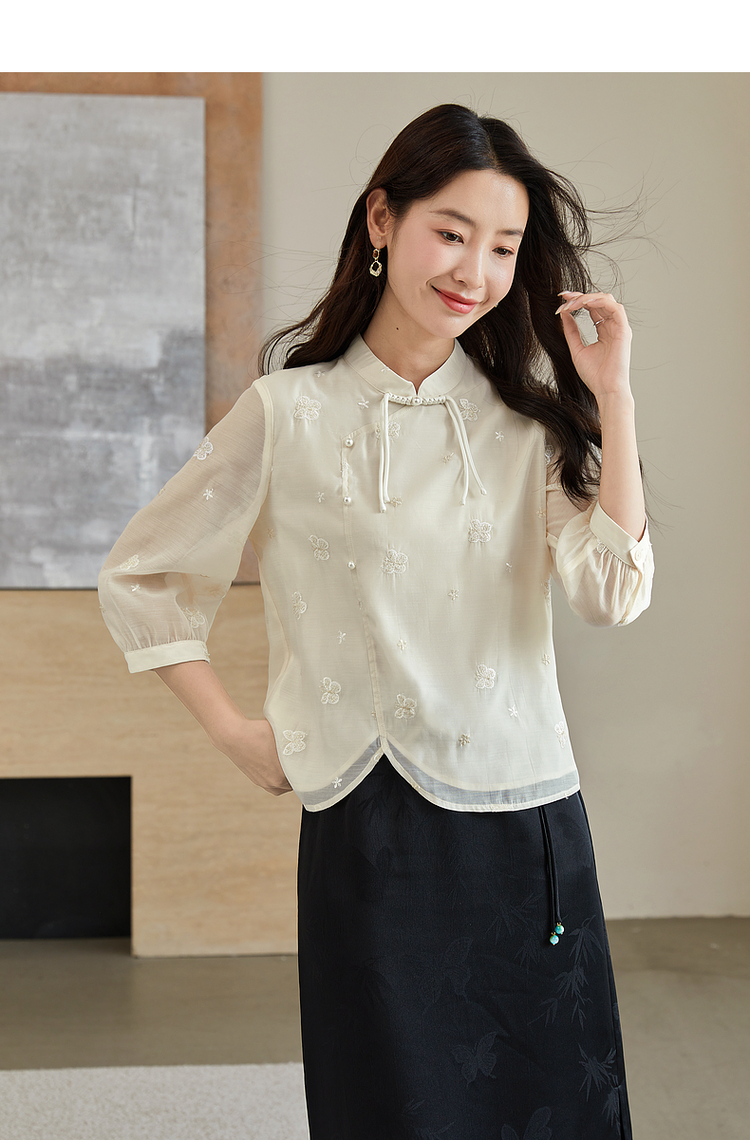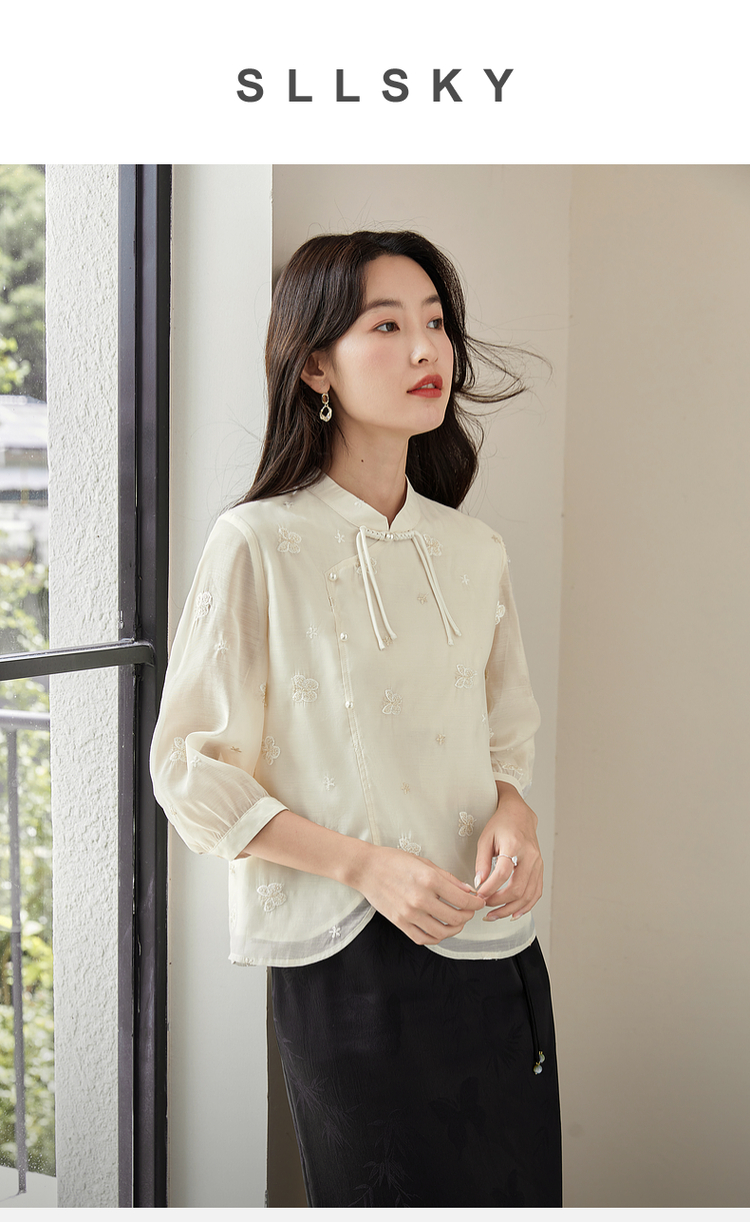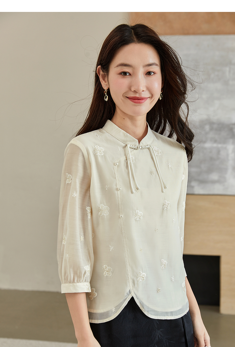 【五折购】熙世界《金缕蝶》国风新中式雪纺小衫秋季蝴蝶刺绣盘扣立领上衣