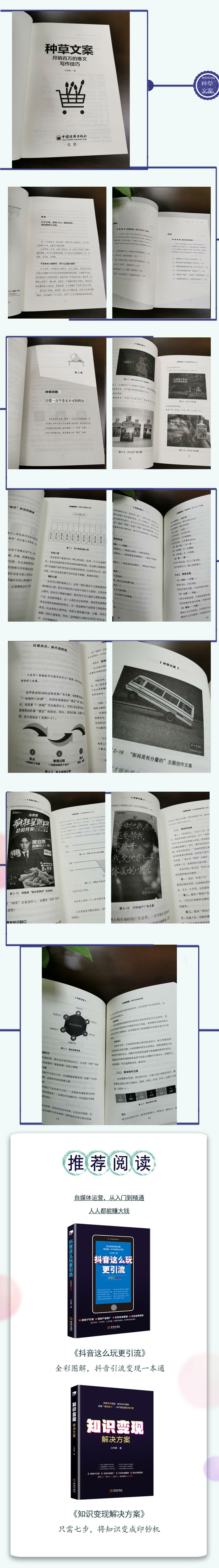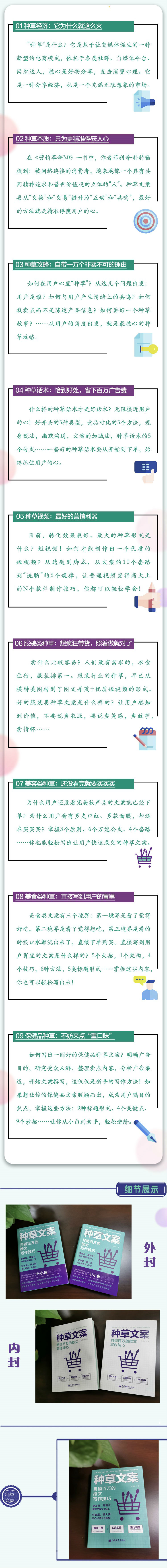 种草文案就是通过爆款文案,把好物卖出去。本书内容全部取材于各类平台网红、达人、自媒体人的带货文案,解读案例,提炼方法,给出步骤,同时对重点带货文案如服装、美容、美食、保健品等做进一步指导,涉及话术及视频攻略,图文并茂,专业落地,简单易学,两个小时看懂带货套路,多种推文技巧拿来就用,好物分享快速高效变现。本书适合各平台自媒体人、网红、达人、素人,广告从业者,企业营销/销售人士阅读使用。
