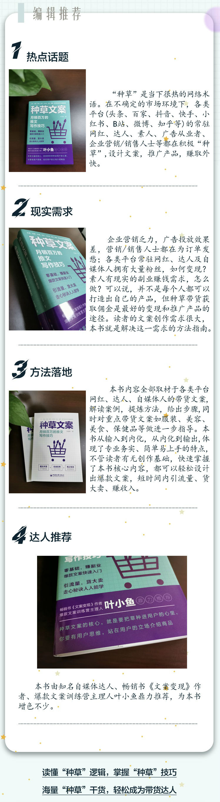 4.达人推荐。本书由知名自媒体达人、畅销书《文案变现》作者、爆款文案训练营主理人叶小鱼鼎力推荐,为本书增色不少。