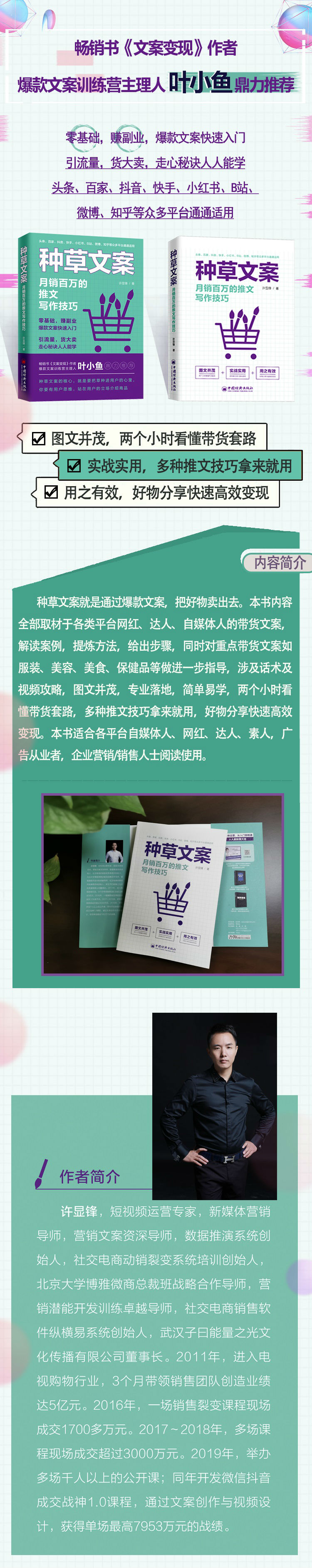 许显锋,短视频运营专家,新媒体营销导师,营销文案资深导师,数据推演系统创始人,社交电商动销裂变系统培训创始人,北京大学博雅微商总裁班战略合作导师,营销潜能开发训练卓越导师,社交电商销售软件纵横易系统创始人,武汉子曰能量之光文化传播有限公司董事长。2011年,进入电视购物行业,3个月带领销售团队创造业绩达5亿元。2016年,一场销售裂变课程现场成交1700多万元。2017~2018年,多场课程现场成交超过3000万元。2019年,举办多场千人以上的公开课;同年开发微信抖音成交战神1.0课程,通过文案创作与视频设计,获得单场7953万元的战绩。