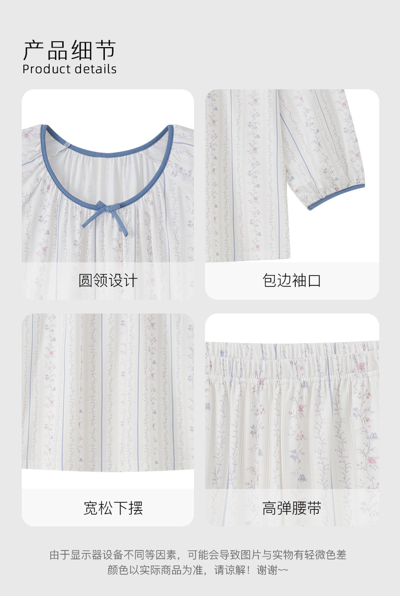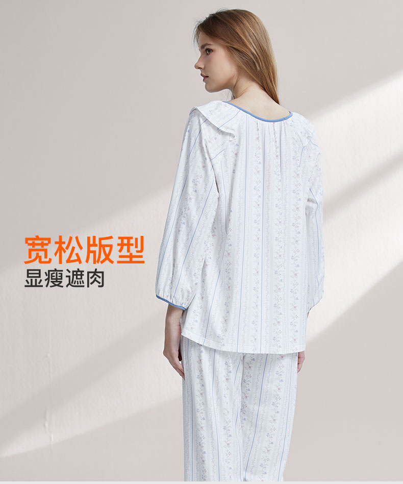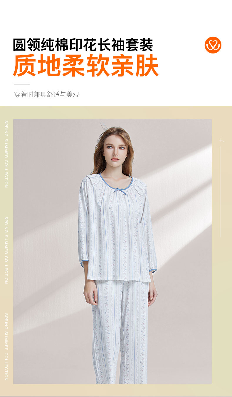 【7.5折限时特惠】【秀黛】女圆领印花长袖套装棉拉架柔软亲肤透气清新竖条纹田园小碎花开衫休闲女士春秋睡衣家居服W1551002T【门店同款】