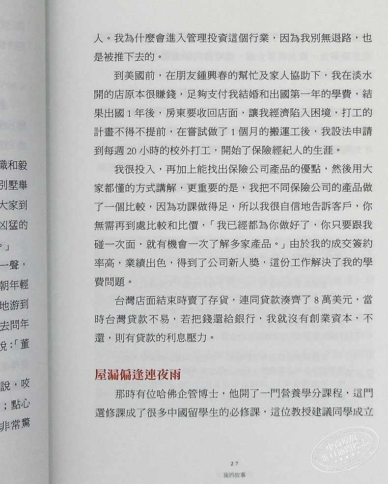 1985年赴美,現為財務規畫師(CFP)、美國又上成長基金經理人,因感慨「華爾街不缺資金,但缺東方人面孔」,於是成立少數華人在美國立案的共同基金。近30年的投資管理生涯,歷經幾次重大股災及美股失落10年的挫敗,失敗後再成功的經驗彌足珍貴。