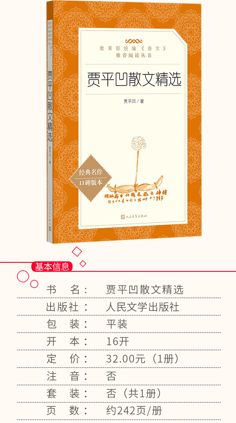 贾平凹散文精选 人民文学出版社 部编版统编丛书 中小学语文自主阅读名著书目课本教材学校集 经典名著口碑版本