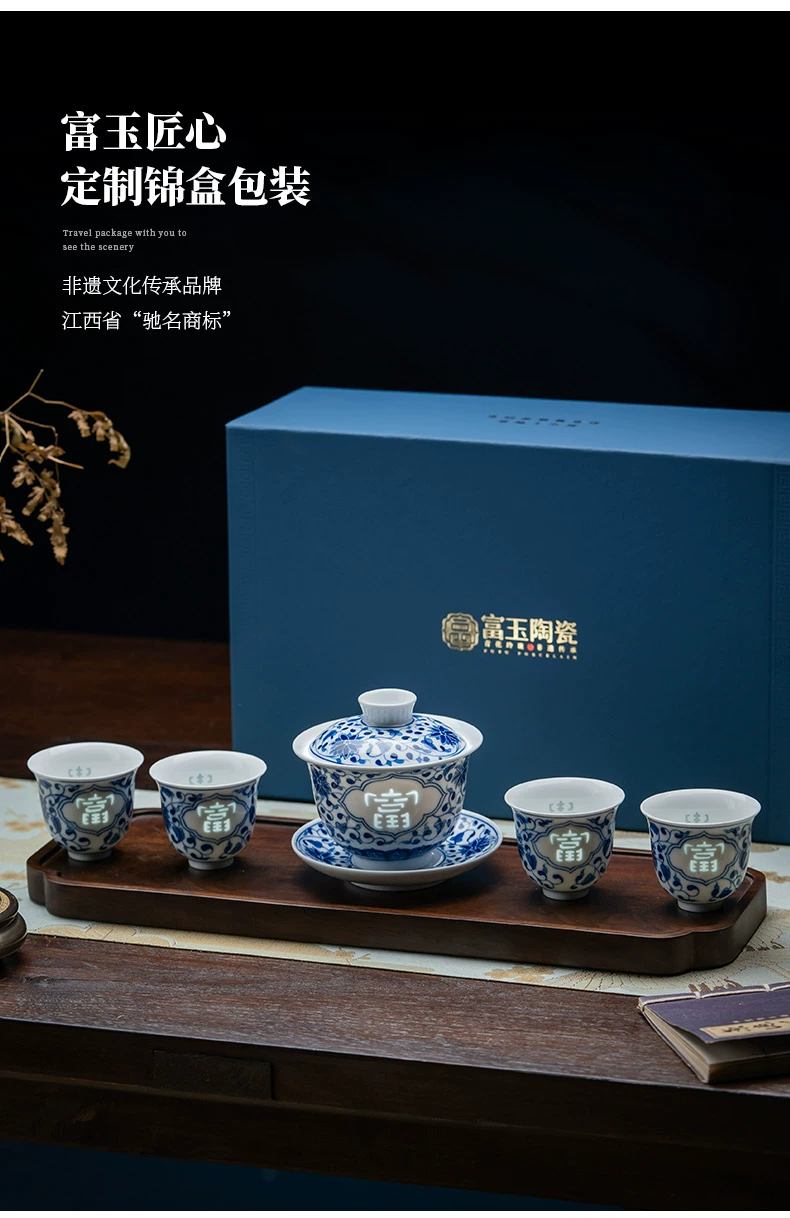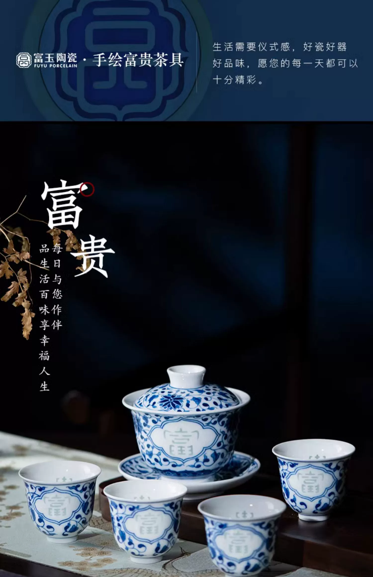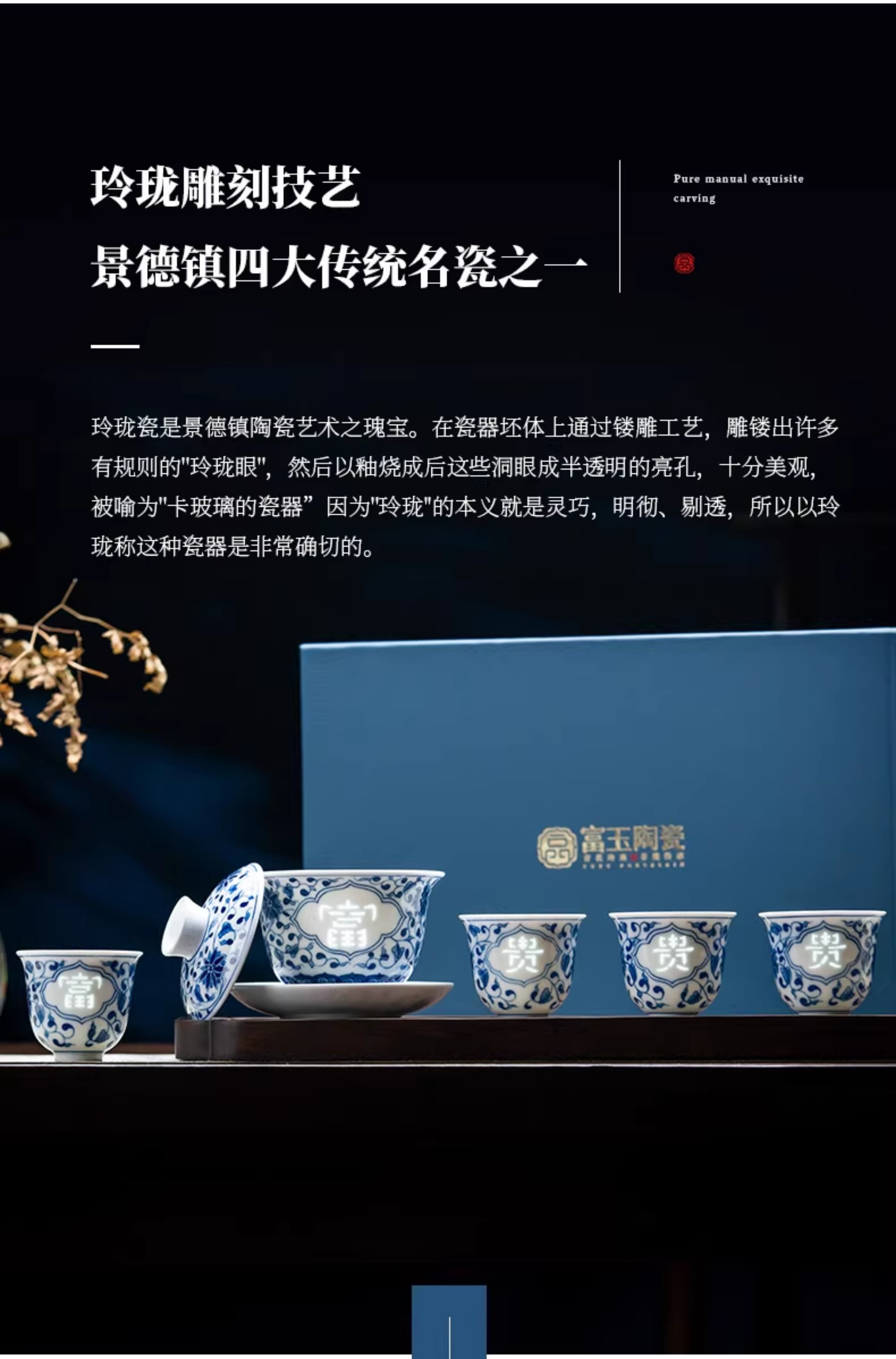 富玉 景德镇玲珑瓷组合功夫茶具手绘富贵5头茶具