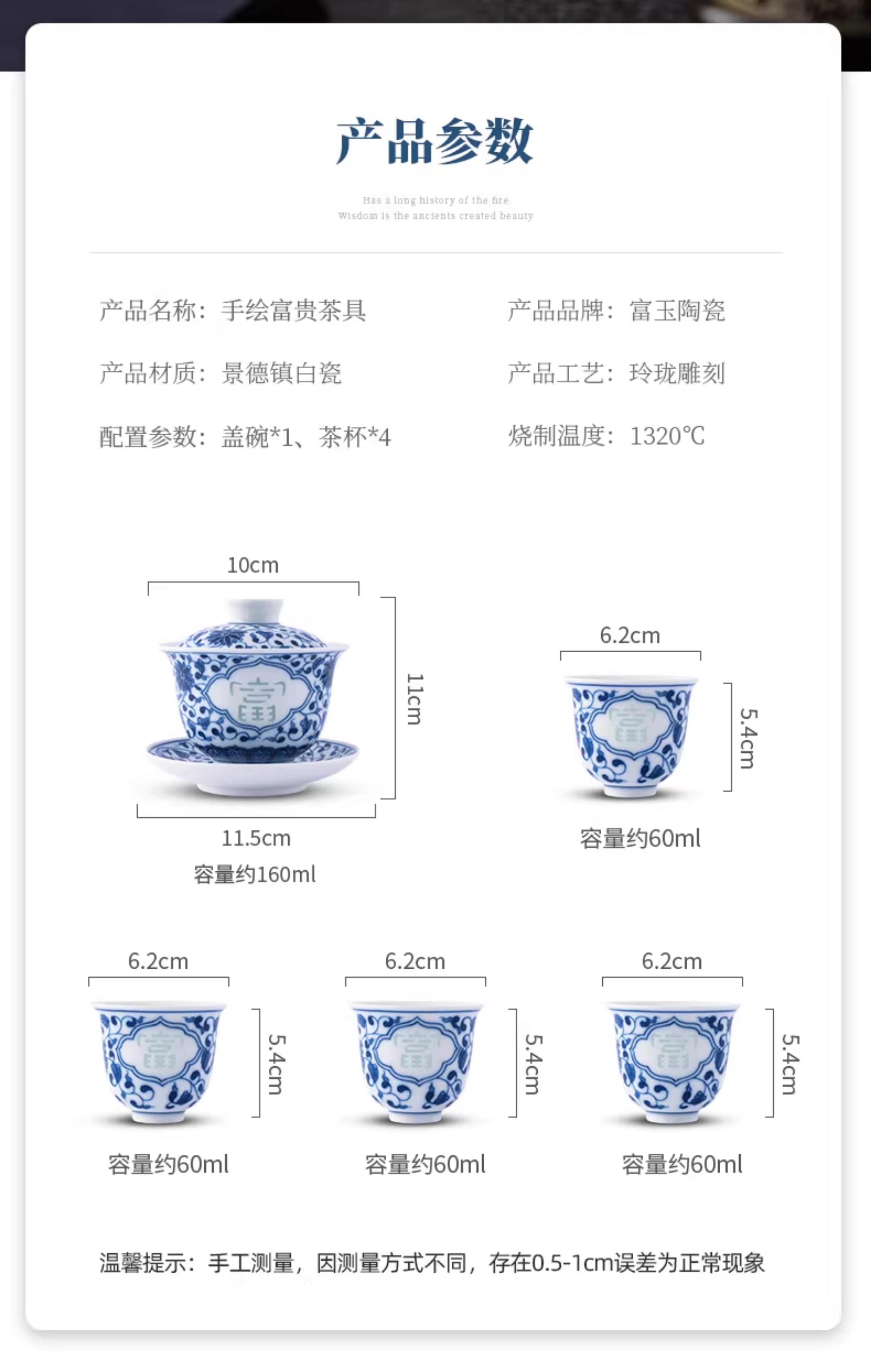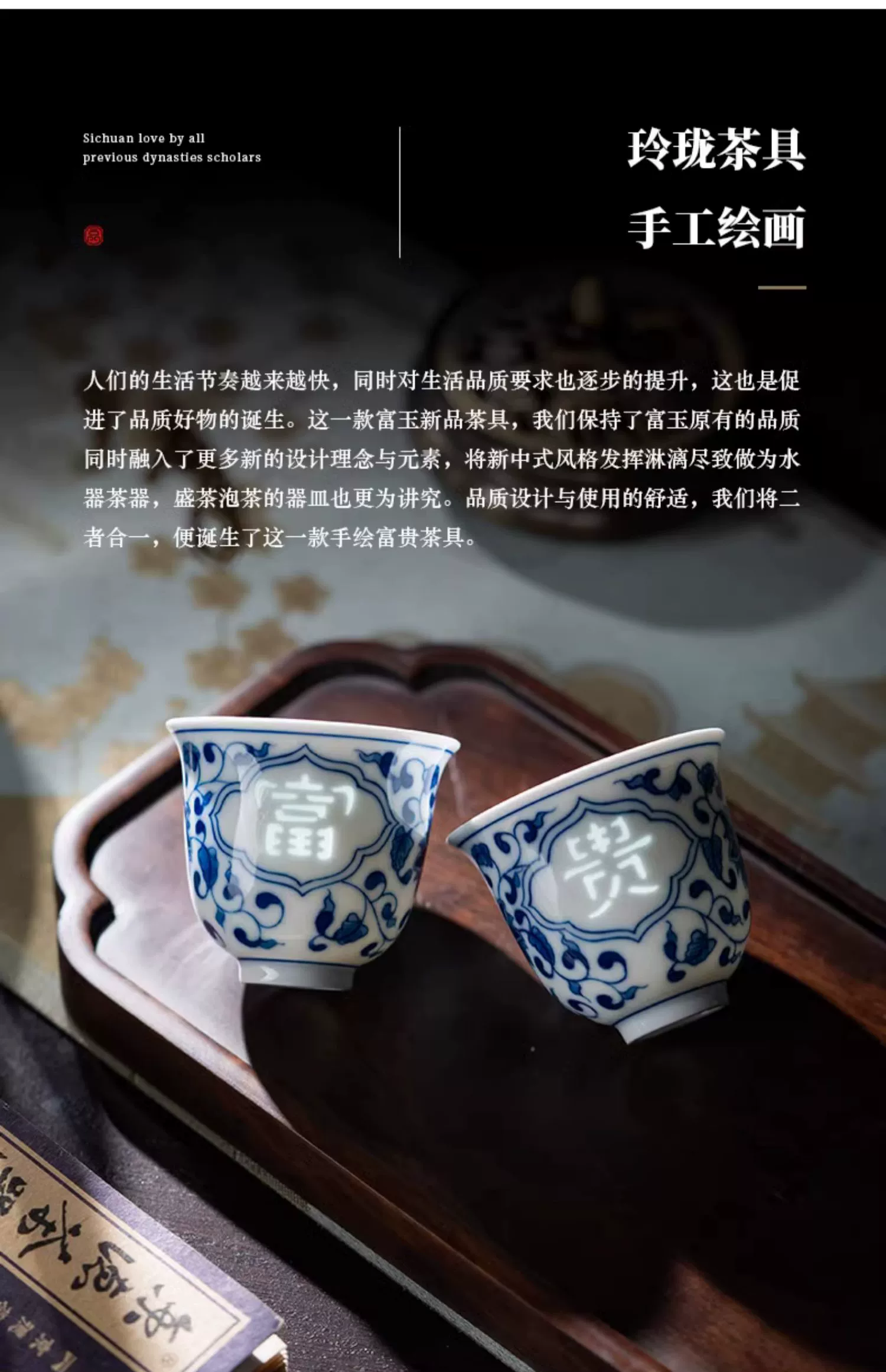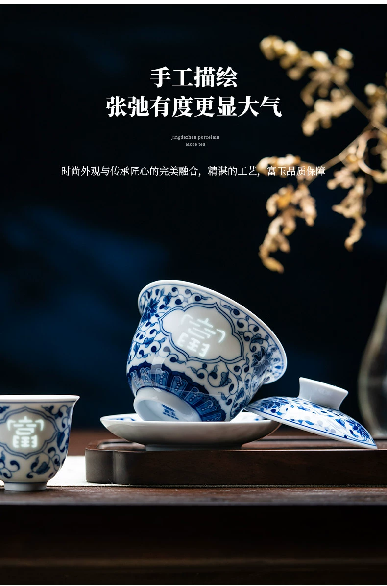 富玉 景德镇玲珑瓷组合功夫茶具手绘富贵5头茶具