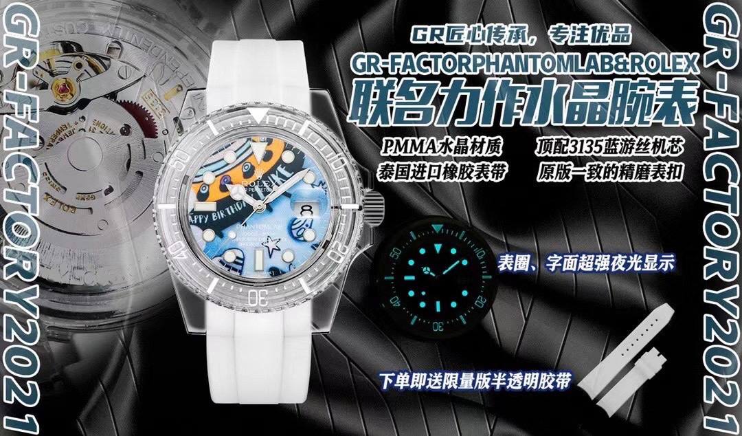 GR-Factory 2021新款🔥PHANTOMLAB&ROLEX联名力作水晶系列腕表来袭!颠覆传统概念!采用PMMA水晶材质!3135蓝游丝机芯!市场好的泰国进口橡胶表带,永不变黄