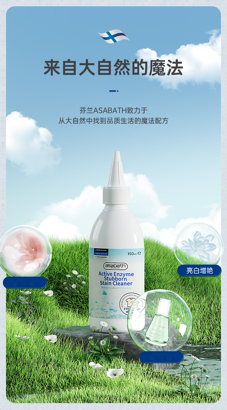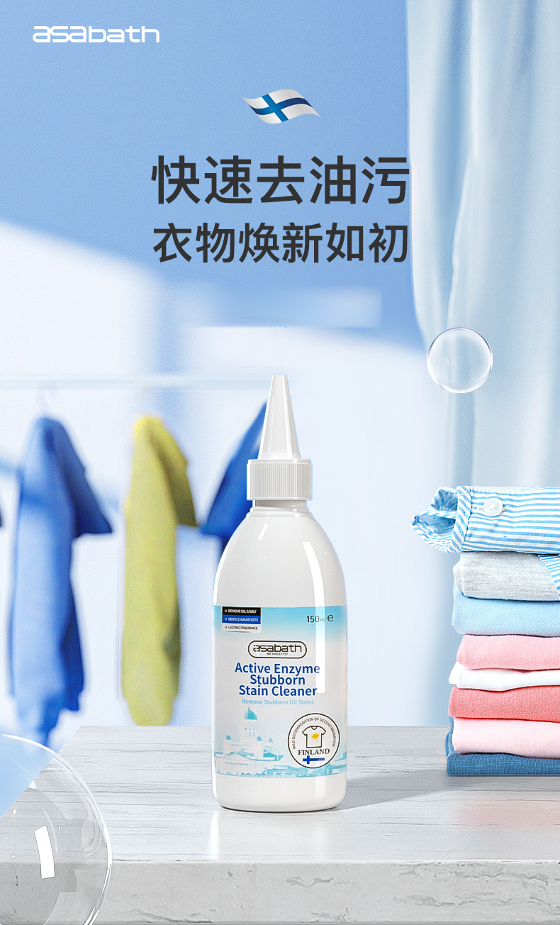 【芬兰品牌】asabath·活性酶顽渍净 强力瓦解6大顽固污渍 天然植萃配方 多衣物面料适用 不伤色 150ml/瓶