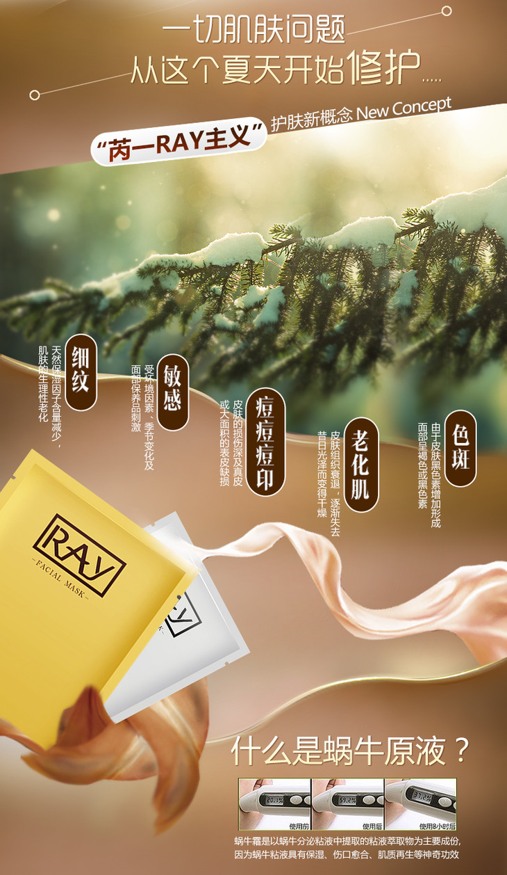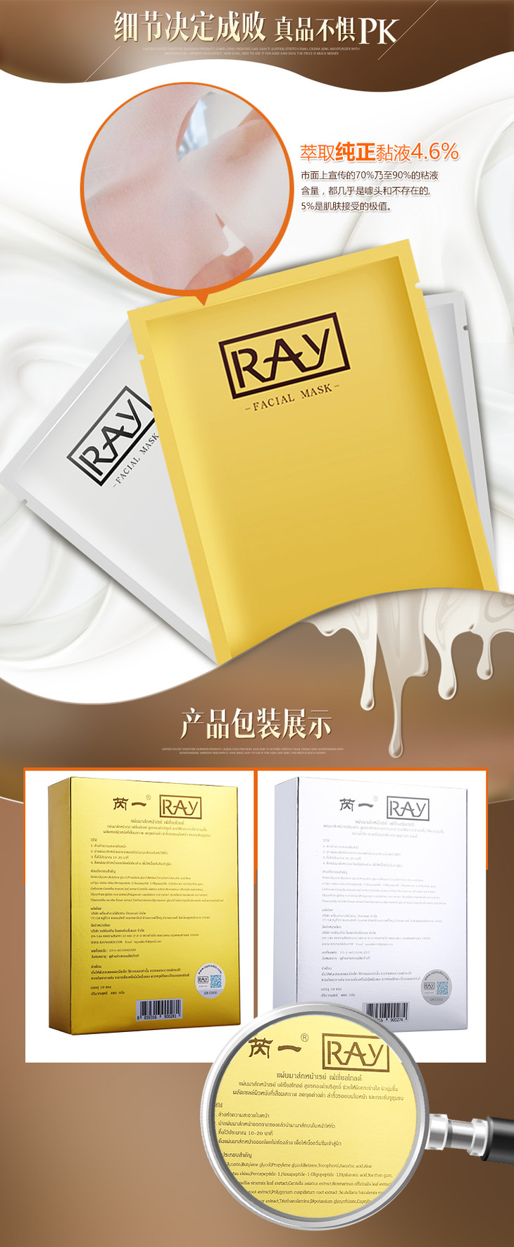芮一泰国RAY面膜官方正品补水保湿提亮肤色金银色蚕丝面膜10片装