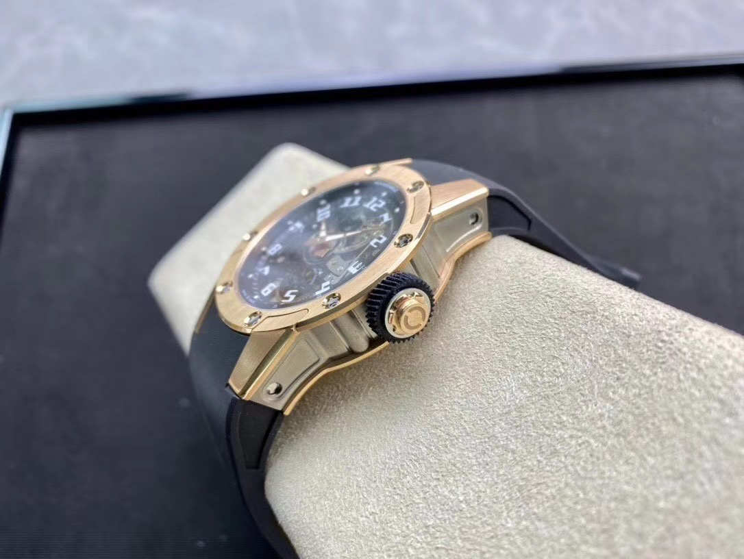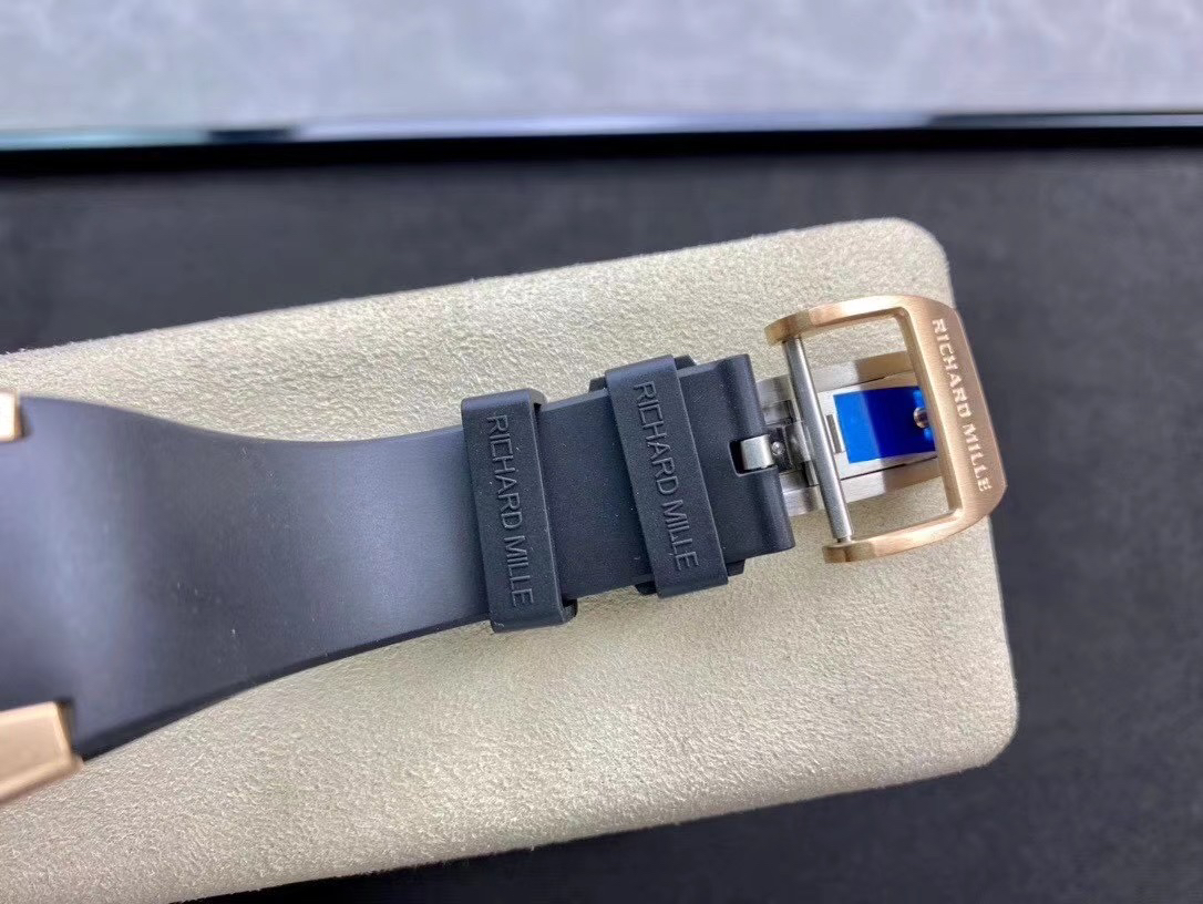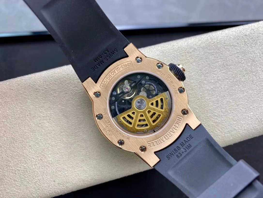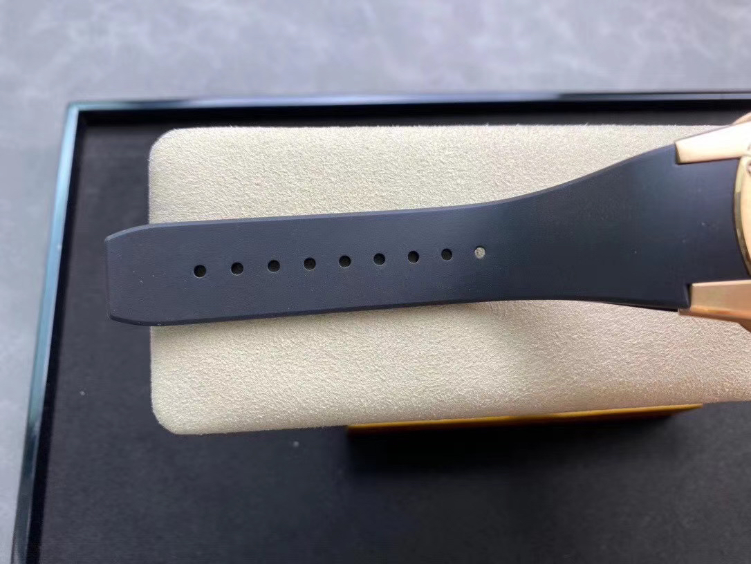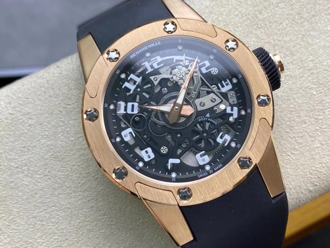 V9理查德米勒Richard Mille新款RM 63-01 Dizzy Hands男装自动机械腕表。2019年底新款,是RM手表家族中较为少见的圆形作品,同步原装尺寸直径42.7mm,厚度11.7mm。定制CRMA3全自动机械机芯,开放式字面结构几乎一致,机械感十足。四个生耳脚和原装一样可单独拆卸,表壳前后为玫瑰金色,通过8颗标志性的花键螺丝固定,缎面拉丝打磨与表耳圆润的棱角非常契合。镜面和表盘均为透明的蓝宝石水晶,字面玻璃印有12个阿拉伯数字时标,剑形时分针亦经过精细的拉丝抛光处理,并有立体的边缘细节。进口泰国原料橡胶带,做工精良,上手服帖柔和。入手理由: