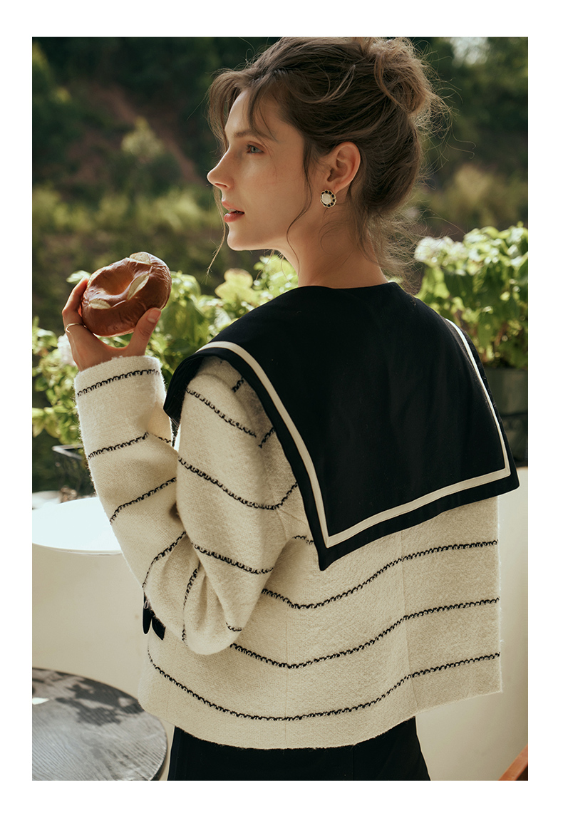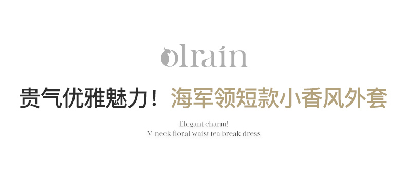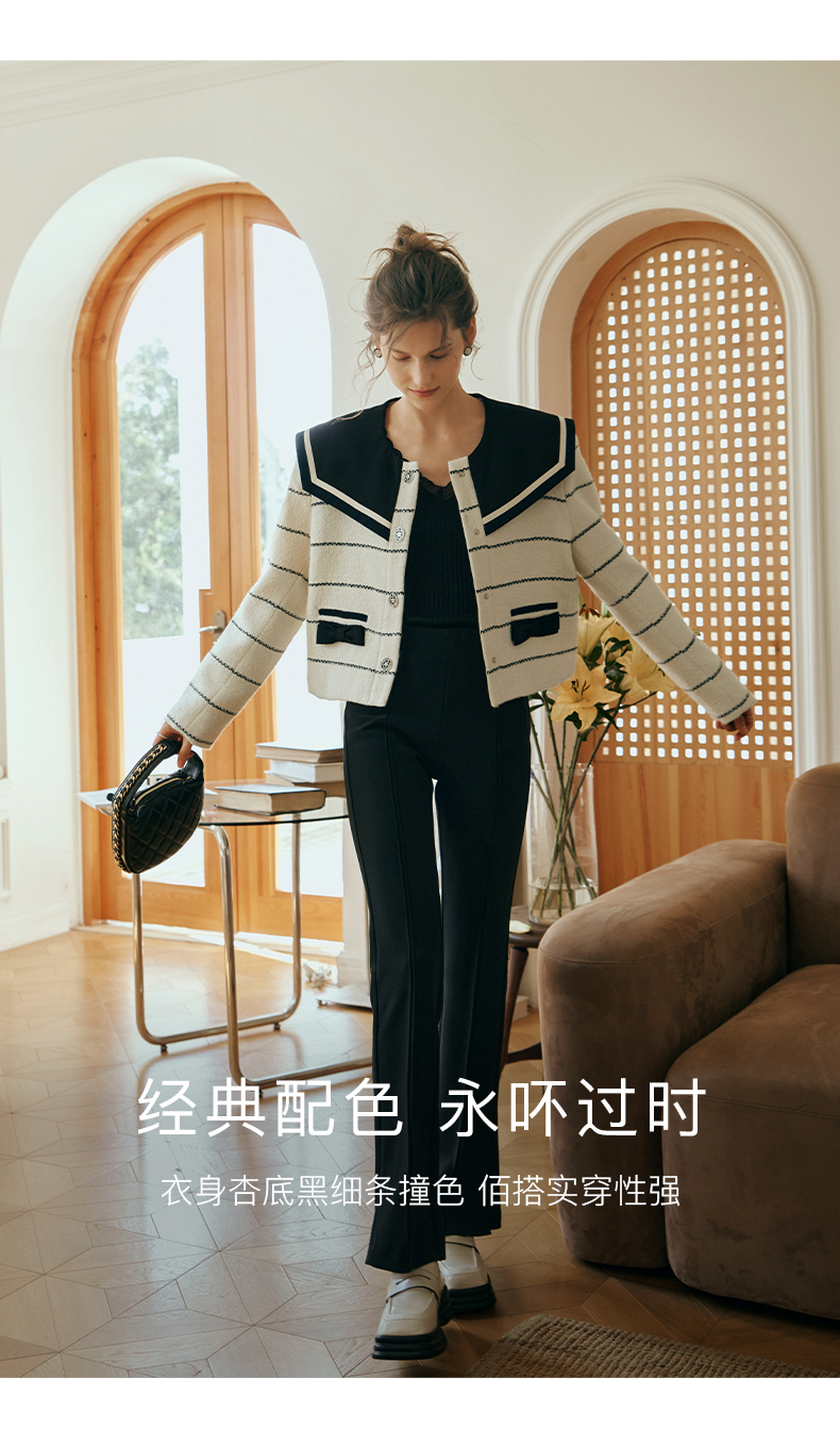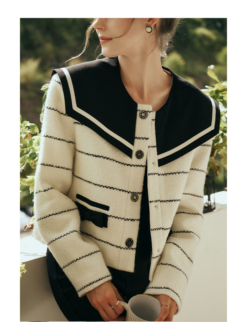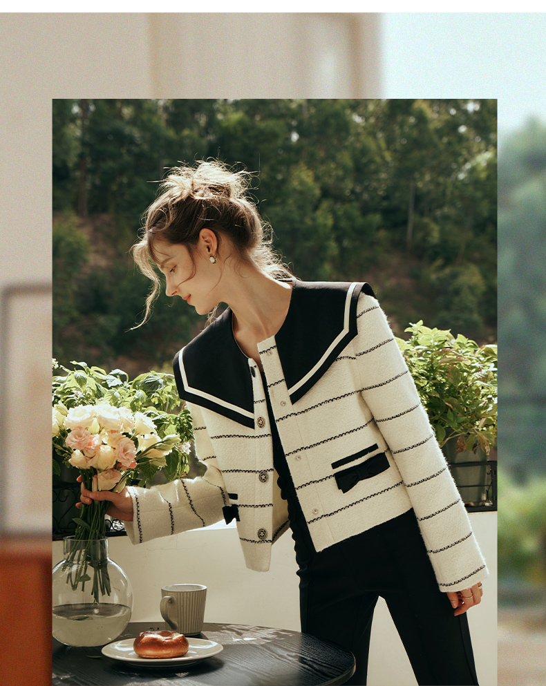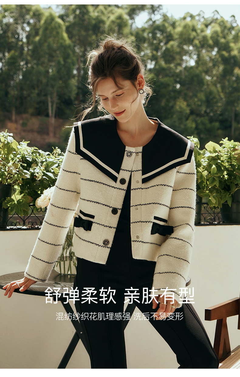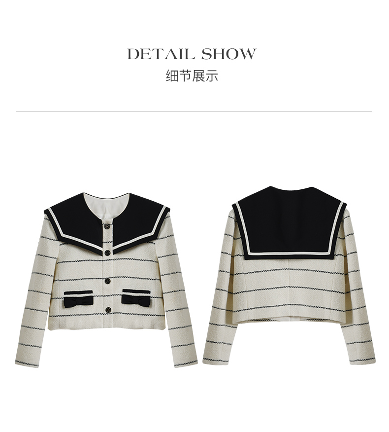 OLrain欧芮儿小香风短外套初秋2023新款减龄海军领条纹粗花呢上衣