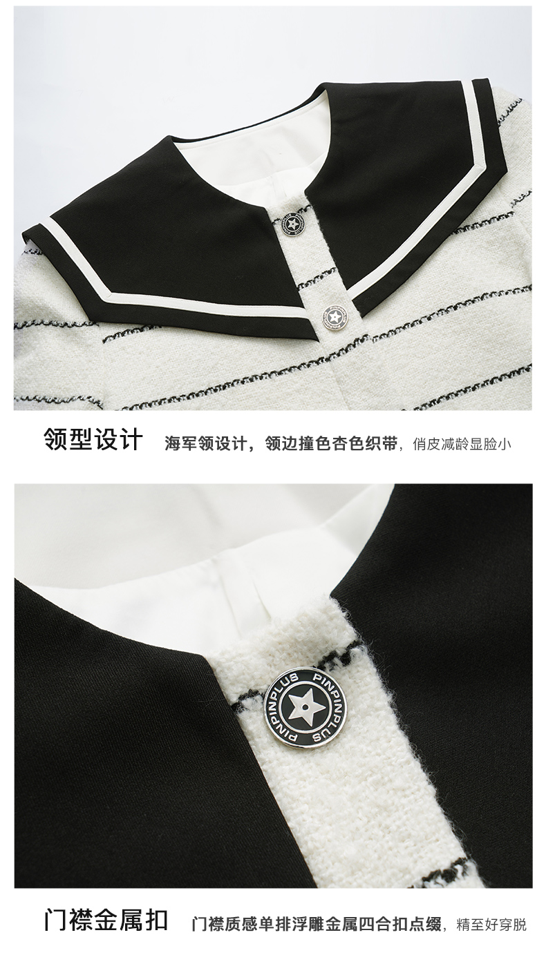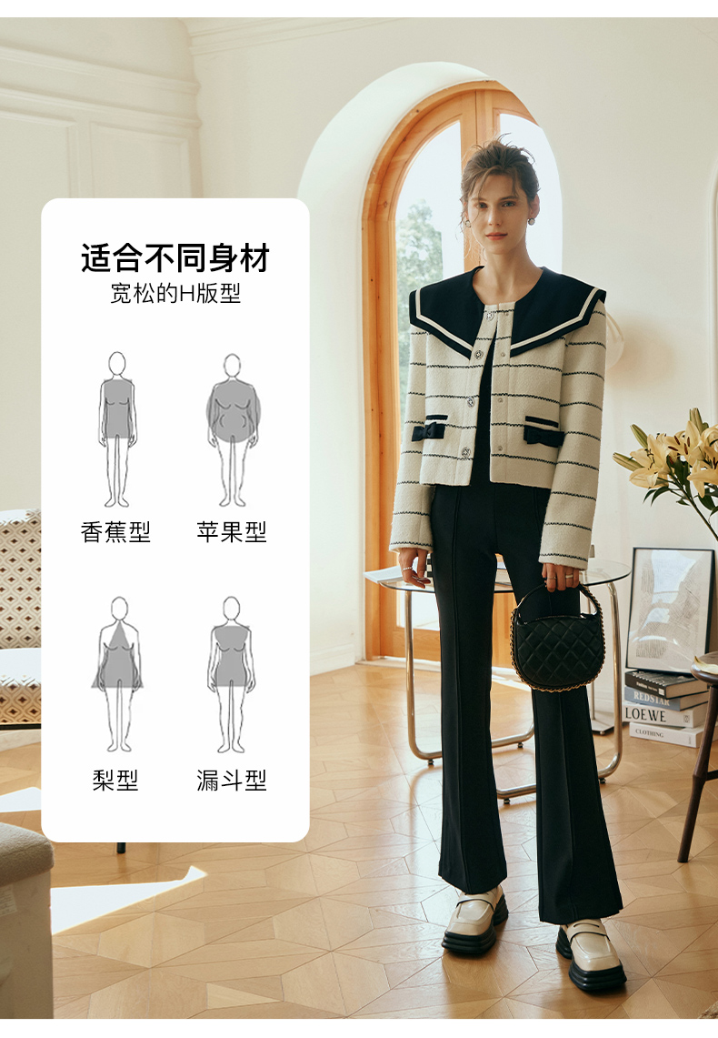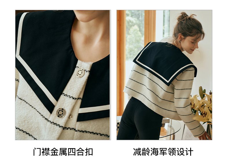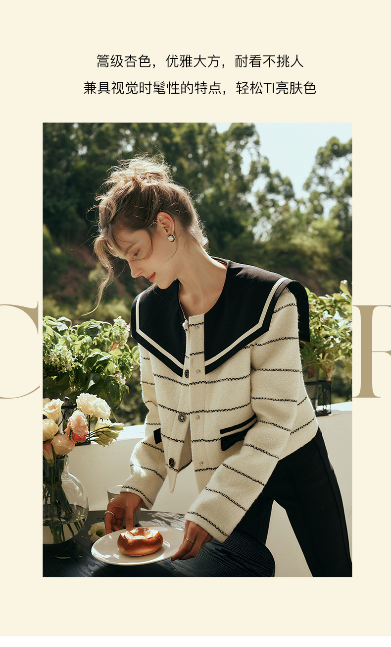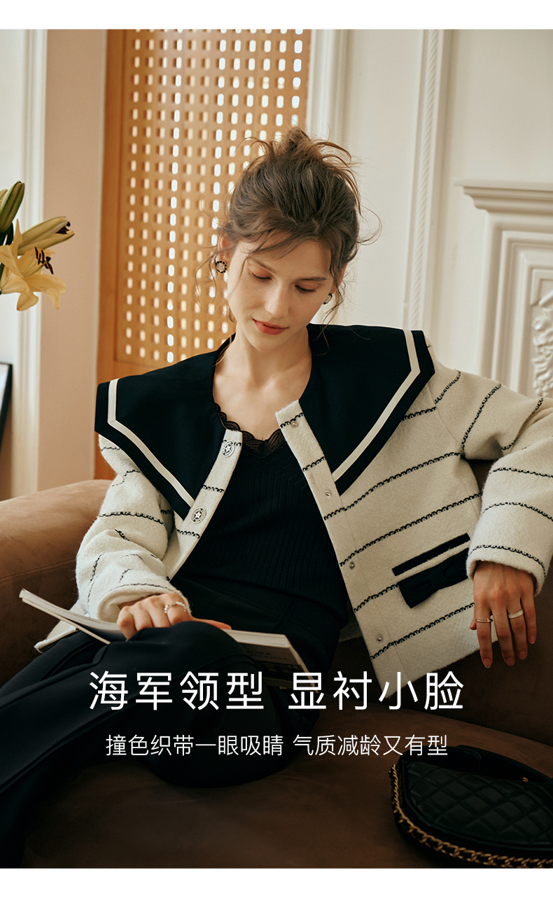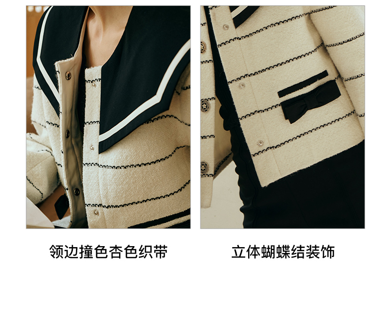 OLrain欧芮儿小香风短外套初秋2023新款减龄海军领条纹粗花呢上衣